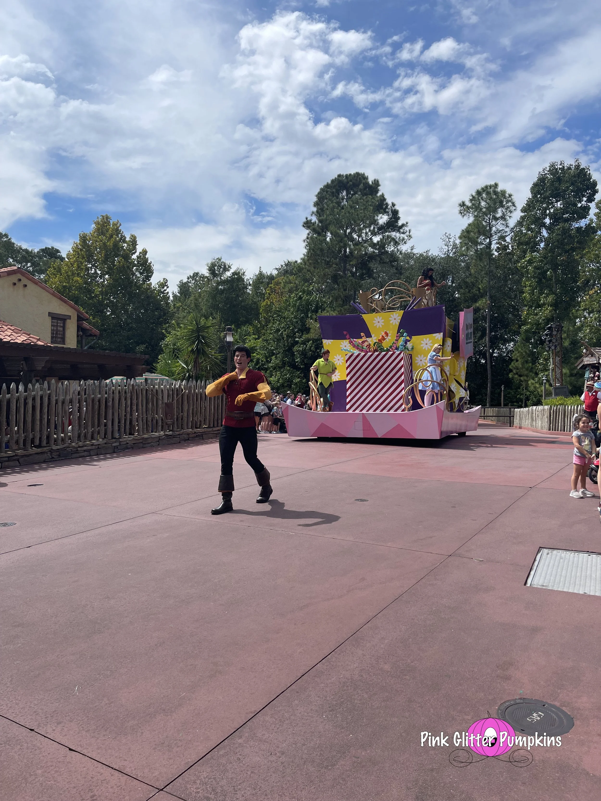 We then decided to walk over and ride Pirates. We were stopped by a quick cavalcade on the way. The posted wait was 35 minutes, but we only waited around 20 at most.