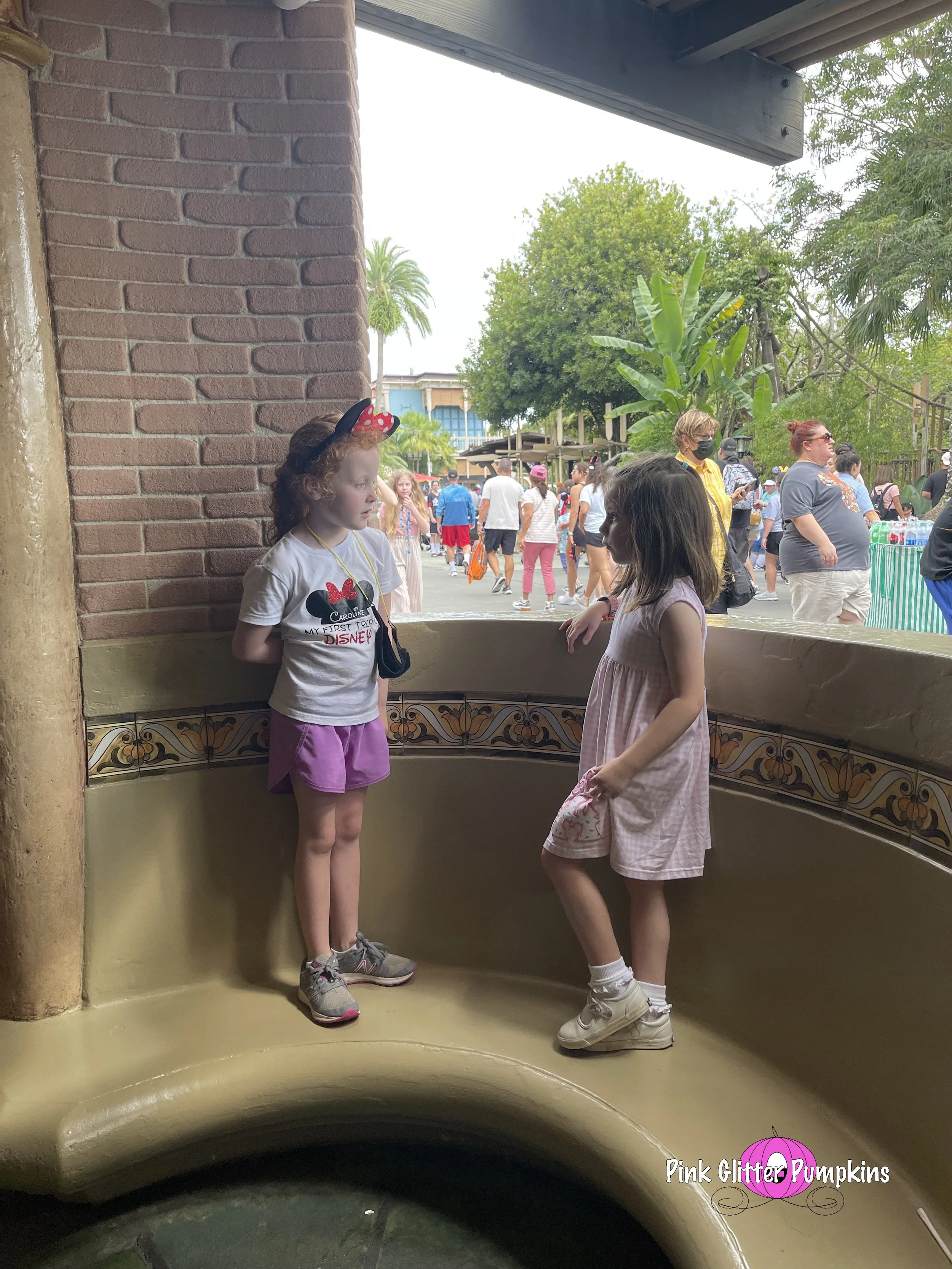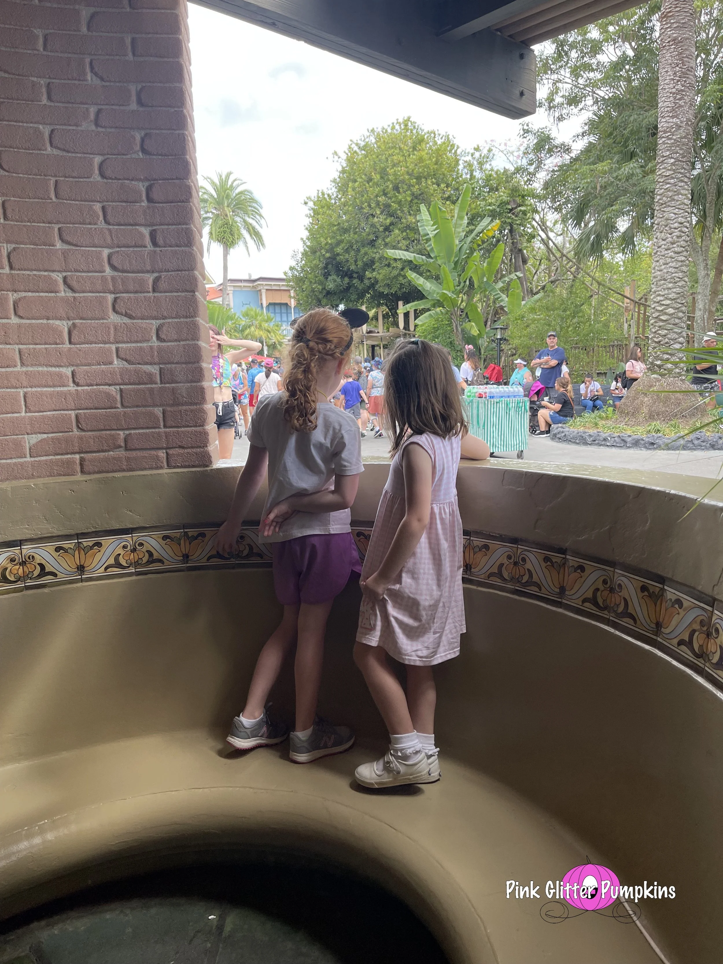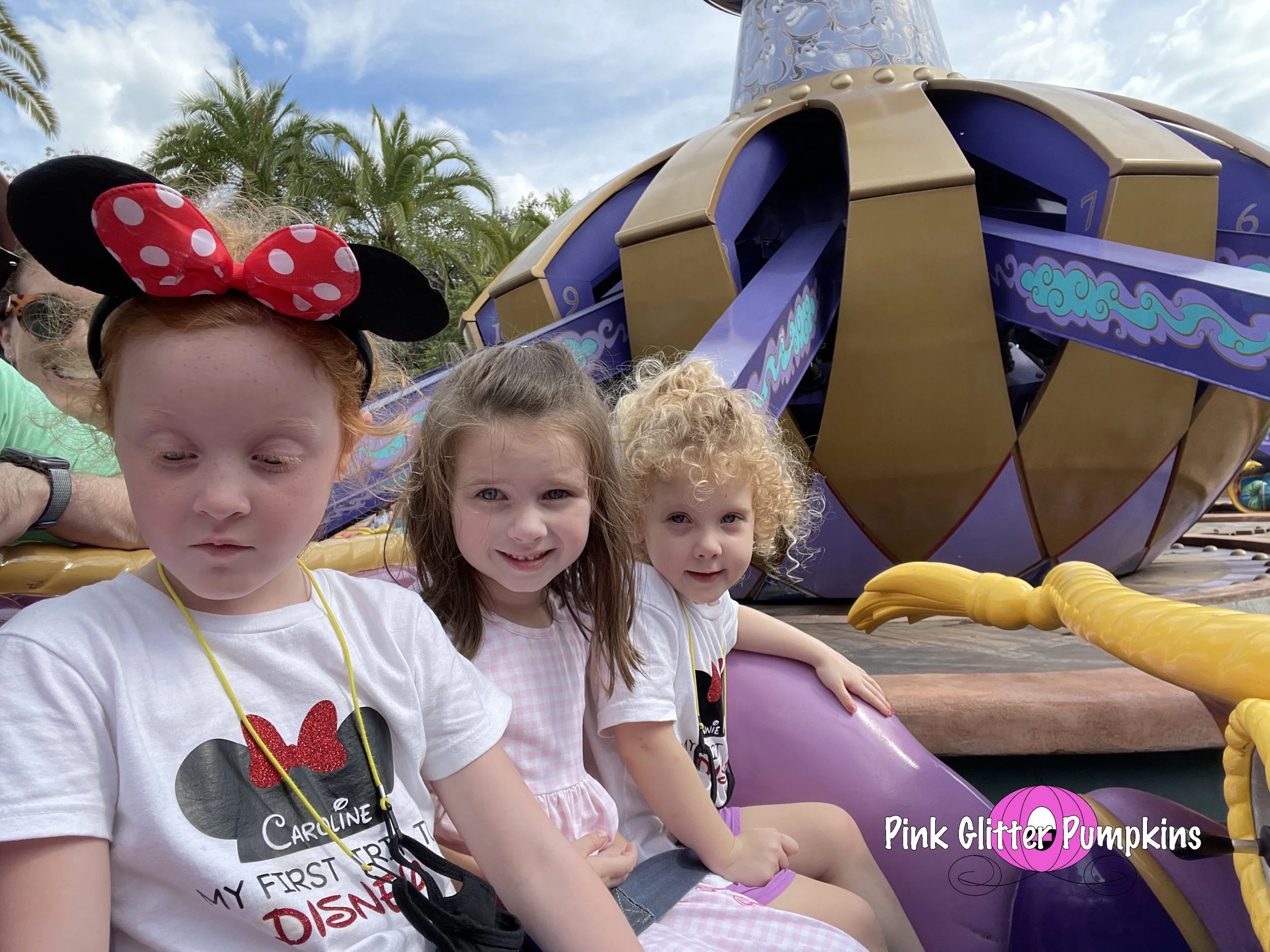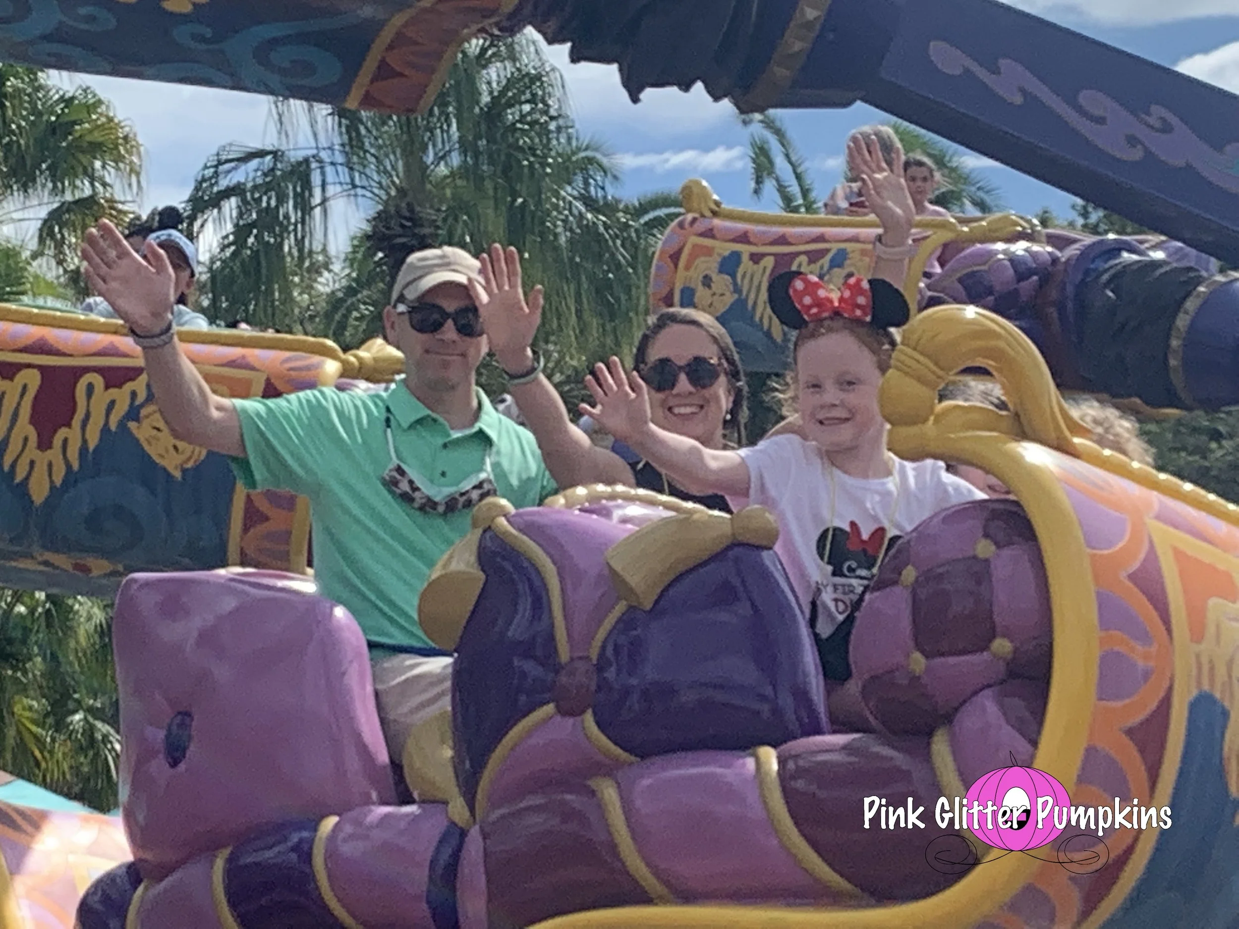 After Splash, we went and met up with Jeff (Bradβs brother), Rebekah (his wife), and our nieces Caroline and Annie Michel. They were eating Dole Whips and resting. I got all of us some and we talked for a bit. Then the kids, Rebekah, and Brad went to ride Magic Carpets of Aladdin. All three girls got to ride together and they had a blast! We hung out with them a little bit longer before heading out for the day.