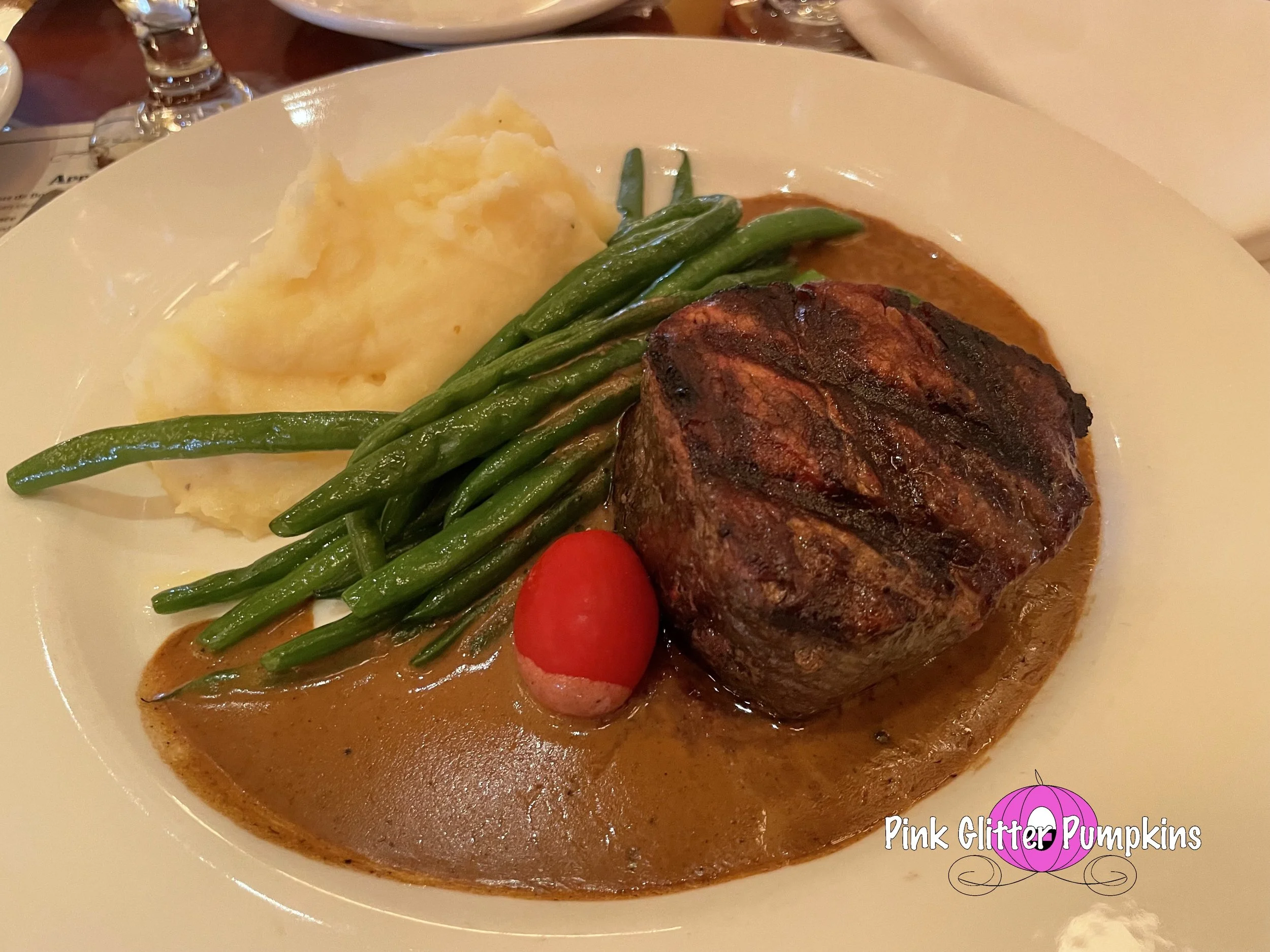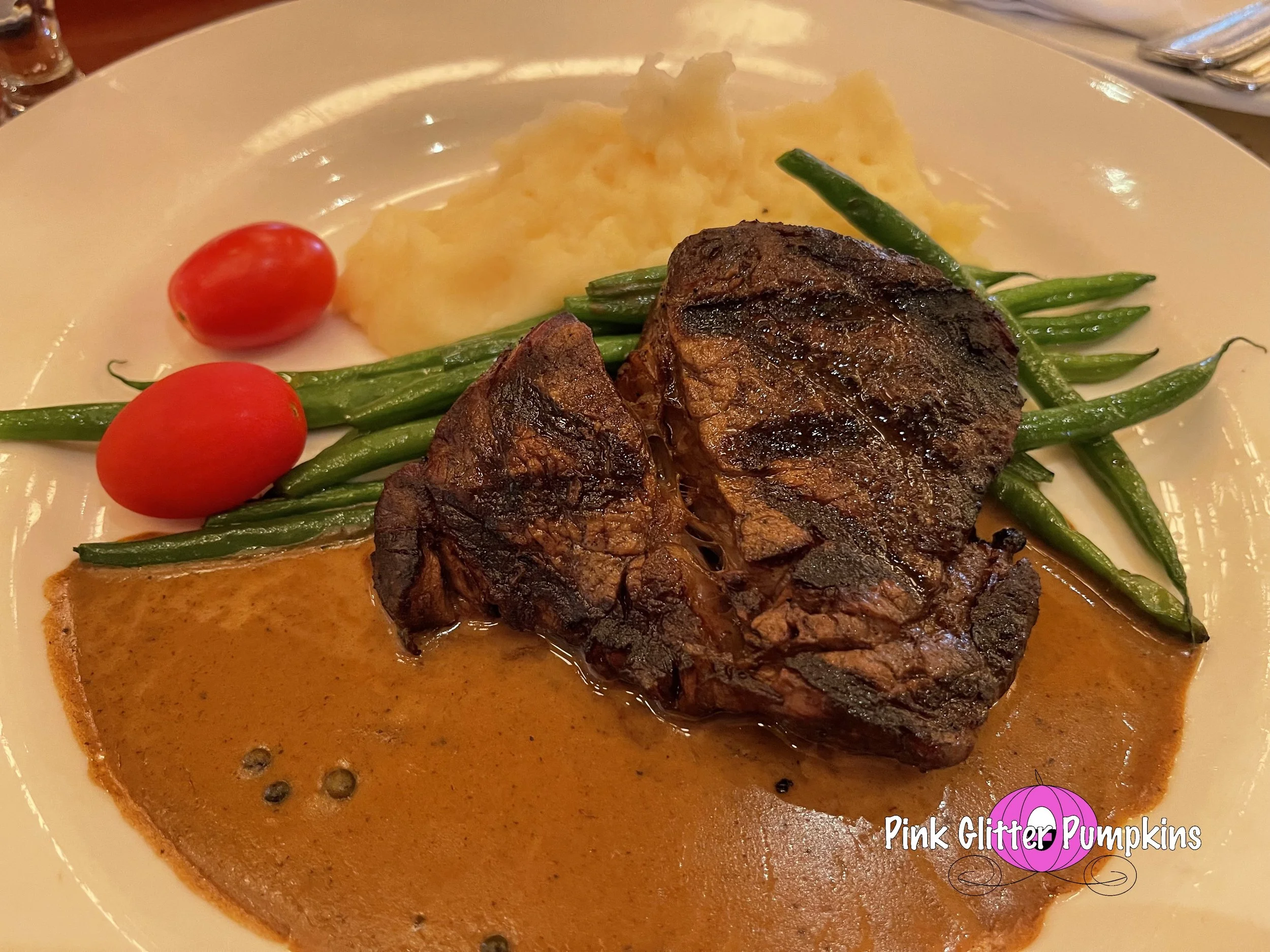 We rushed through the World Showcase to get to our dinner reservation at Chefs de France at 5:30. In the end we had plenty of time, but I hate being late. And you never know how long it will try take to get somewhere with the crowds and such. We arrived in plenty of time and were seated around 5:20. Dinner was great, as was our waiter. Our steaks were cooked perfectly and were equally delicious. Now to go back on my rant about Disney and how they are handling COVIDβ¦As we were finishing our meal, we were literally shoulder to shoulder with another table. All of us maskless eating our food. How is that ok, but I have to wear a mask while on an empty Living with the Land?? Rant over, for now.