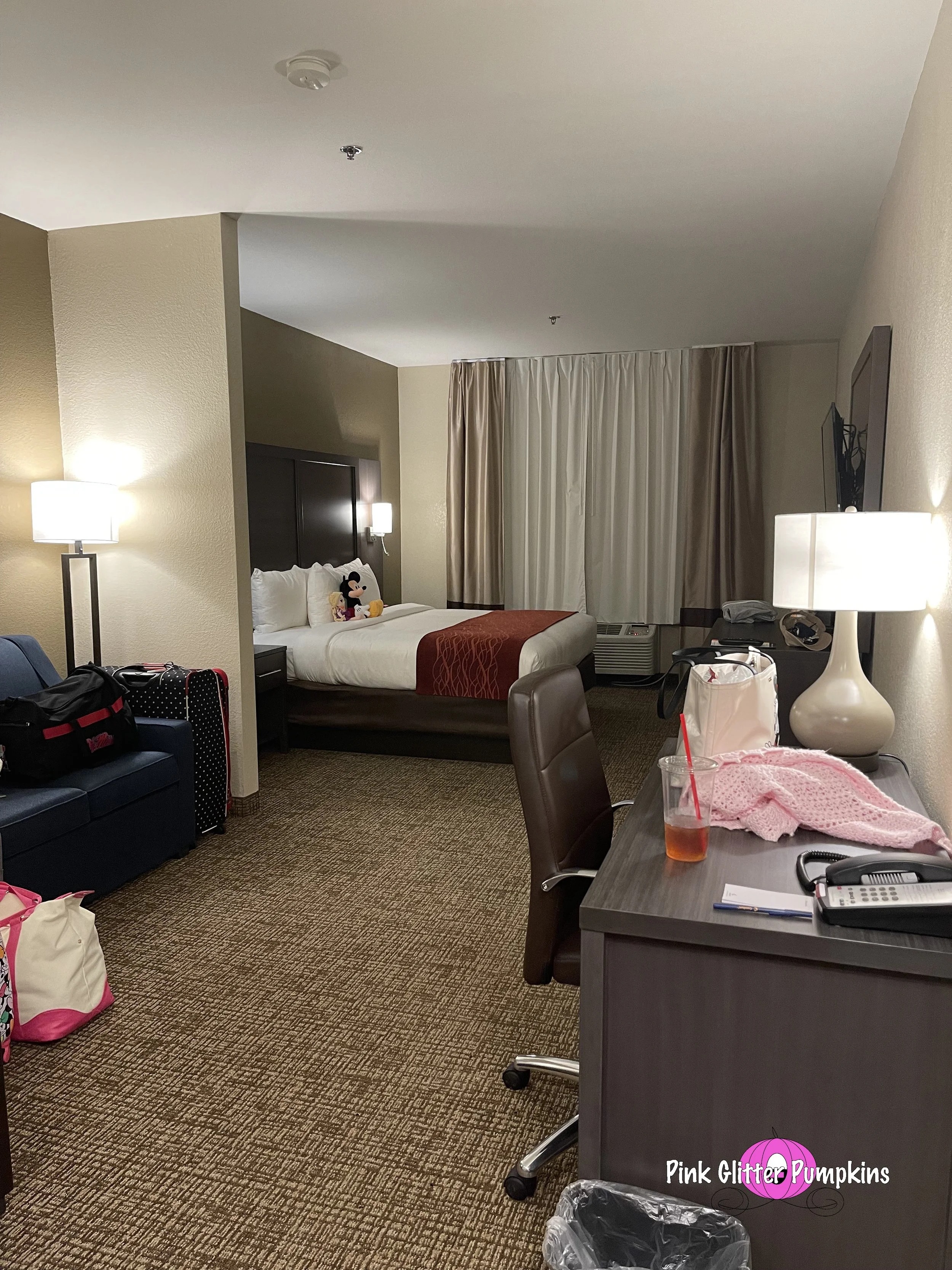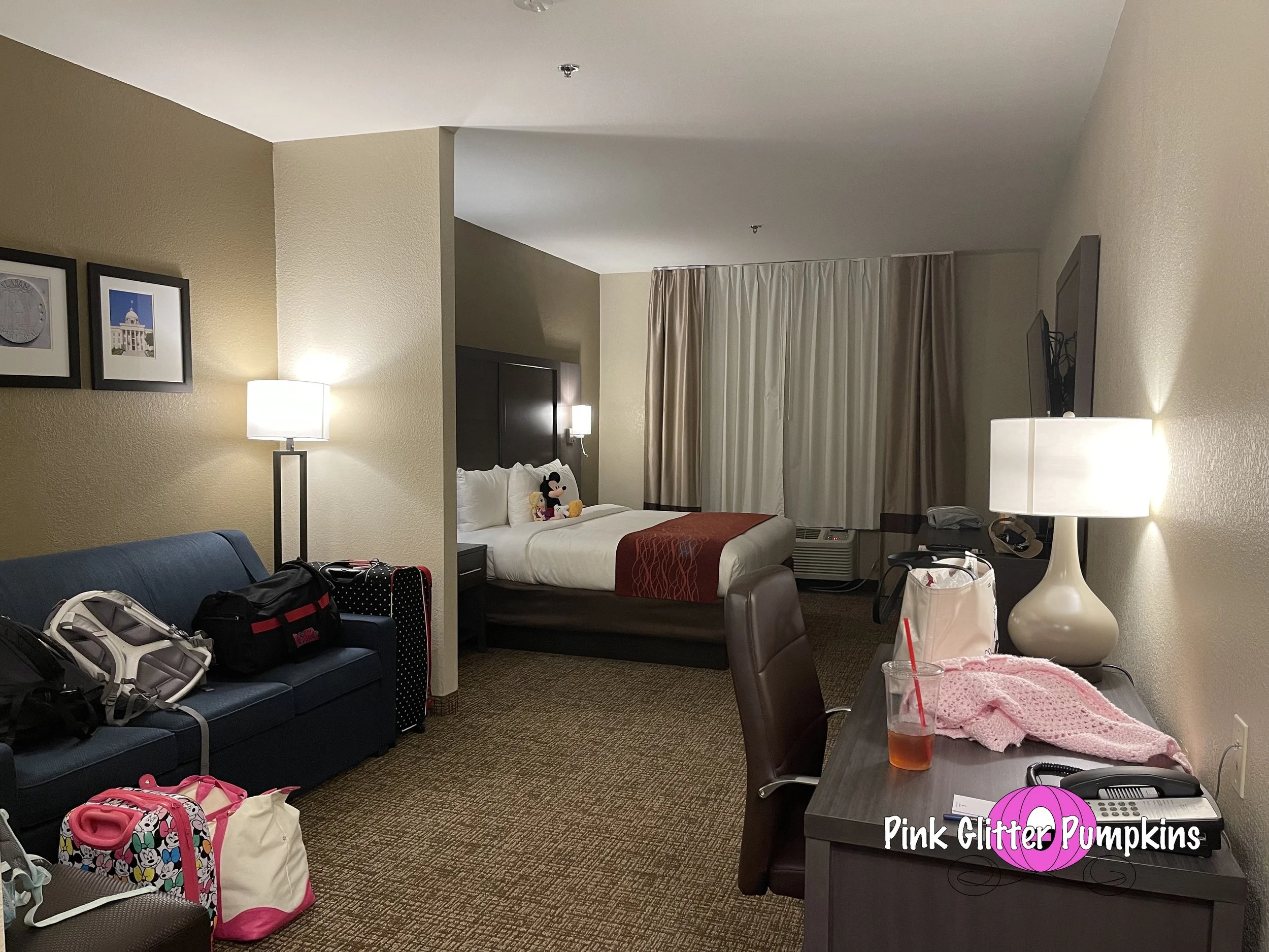 We finished up and got on the road around noon Orlando time. We were driving to Memphis because we had plans to attend the Ole Miss game that weekend. But the drive was just too much. We ended up booking a room at the Comfort Inn in Prattville, AL. Brad had points from a work trip he recently took. So it was a free stay. We did stop and get dinner on the way in however. We made it to town around 7:15 or so. After dinner, we checked into our room. It was actually a really nice hotel and a great location. I highly recommend it. It was nice having the couch even though we really did not use it other than storing our things. We brought up most of our stuff to keep from making our car a visible target. There was a nice workspace and decent sized bathroom.