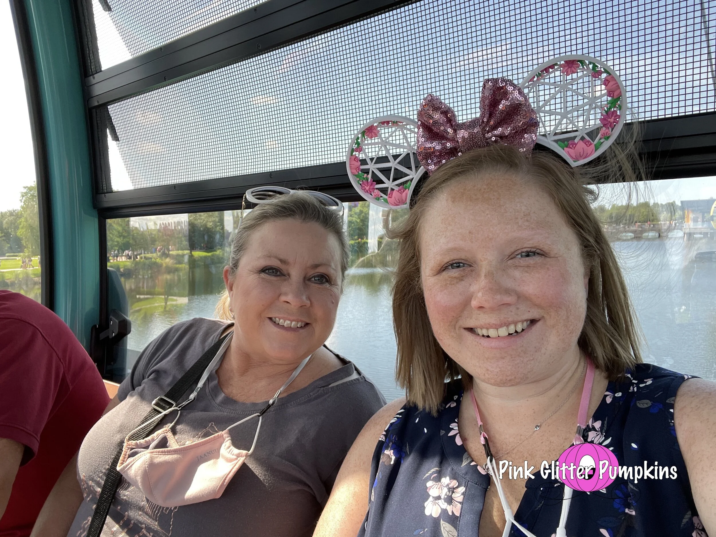 We got in line for the Skyliner around 9:20 am or so. The line was fairly backed up already at this point for people wanting to go to Epcot. Epcot opened at 11, but rumors were they actually opened closer to 10. I was hoping to be there before that point, so at one time we actually considered taking the Skyliner to Hollywood Studios and just walking to Epcot since that line was already opened. But I was afraid they were checking for park passes or something, so we chickened out. In the end, we could have done that, but we waited. The line started moving at around 9:40 or so, and we were on the Skyliner at 10 headed to Caribbean Beach Resort where we then had to hop off and get in another line to catch the Skyliner to Epcot. We had to wait at CBR for about 15 minutes or so in a line there. I really do wish we had went to Hollywood Studios and just walked looking back, but now we know.