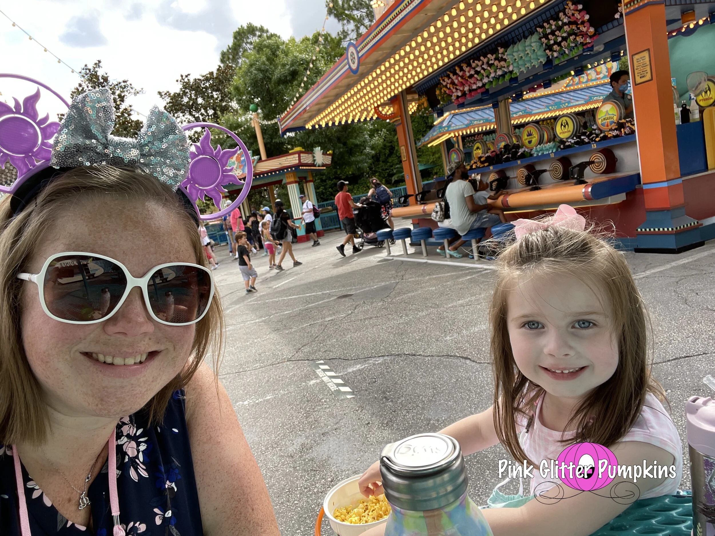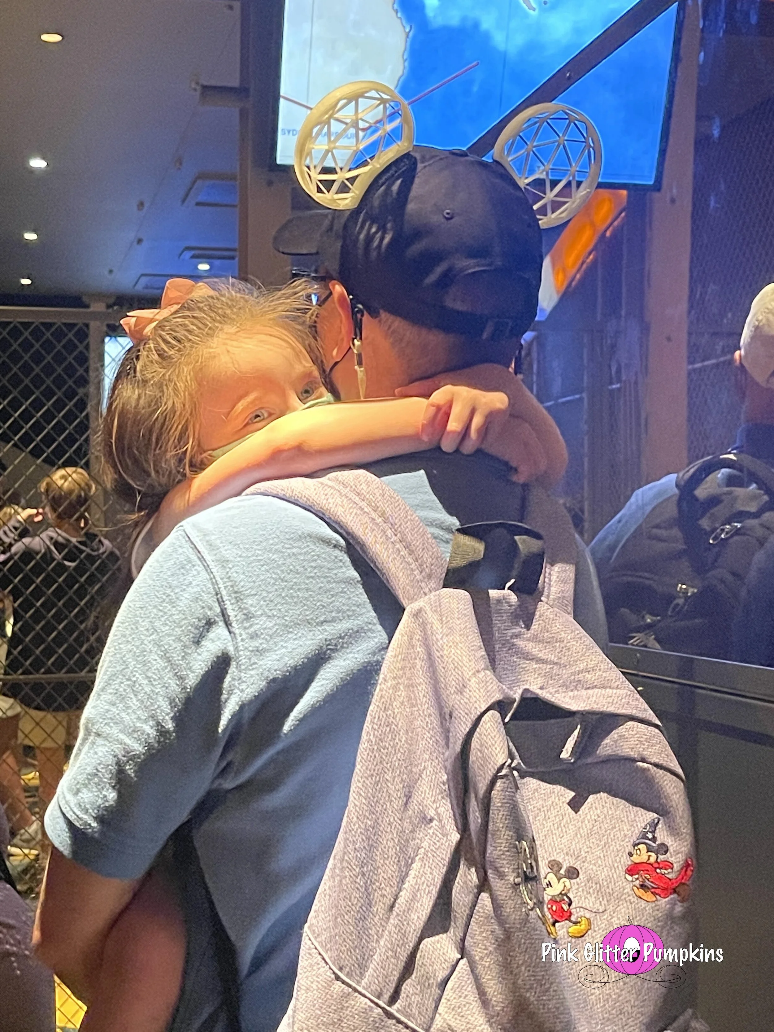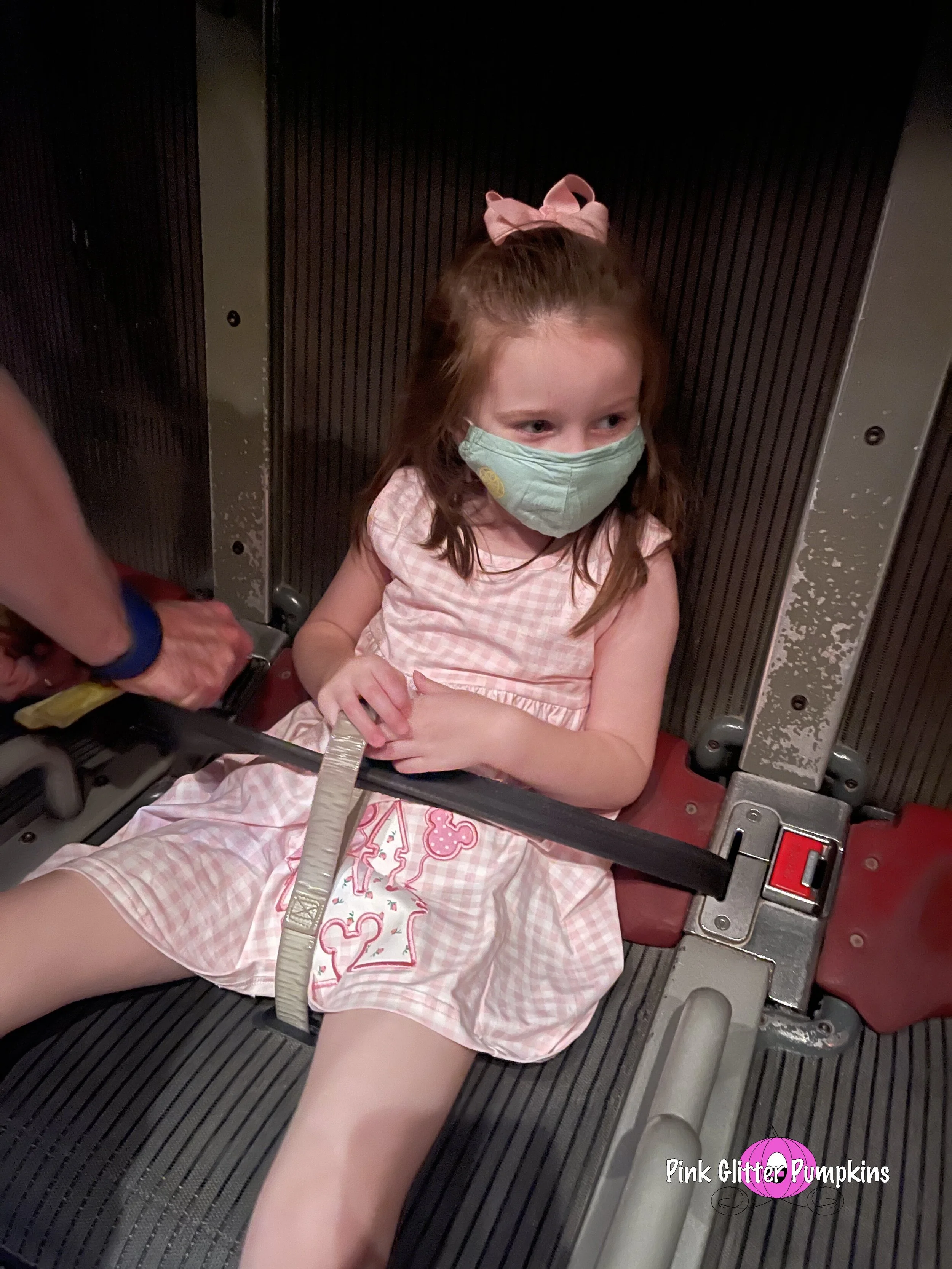 We headed straight to Soarin’. Melody was finally tall enough to ride, and we planned to leave Epcot after lunch. Not knowing if we would return that evening or not, we wanted to make sure she got to ride it first thing. We sat her between Brad and me. You can’t see in the pictures below, but they did have plexiglass between every so many seats due to COVID. So like we had plexiglass between my parents and us. The ride itself Melody said she loved. It was so funny to watch her during the ride. She kept picking up her feet during each transition, ha. As far as the wait goes, I think it said a 50 minute wait, and we waited 35.