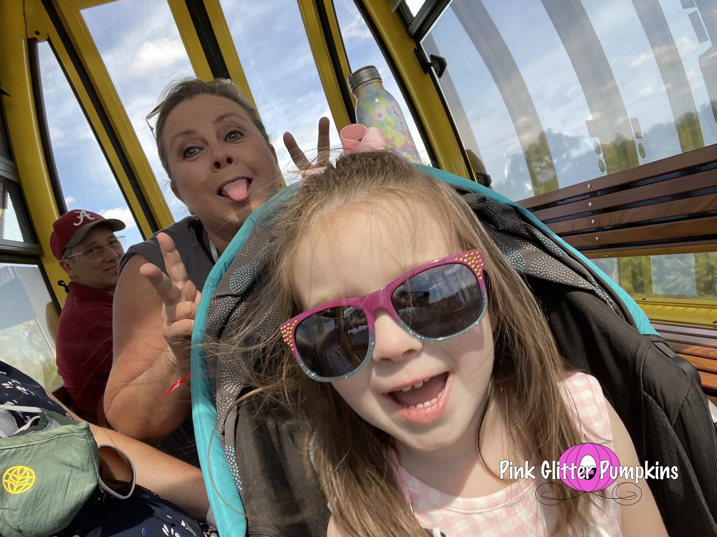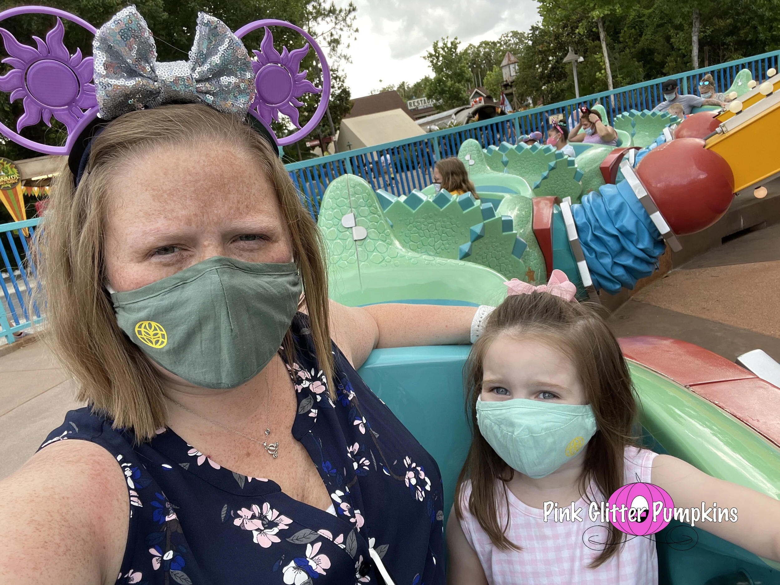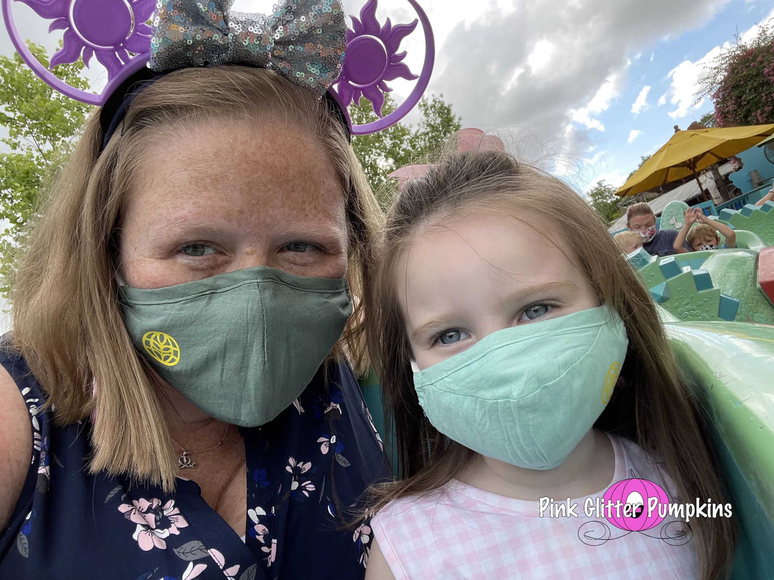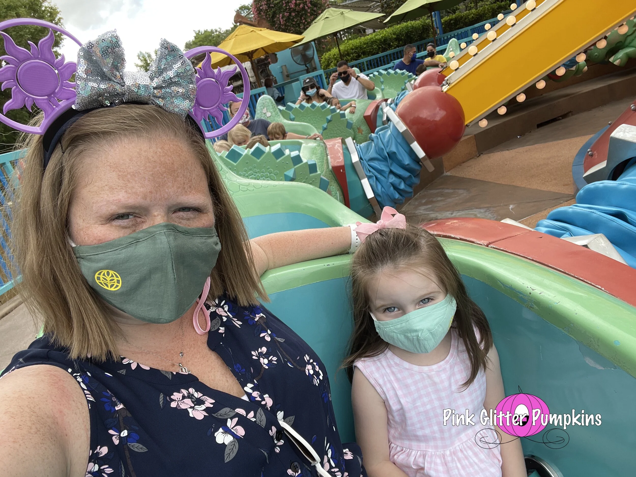 We headed straight to Soarin’. Melody was finally tall enough to ride, and we planned to leave Epcot after lunch. Not knowing if we would return that evening or not, we wanted to make sure she got to ride it first thing. We sat her between Brad and me. You can’t see in the pictures below, but they did have plexiglass between every so many seats due to COVID. So like we had plexiglass between my parents and us. The ride itself Melody said she loved. It was so funny to watch her during the ride. She kept picking up her feet during each transition, ha. As far as the wait goes, I think it said a 50 minute wait, and we waited 35.