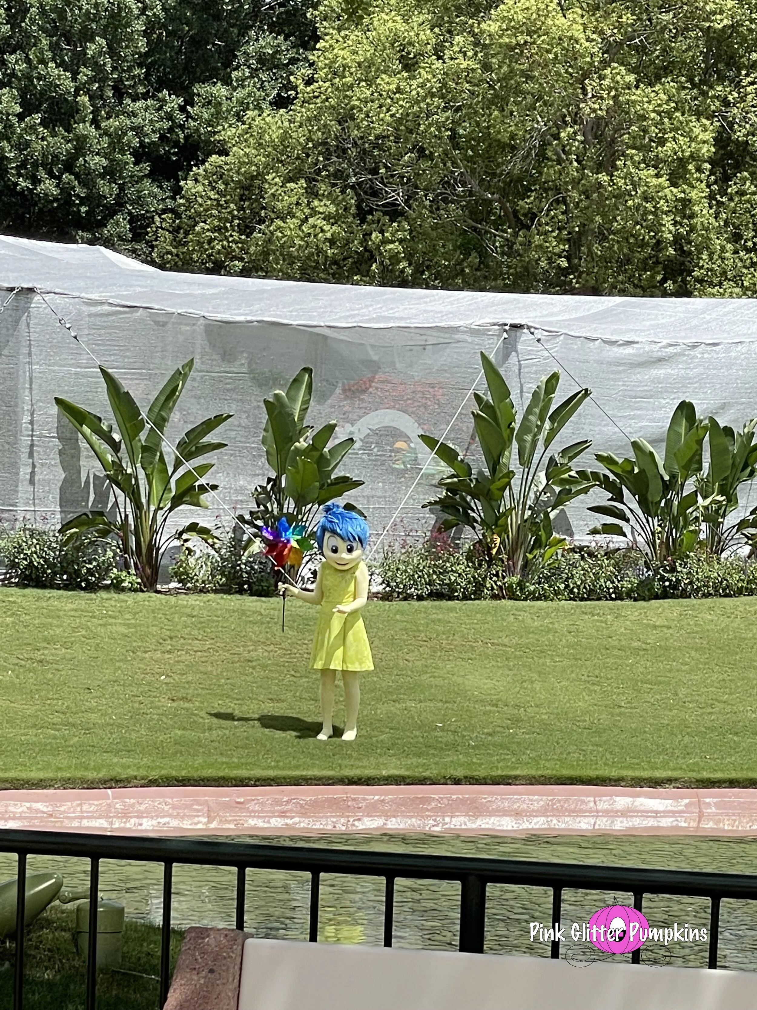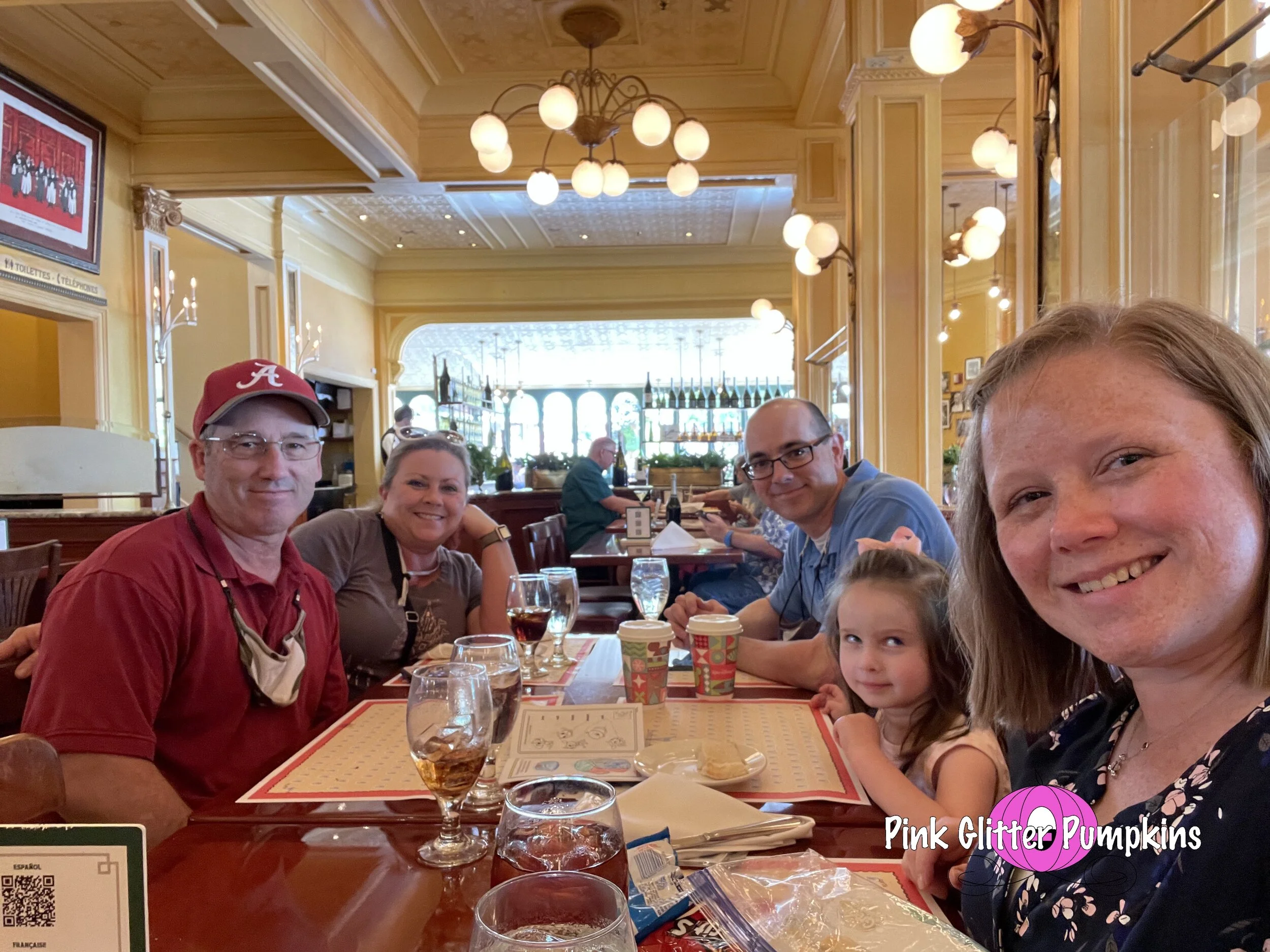Next up we had planned to go to The Seas with Nemo and Friends, but it had like a 45 minute wait. While I was certain the wait was not that long, we did not want to get stuck in that line and miss our lunch reservation. We only had about one hour before we had to be in France, so it wasn’t practical. Instead we headed to Journey into the Imagination with Figment. We waited about 15 minutes, but we caught a glimpse of Joy from Inside Out. With Melody’s fear of characters, I actually enjoyed getting to see them this way.