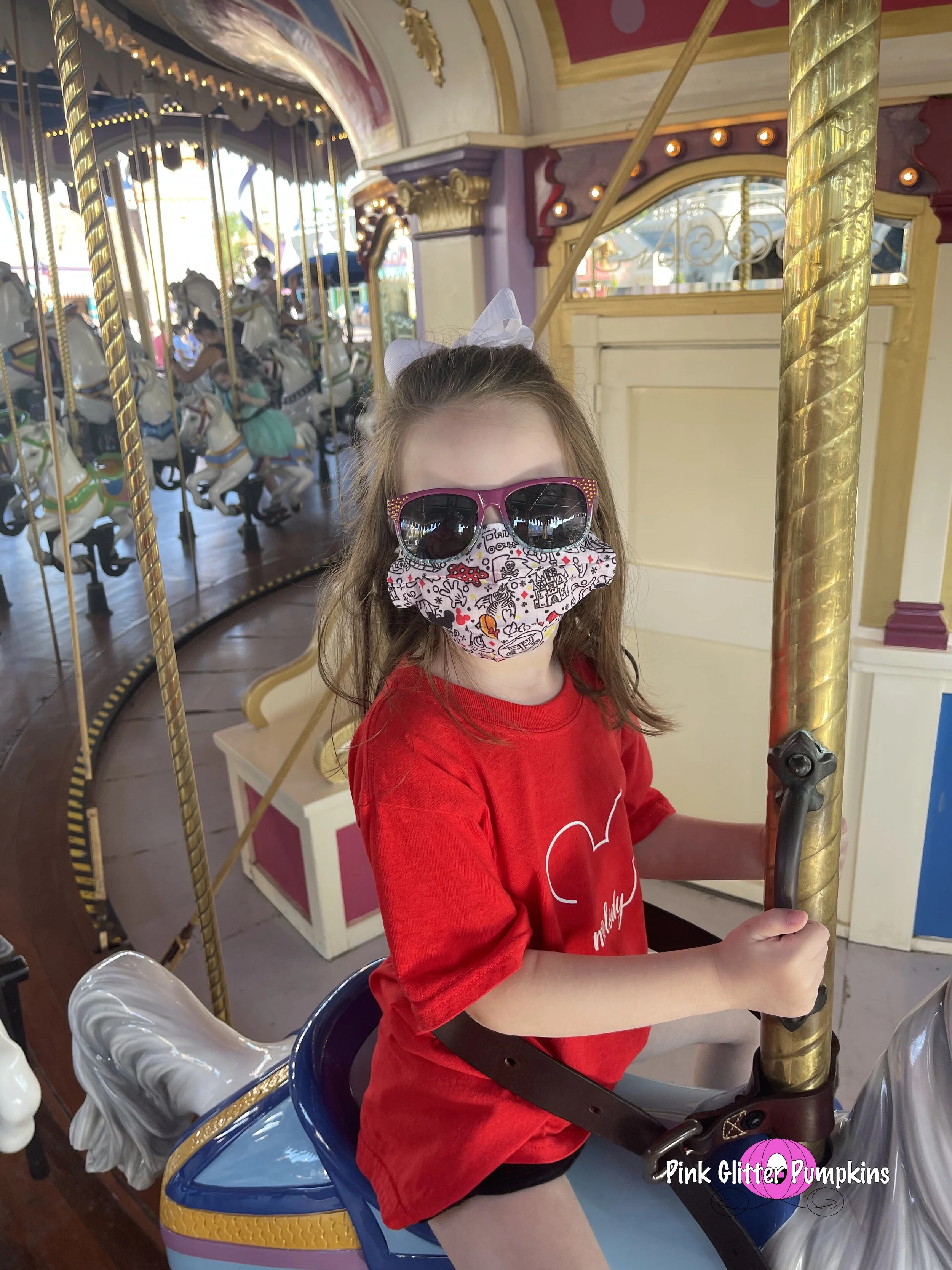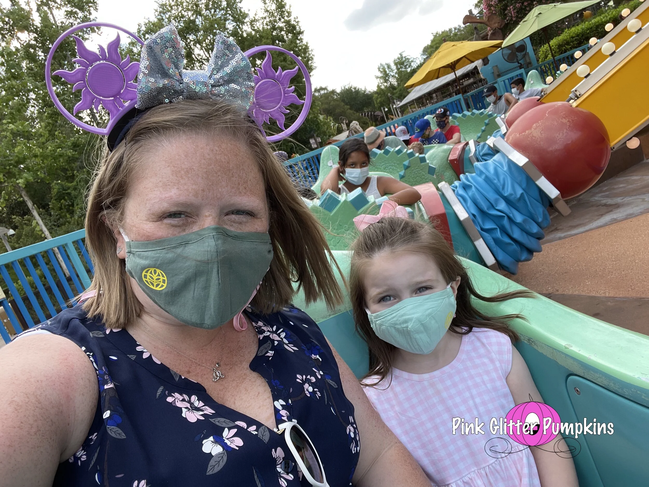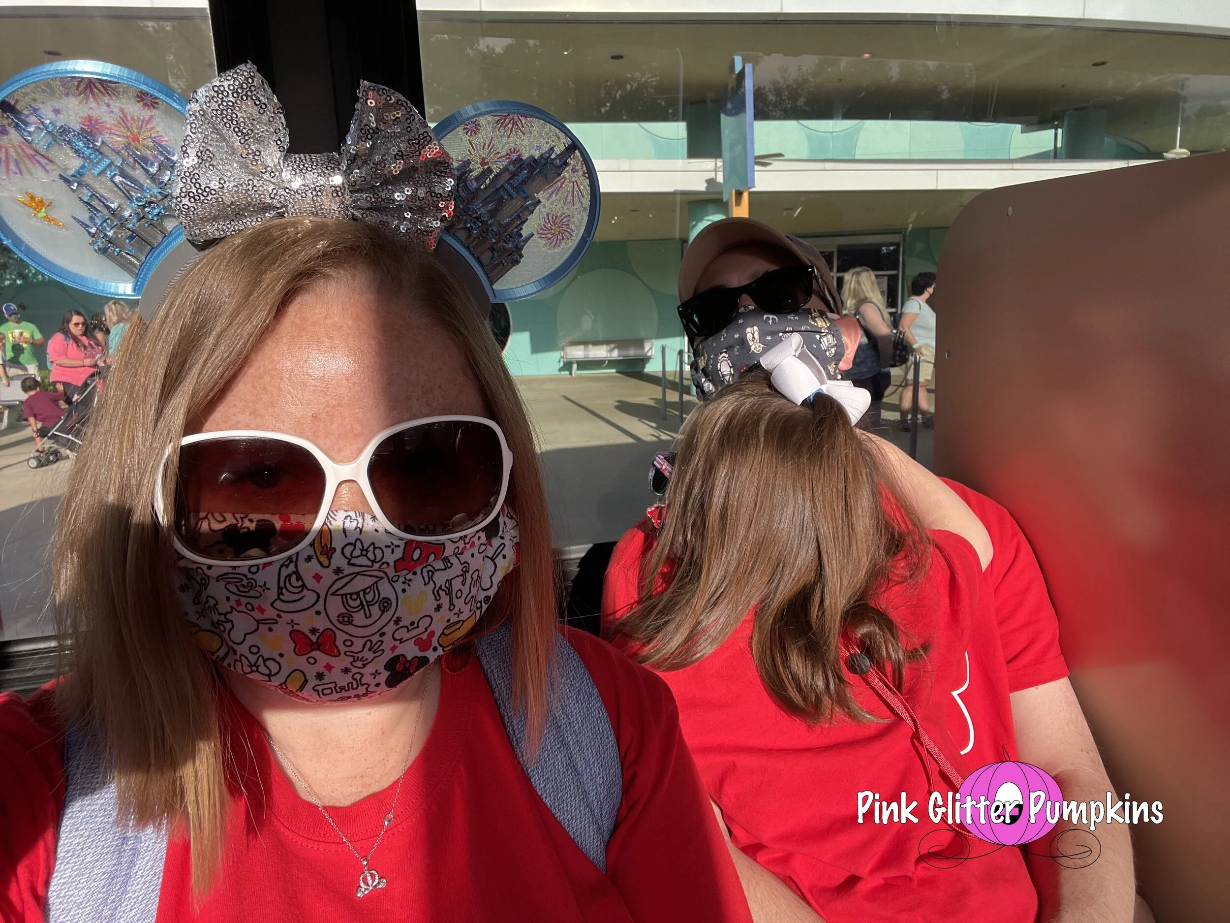 So we were fully expected to wear masks all the time except for the limited exceptions to the rule. But a few days before, the rules changed. We no longer had to wear masks outdoors (expect when in a line or on a ride). After experiencing Disney even with our masks on for just the ride, I could not imagine wearing them all the time. I had a variety of masks including paper ones. We also had plenty of matching ones for pictures on rides. Because the rule was so new, it was still uncertain how it was entirely going to be enforced. For instance, if the queue goes outside of the building, do you put it on then, or when you enter the building? Our question was answered as there are Castmembers standing at the points where you need to put your mask on. Basically when you enter the “official” start of the line, it goes on. So if the line (due to social distancing) is outside too, you can leave it off. By the end of our trip, the Castmembers started holding signs so they did not have to constantly tell people to put it on.