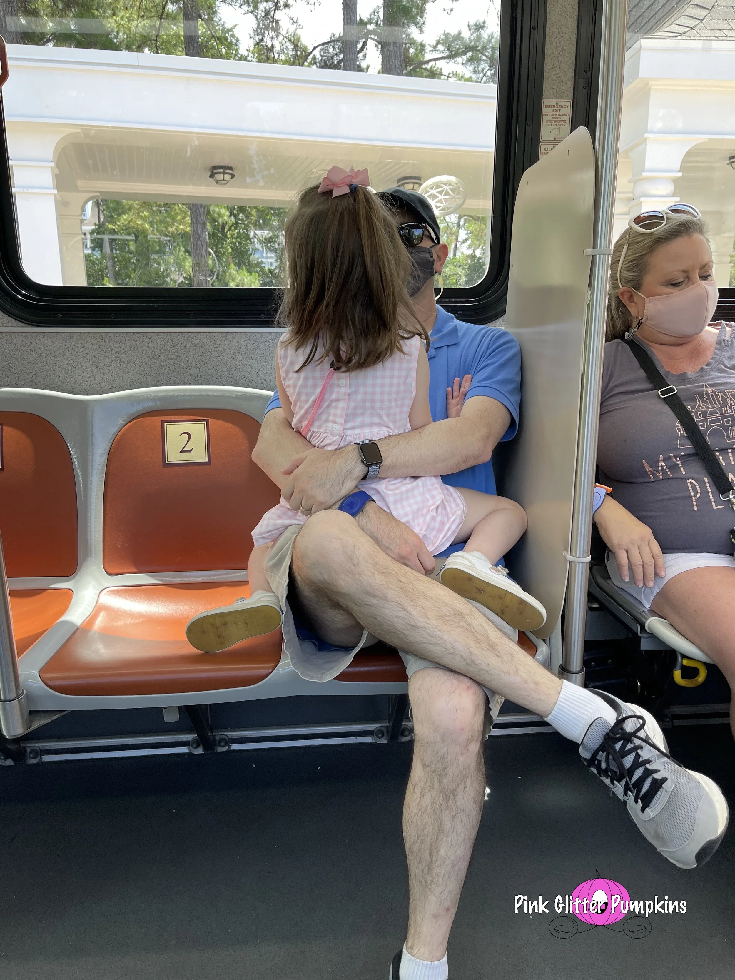 However, our luck wasn’t with us on our second morning. Magic Kingdom opened at 9, but we knew it would likely actually open around 8. I heard people would line up as early as 6:15, but we had to have breakfast. When we got in line at 7:30, and the line was INSANE. This is one of the many places I just can’t understand Disney’s logic. They have you line up in these extremely long lines (maskless if you desire); most people are not social distancing; and then when you get to the bus, they space you out. It just doesn’t make any sense. But I also know that has all changed, so maybe the waits are much better. We waited 40 minutes to finally get a bus. There was a guy telling you where to sit on the bus to allow for social distancing. We were polite and let Melody sit in our lap to allow for extra people to get on the bus.