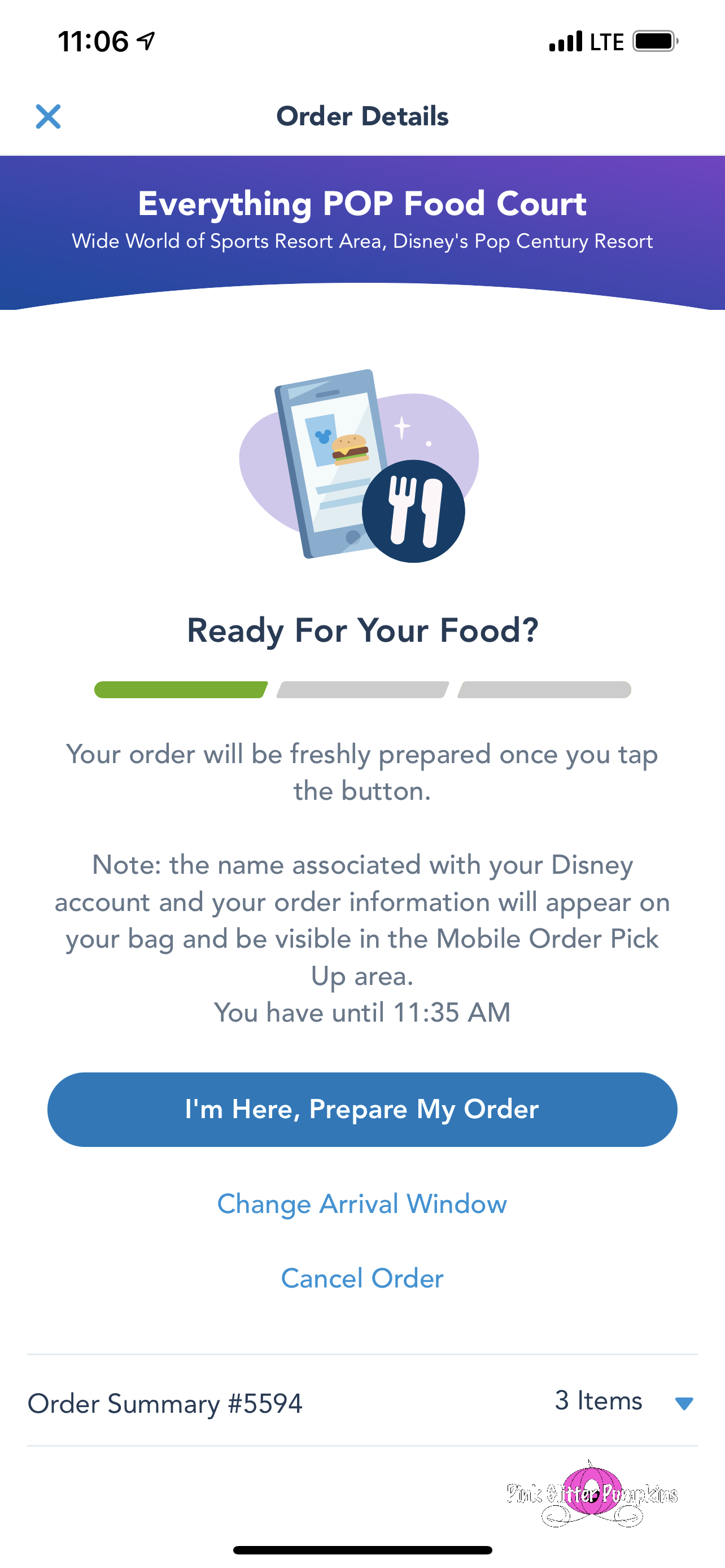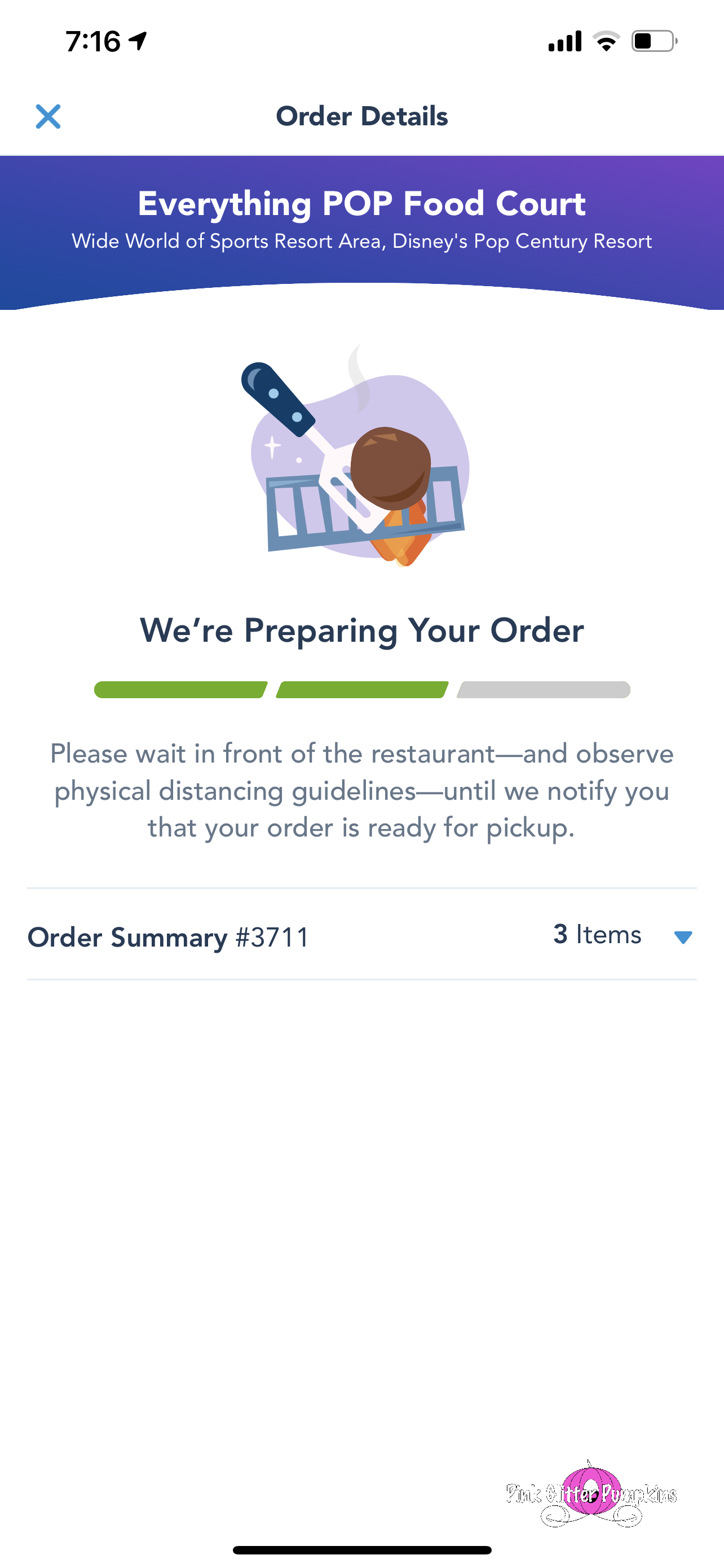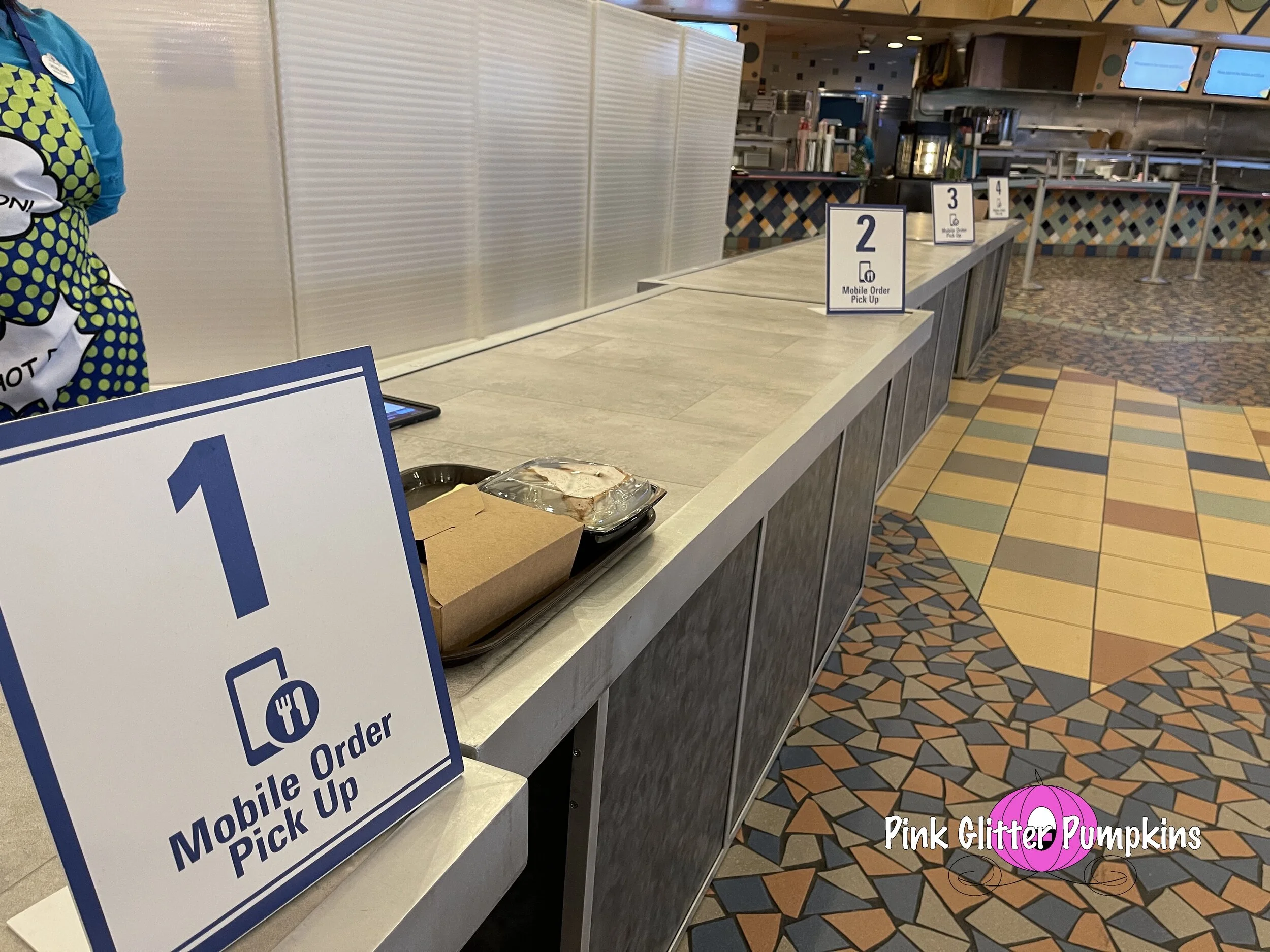 Once you have the purple screen that says your order is ready, head to the food court ENTRANCE. You will find this in the lobby of the hotel. Look for signs that point to mobile order vs shopping. This was on the right side for us during our stay.