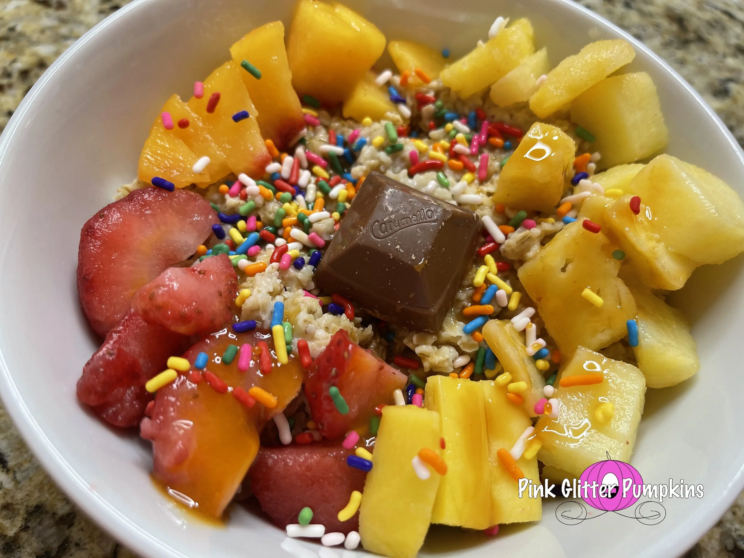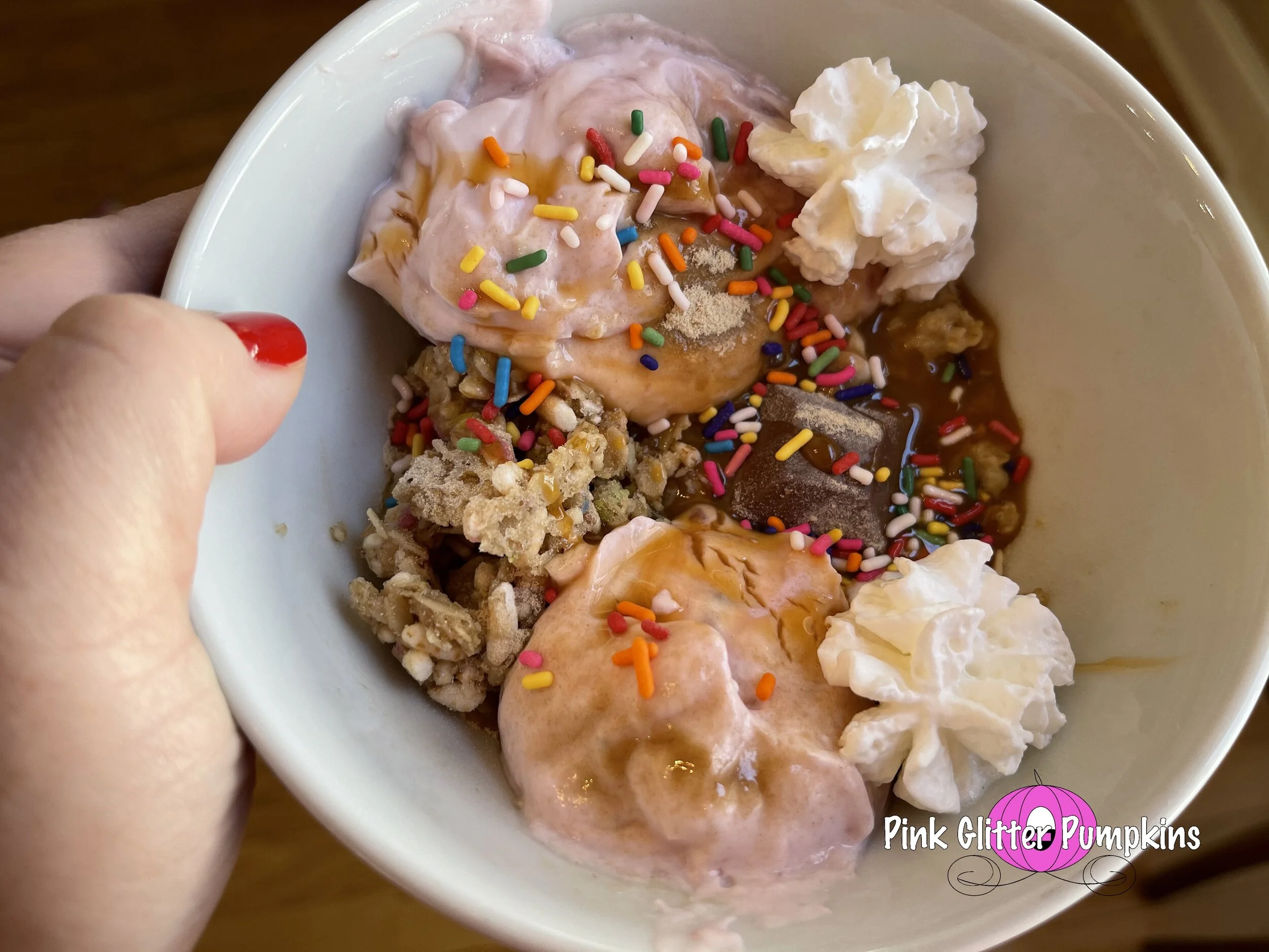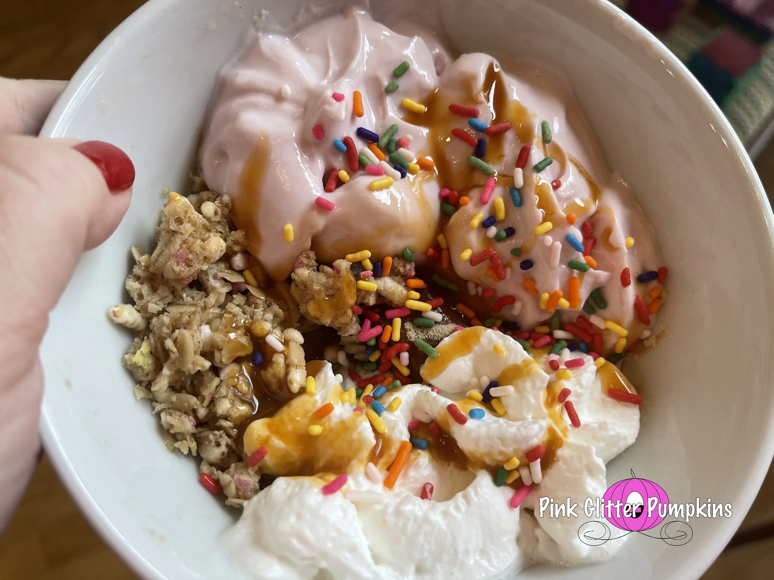 So here are some of my fruity options. I used frozen fruit that I microwaved for about 5 seconds to thaw some. I also topped with sprinkles, granola (birthday cake flavor), caramel, peanut butter, and a chocolate candy.
