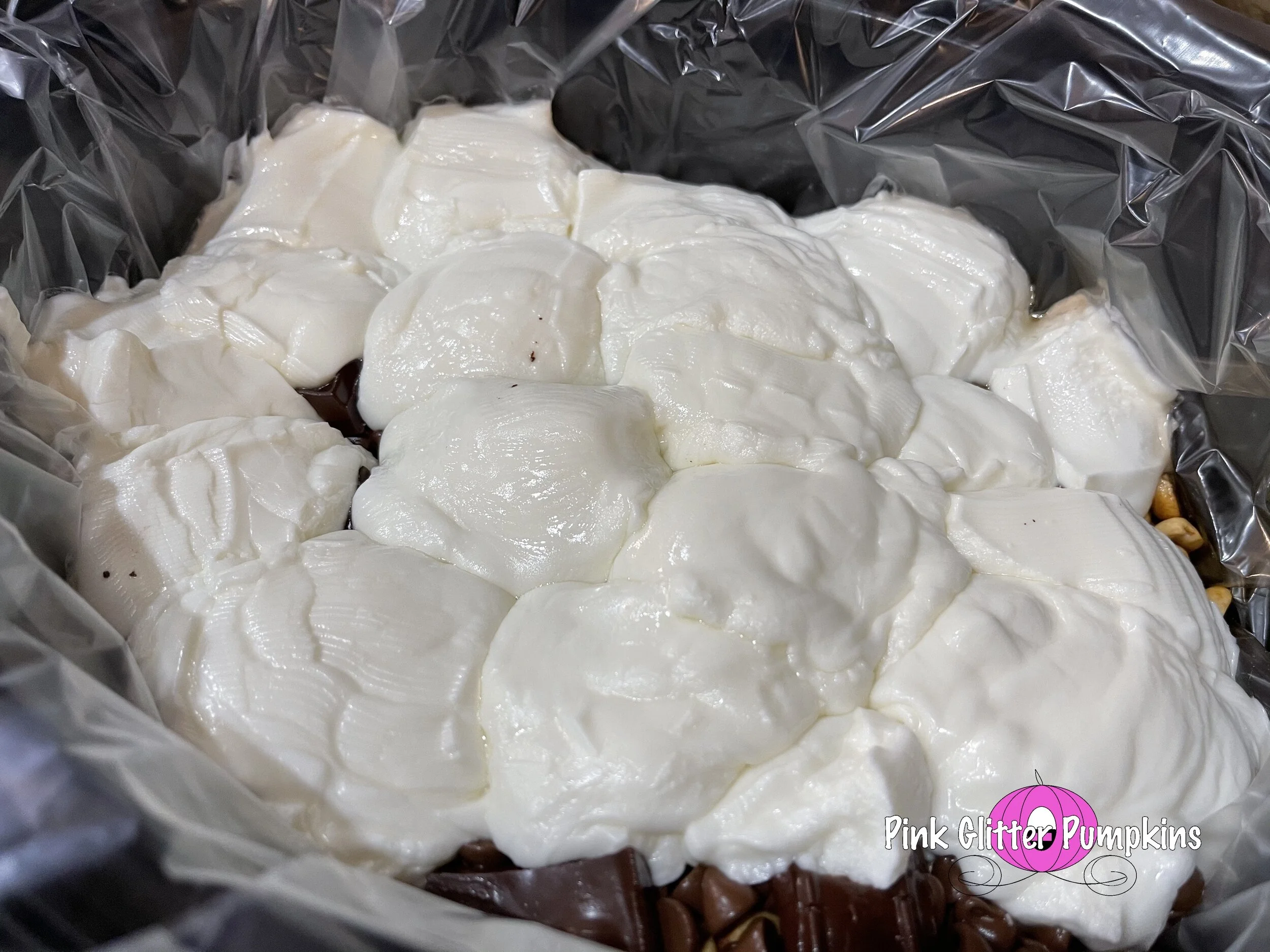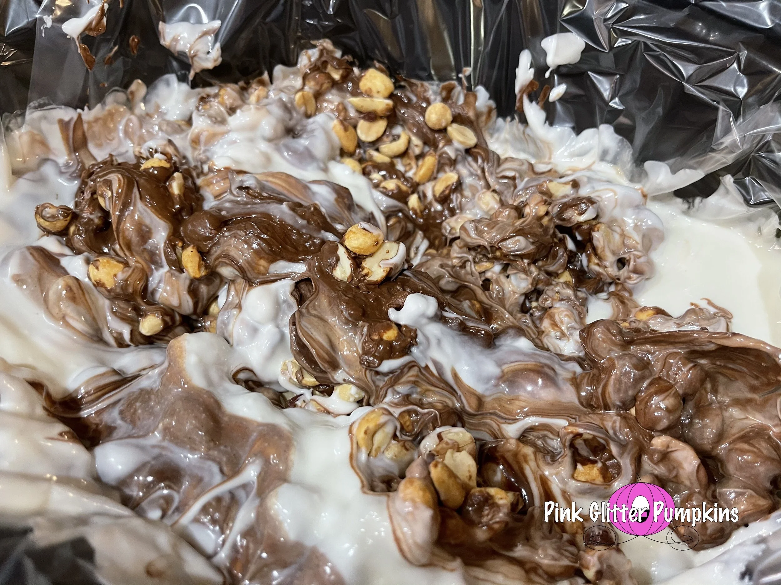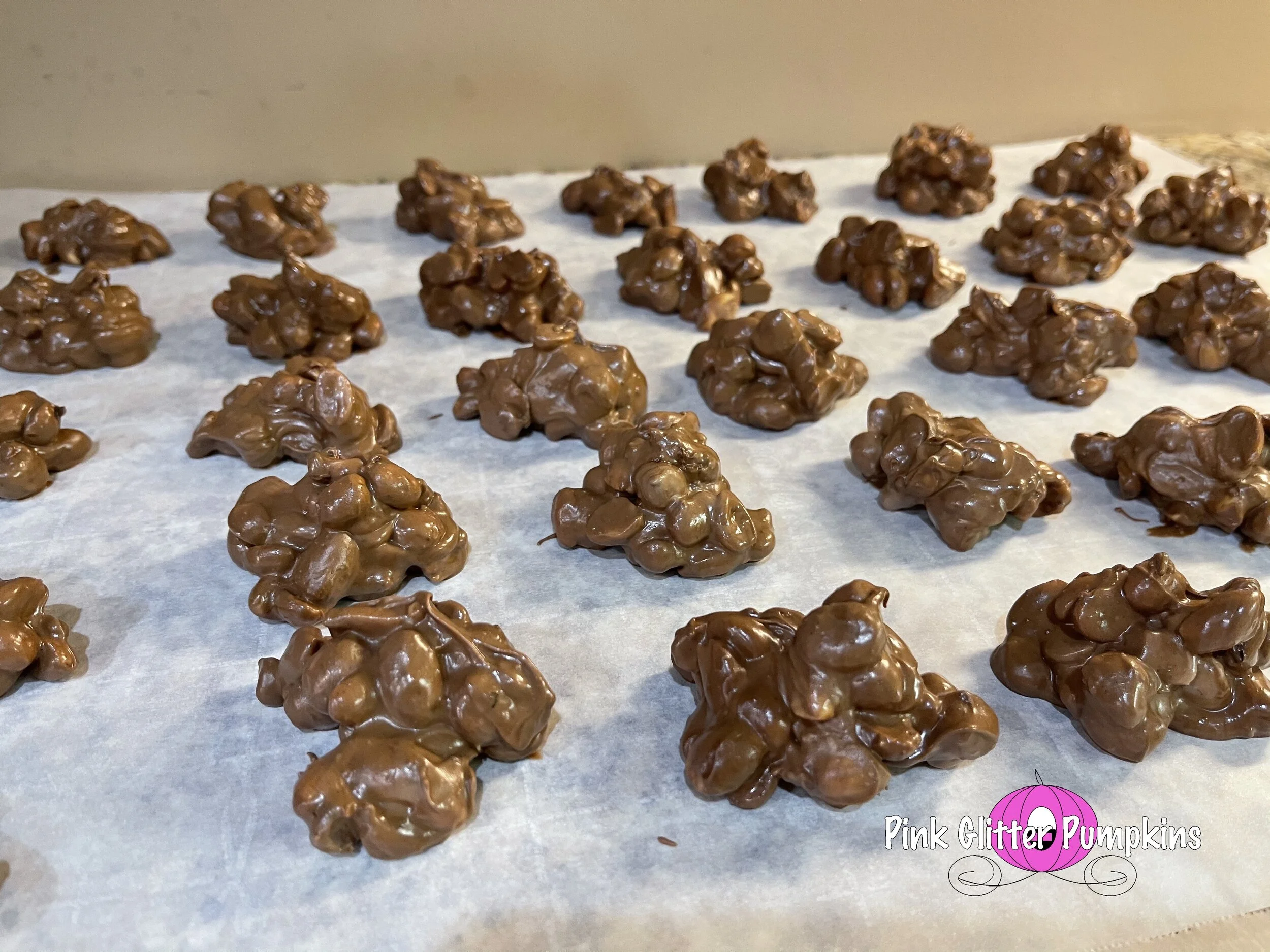 1. Put peanuts in the bottom of the crockpot. Add other ingredients (break apart the chocolate bars).