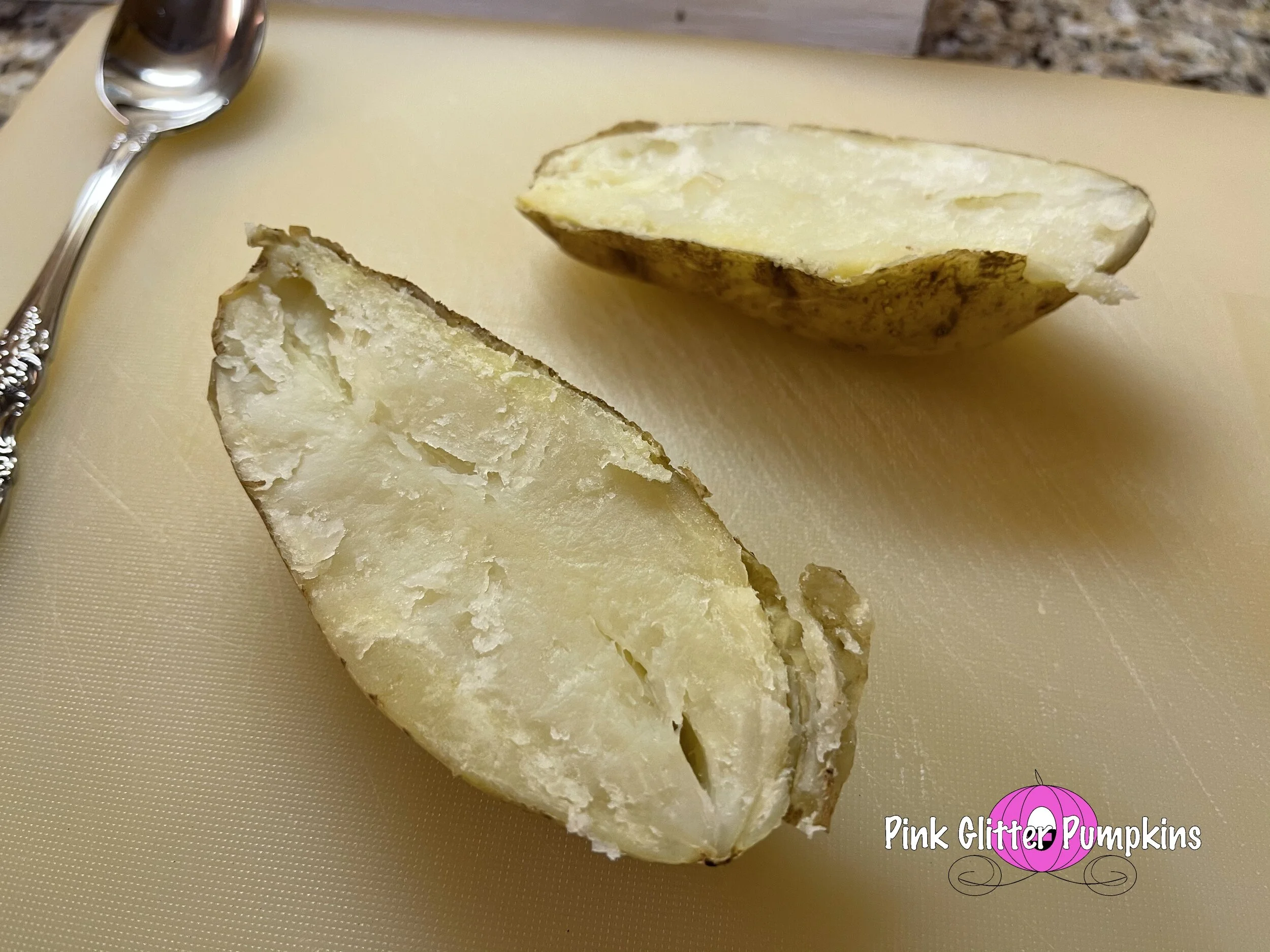 1. Cook the potato however you prefer. The oven works best. Then split it in half.