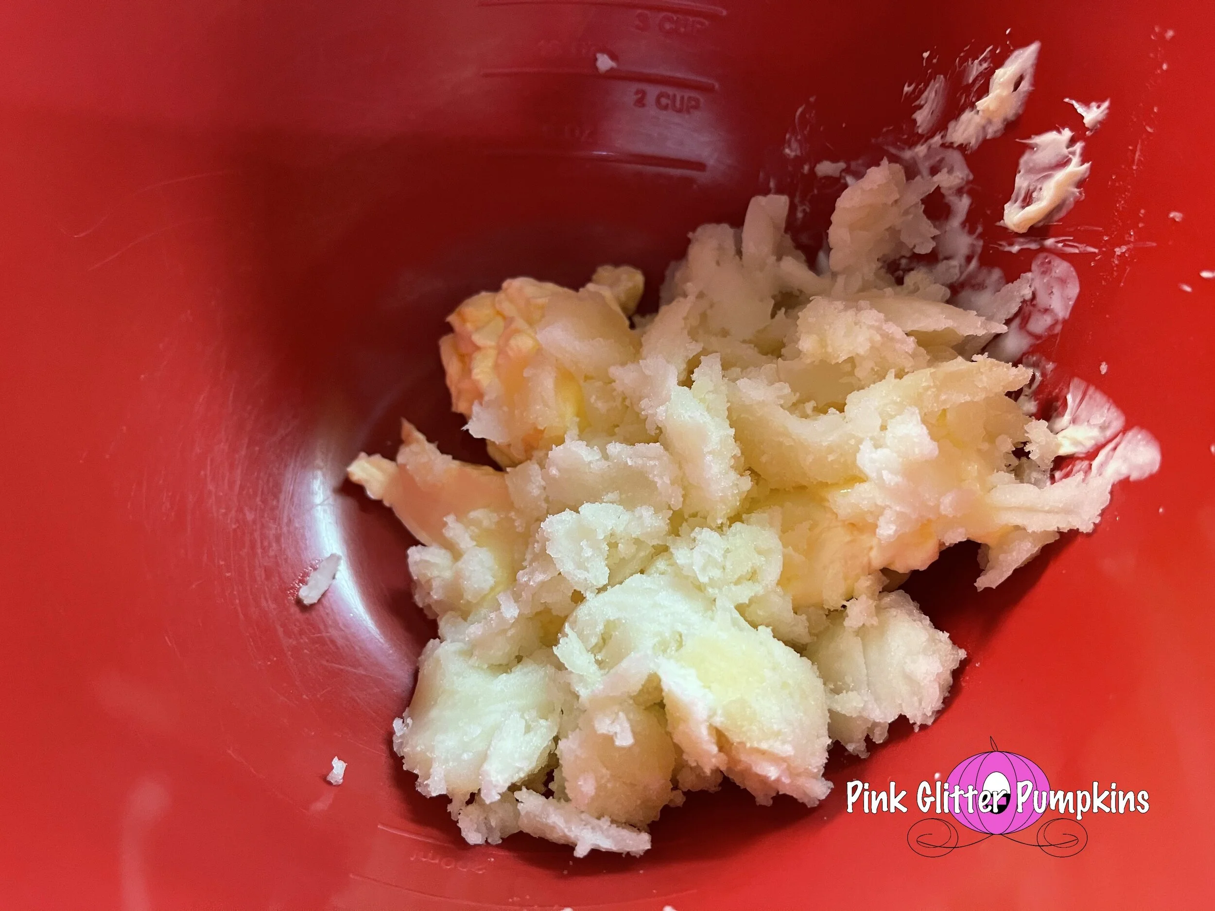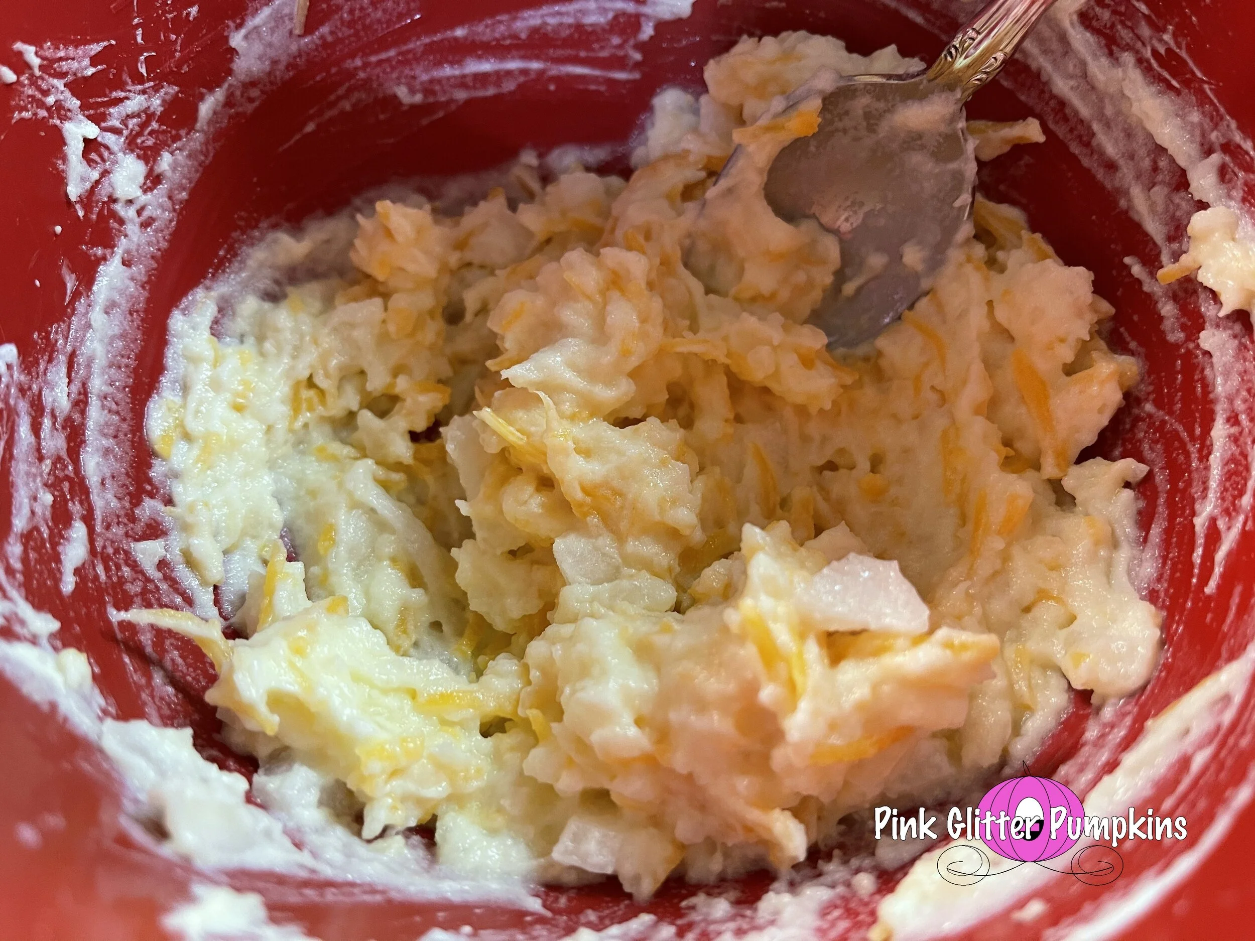 2. Spoon out the inside of the potatoes keeping the shell of the potato intact. Place inside of a mixing bowl and add milk, sour cream, butter, onions, 1/2 cup cheese, garlic powder, salt, and pepper. Mix together.