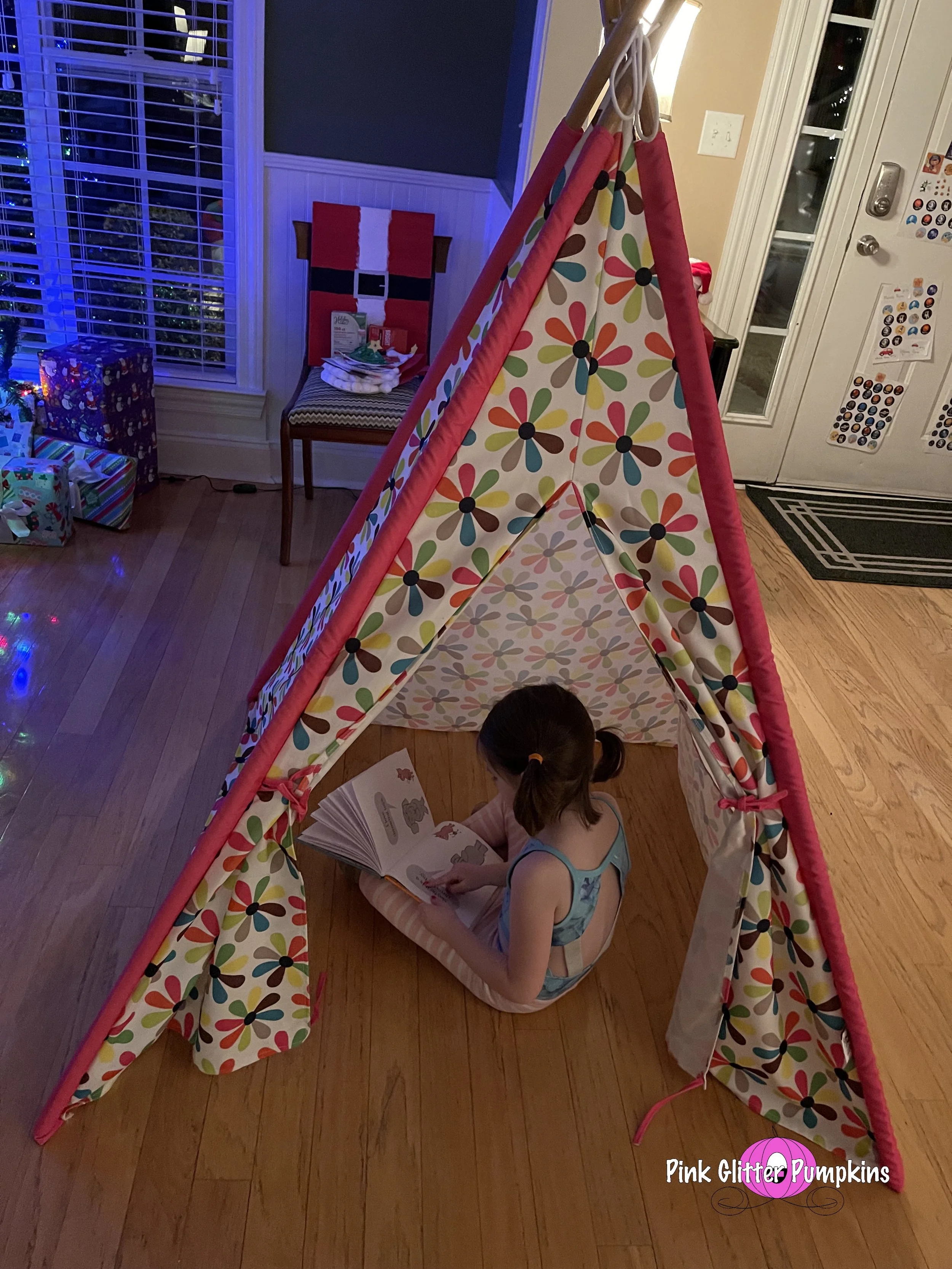 Emily gave us a tent that Lydia is no longer using. Melody immediately fell in love. It did sit in my dining room and foyer about 3 days before it moved to its permanent home in our playroom. Many Barbies currently reside there.