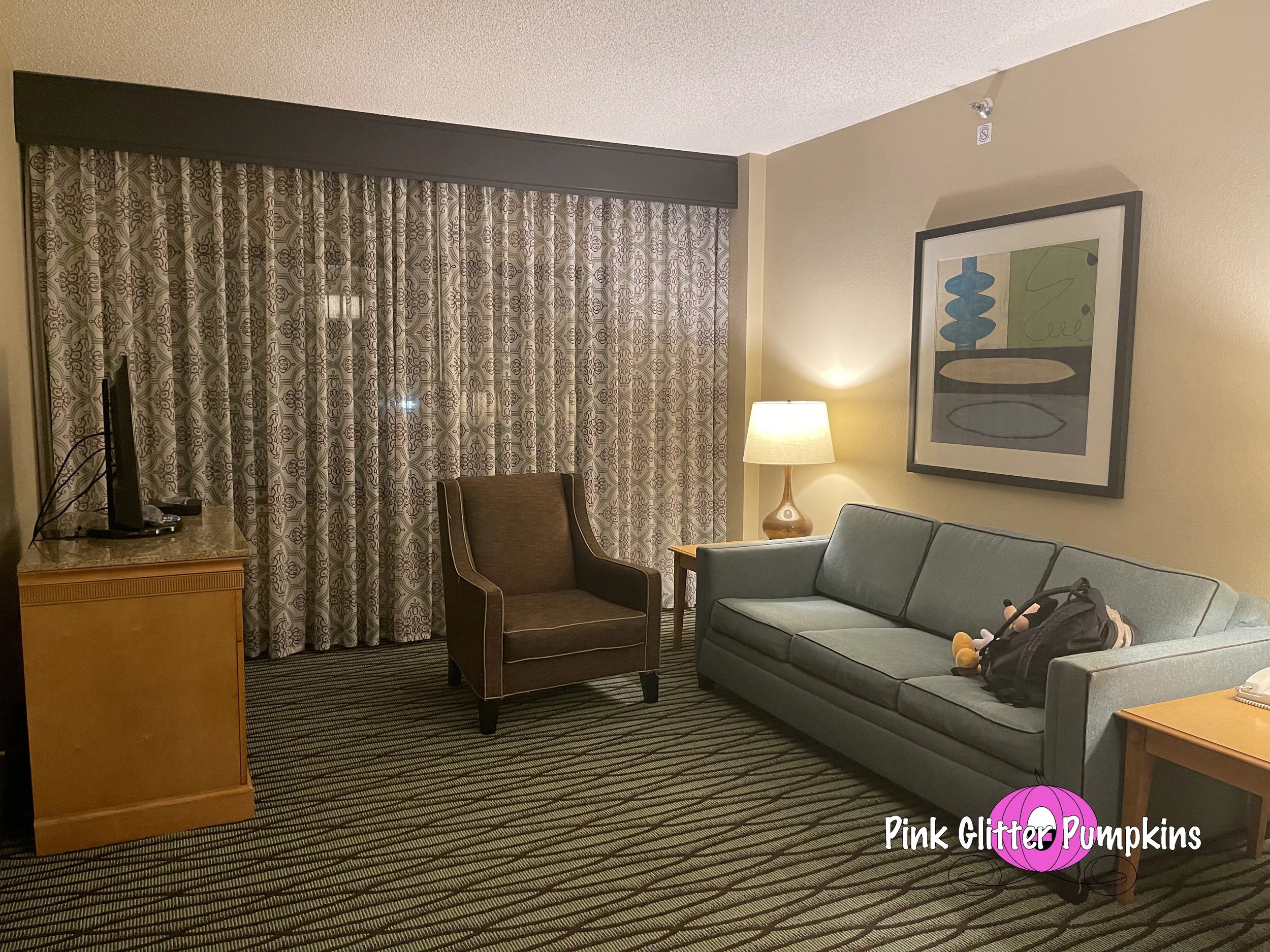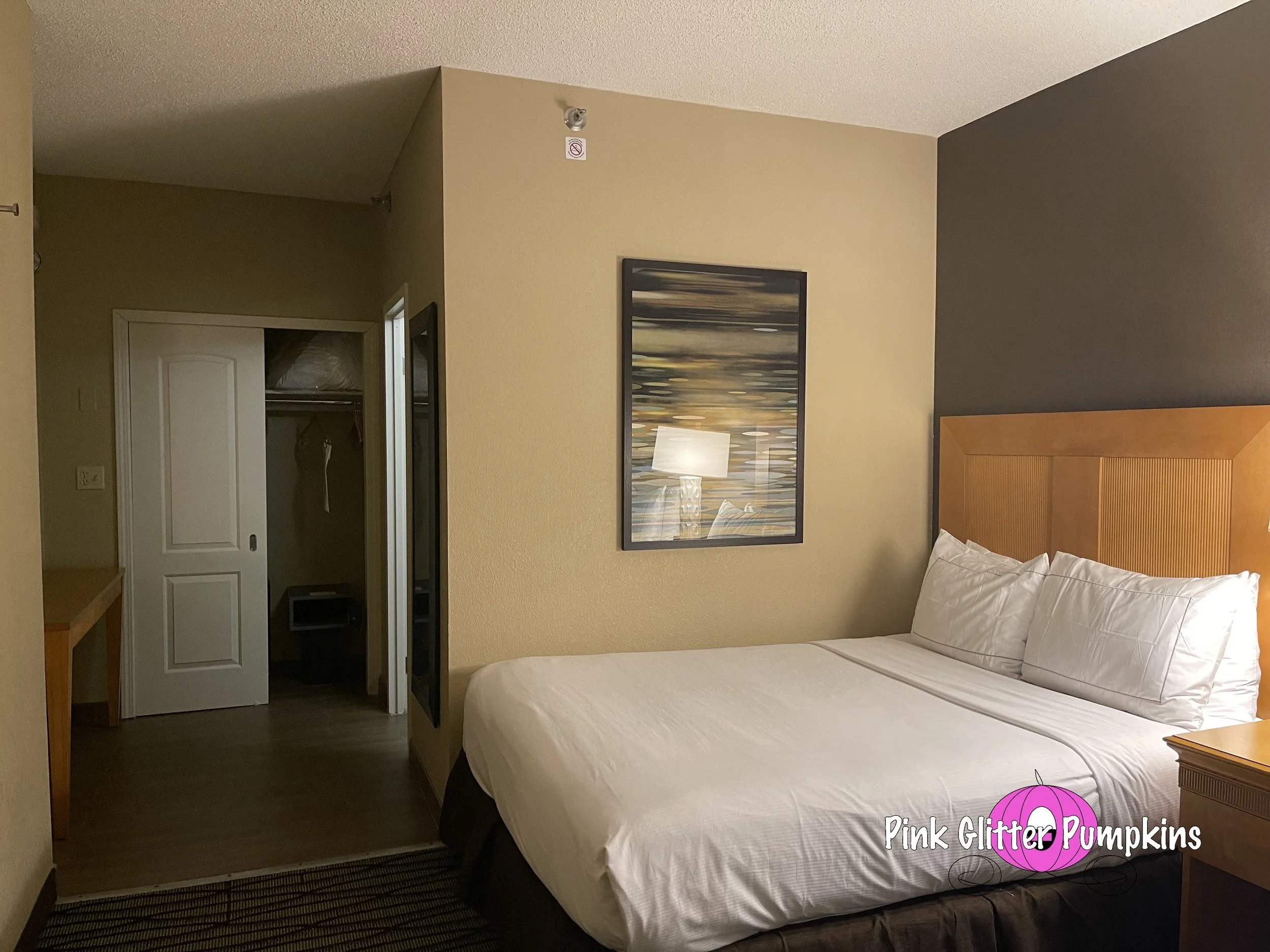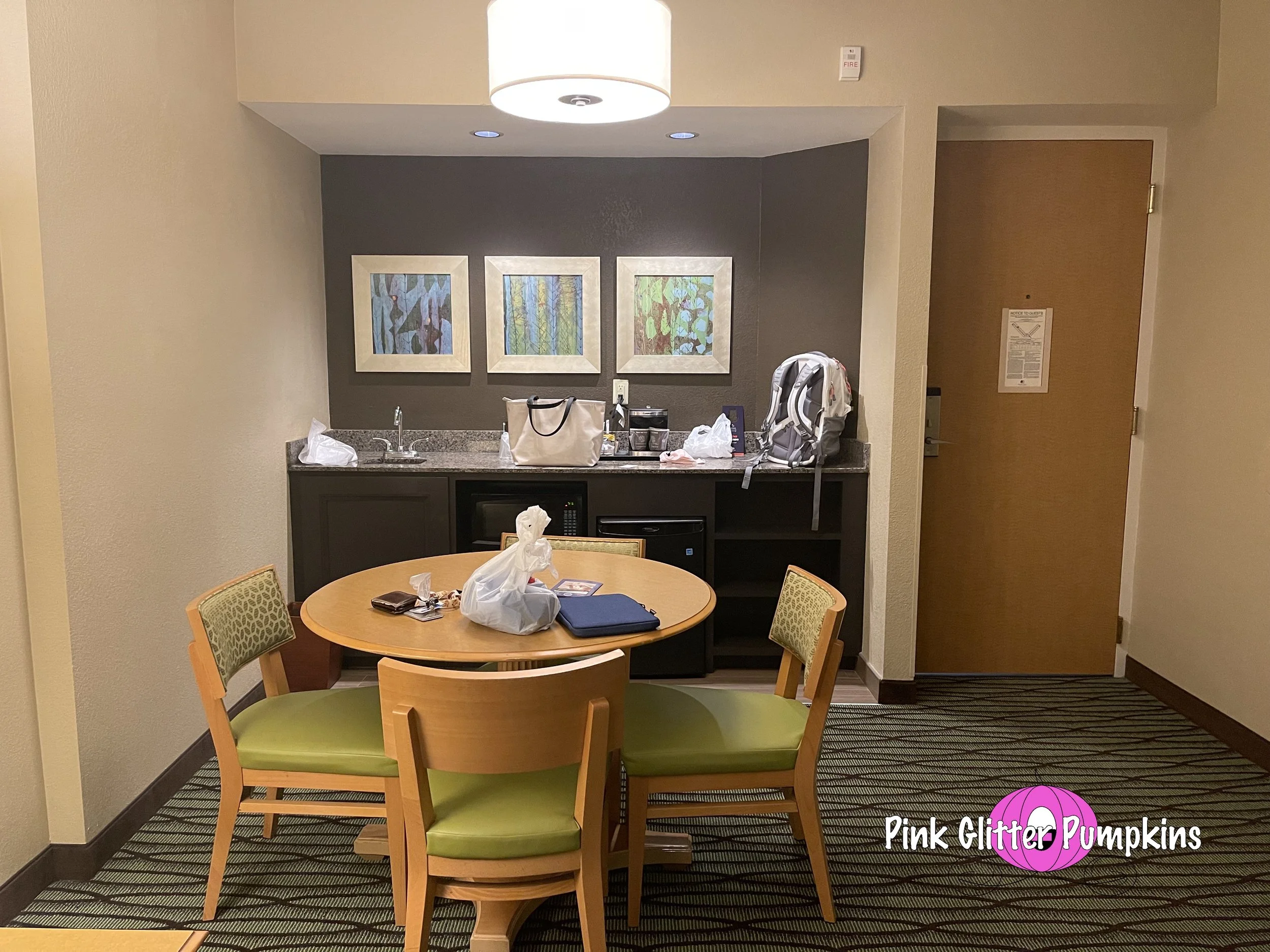 So the room was great for us and what we needed. I am actually bummed we did not get more time in the room. When first walking in, you enter the kitchenette/living room area. The kitchenette contained a table with 4 chairs, and a bar area. The bar area had a sink, coffee maker, fridge, microwave, and some storage. This was great for all of our things we bring for Melody since she is such a picky eater. We used the table to pack our park bags and for Melody to eat breakfast.