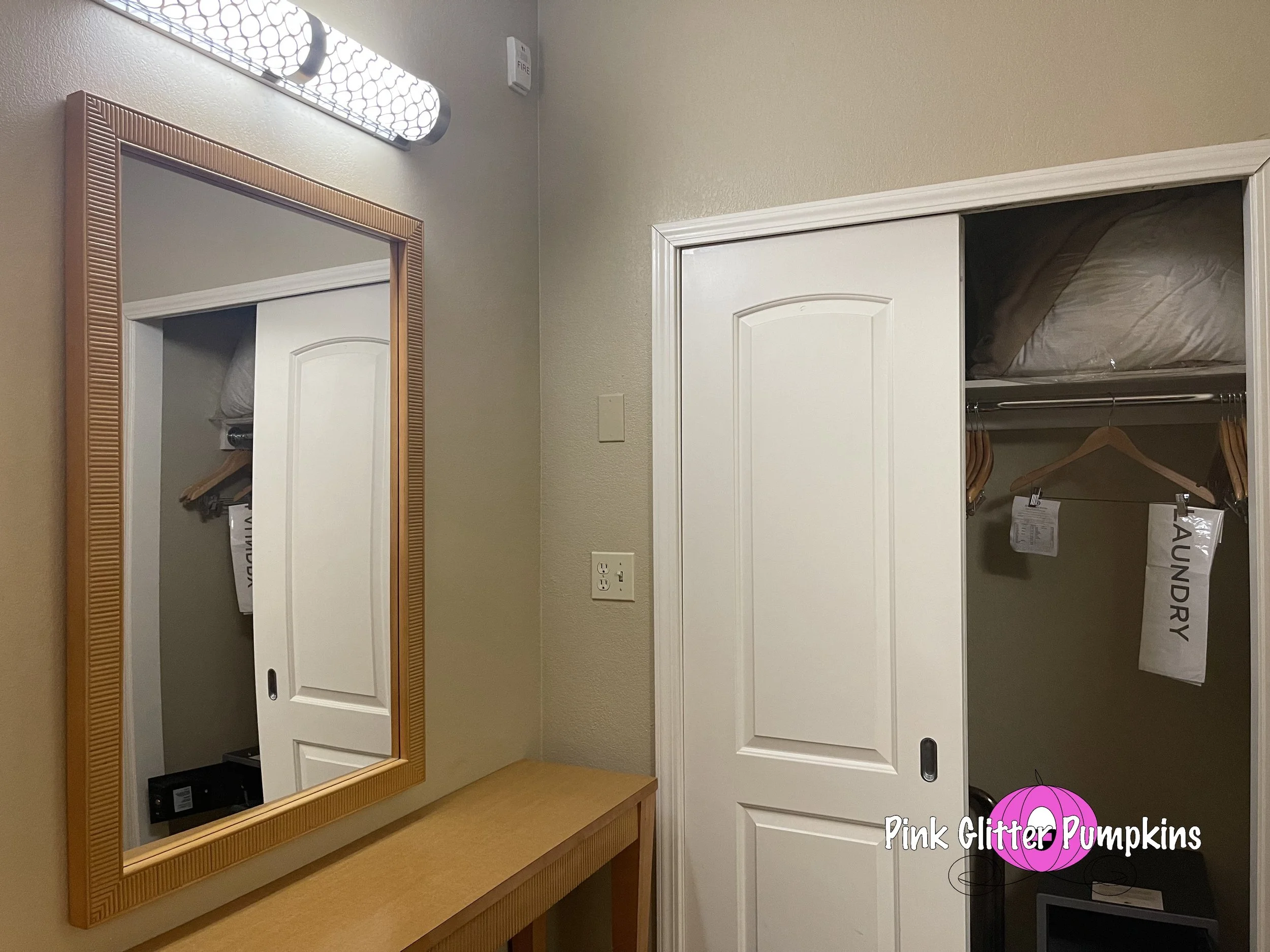 Leading to the bathroom was a small hall with a table, mirror, and closet. This is where I would lay out our clothes each day and get ready. It also stored things like my Mickey Ears, jewelry, etc.