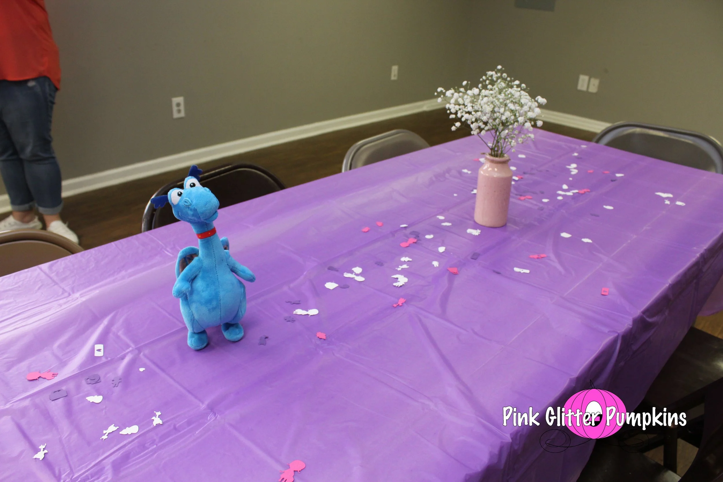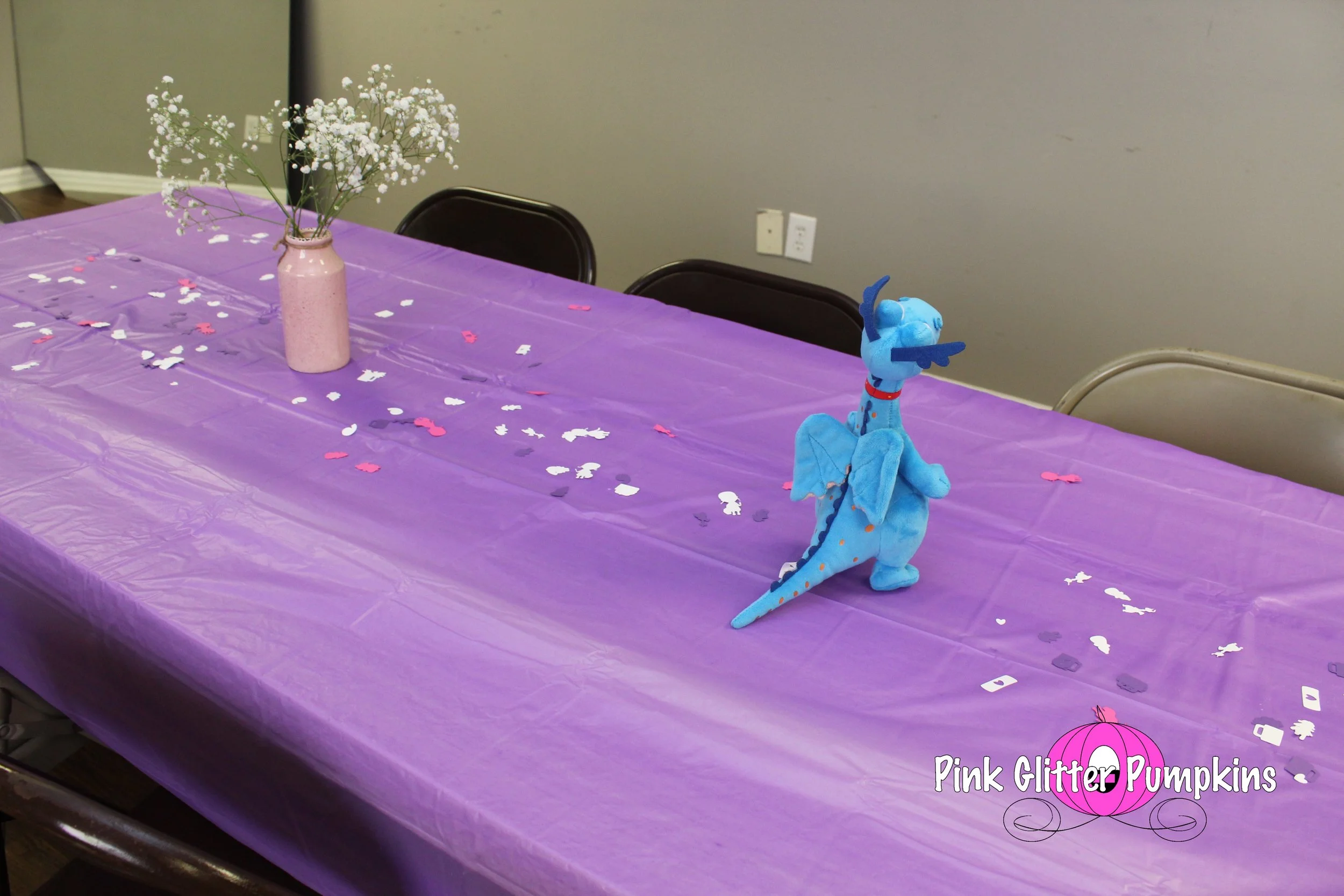 The main tables where people could sit down and eat were three long tables put together. I used purple tablecloths on these tables. Then I decorated using stuffed animals, books, and some mini-figure toys Melody has. I also had three vases that I used to fill with baby’s breath and flowers from Melody’s dance recital the week before. And the last thing I used was confetti I made. I used white, pink, and purple cardstock, and I cut out outlines of different objects from the show. Then we spread them out randomly on the table.