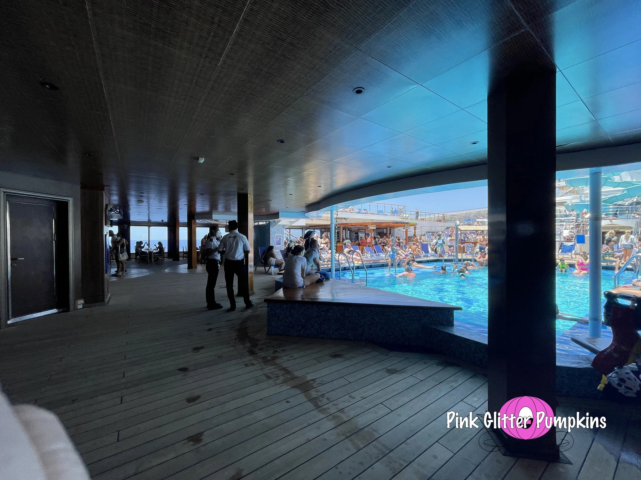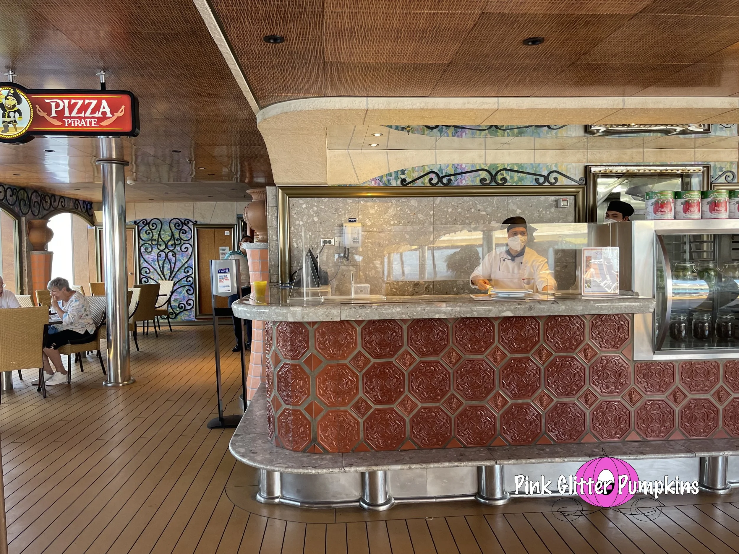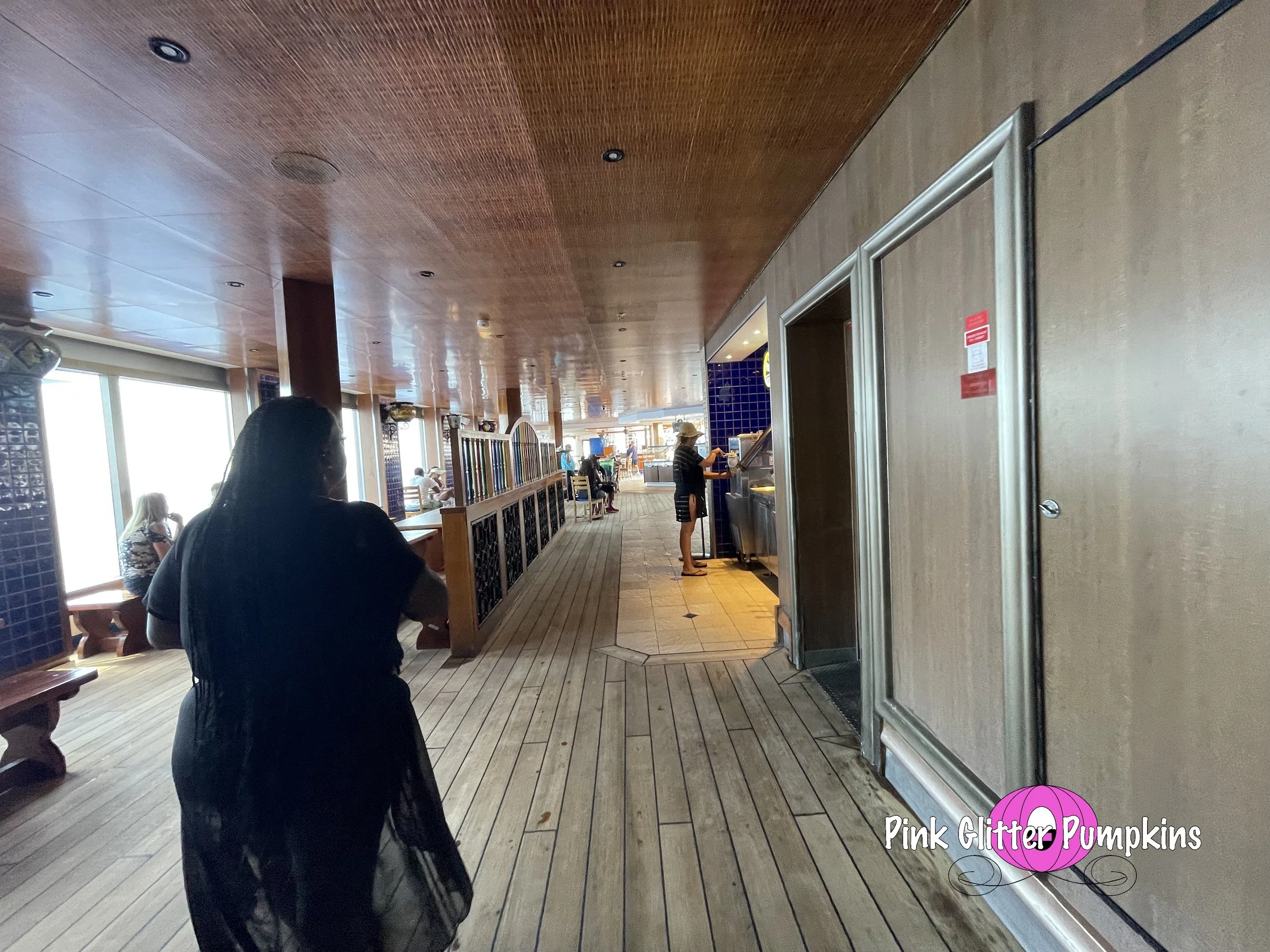Now if we head up but stay Aft, you will find a pool area. This pool itself is for adults only, but kids can obviously be back here since there are food areas around the pool. We actually would eat sometimes back here because the tables were often empty. We actually got in the pool one day back here. Back here you will find a bar, the Pizza Pirate, and the Seafood Shack. There was also an ice cream station, but it was closed during our trip. The Seafood Shack cost extra, so we never tried it.