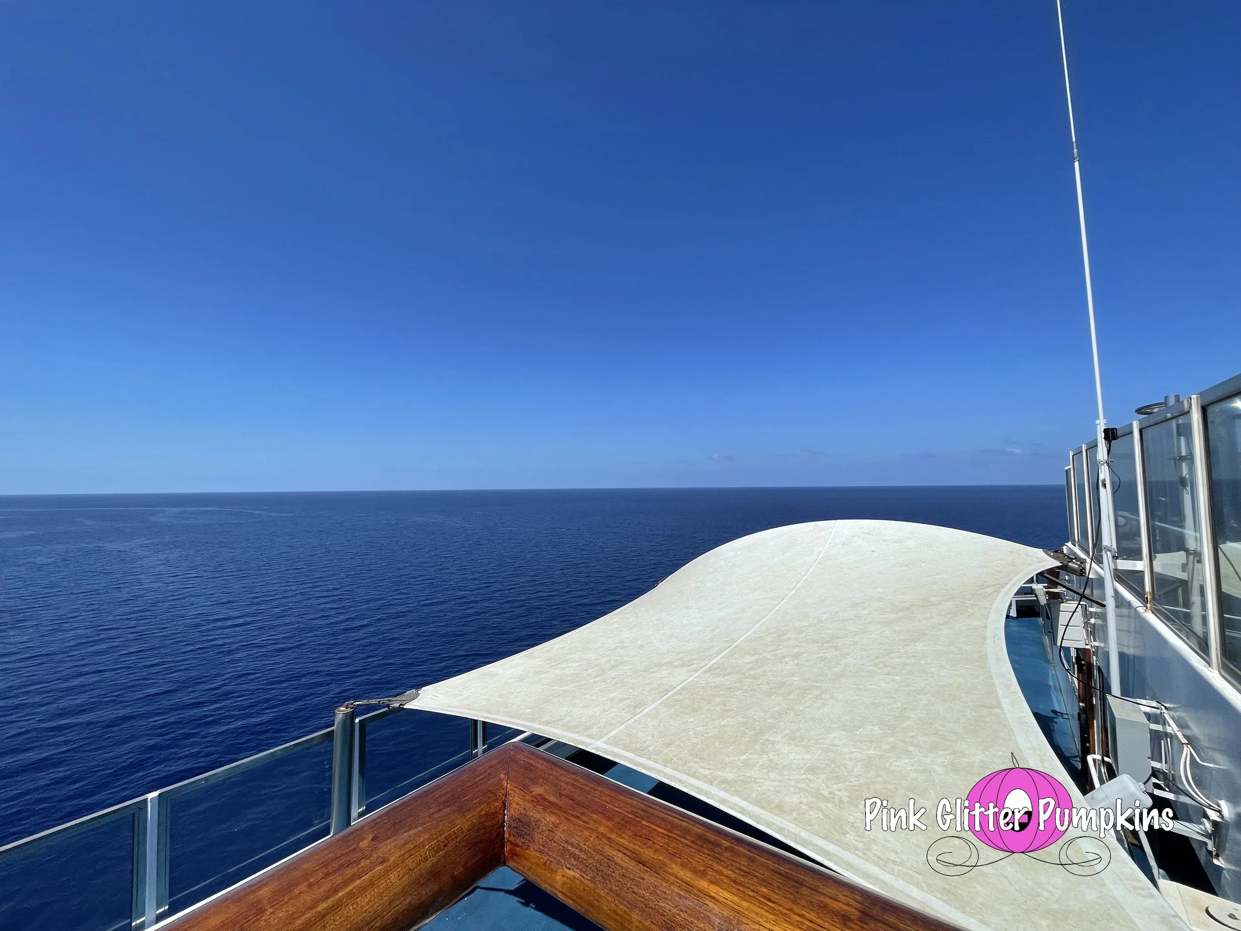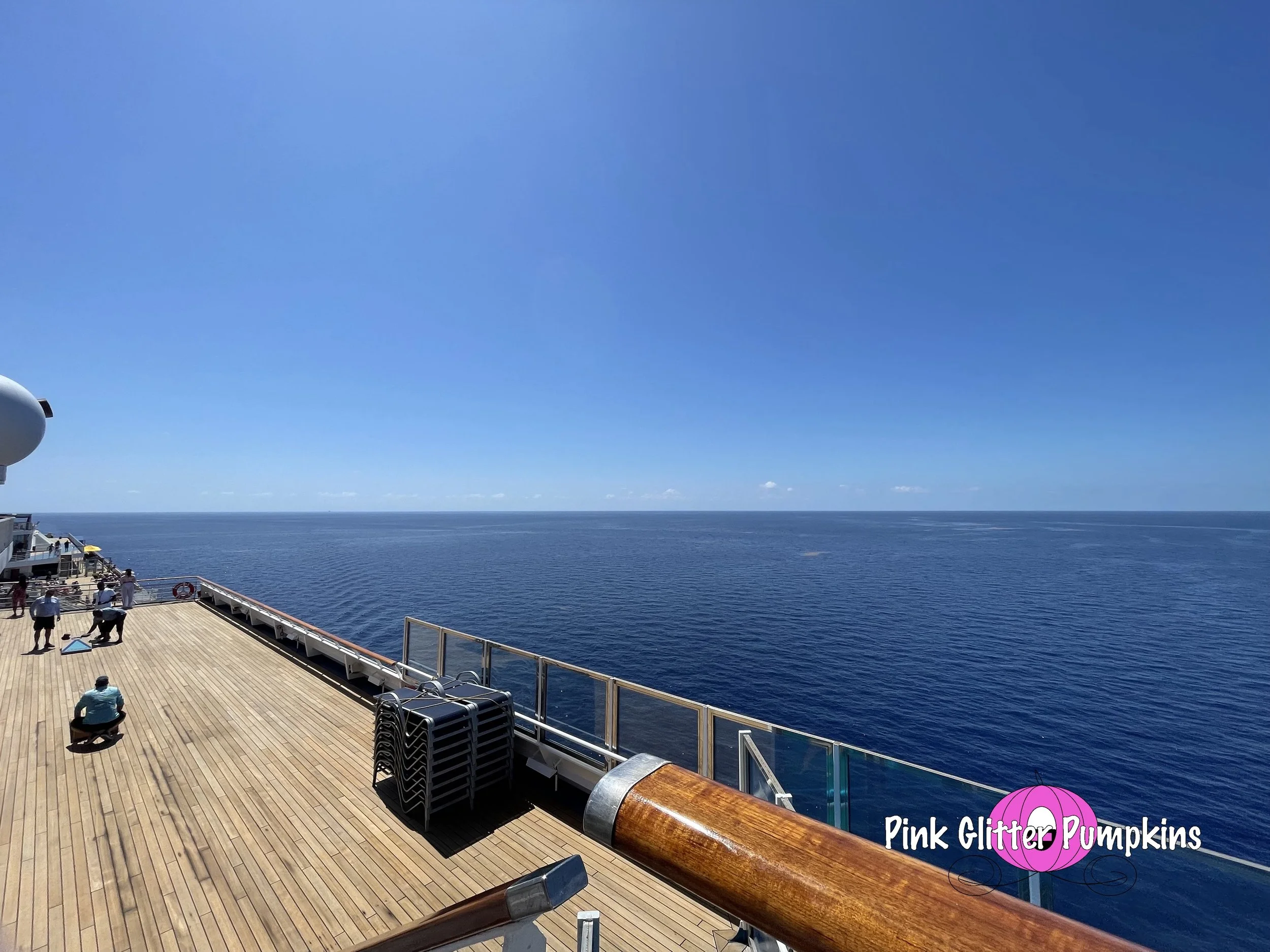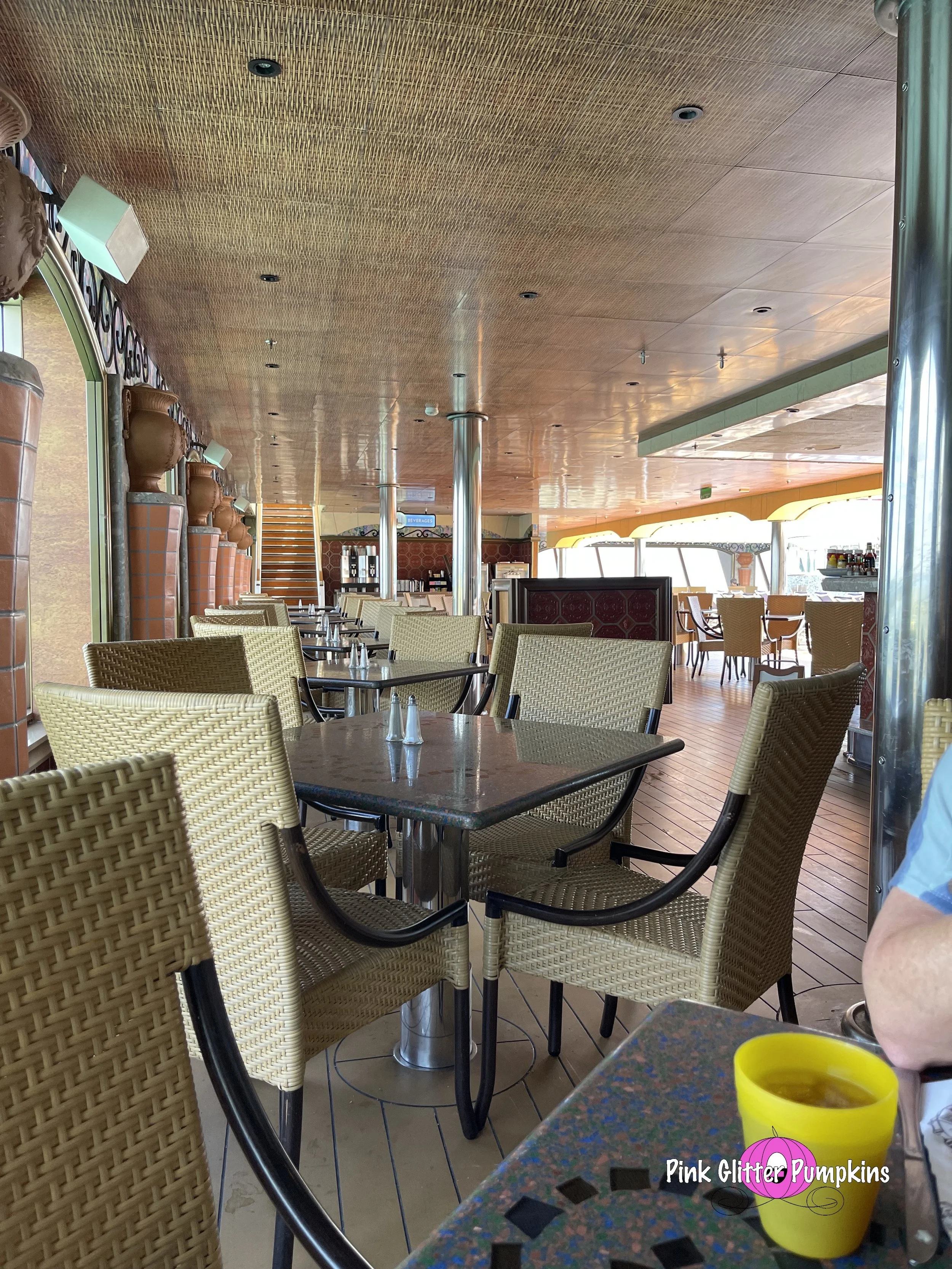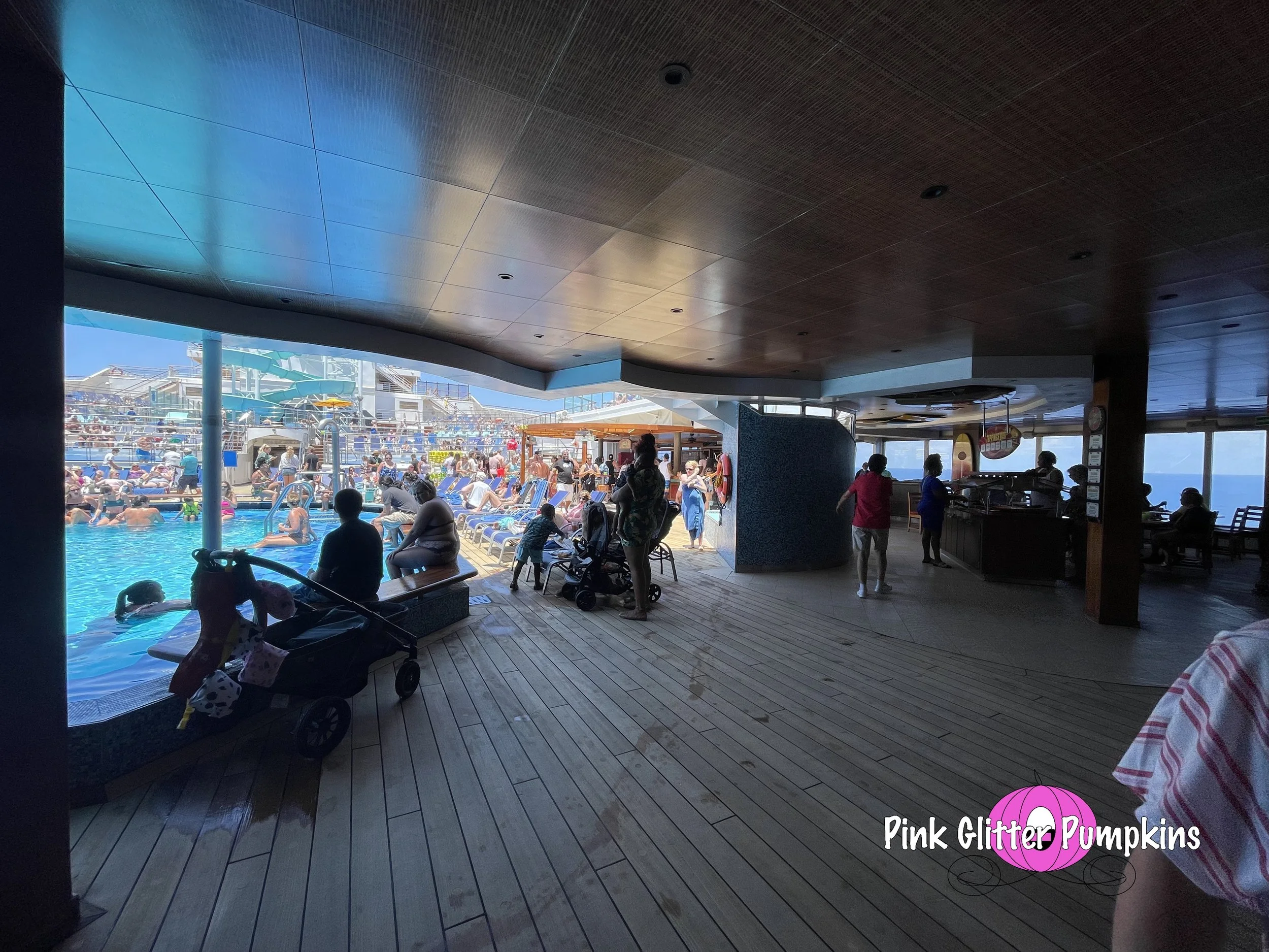 Now if we head up but stay Aft, you will find a pool area. This pool itself is for adults only, but kids can obviously be back here since there are food areas around the pool. We actually would eat sometimes back here because the tables were often empty. We actually got in the pool one day back here. Back here you will find a bar, the Pizza Pirate, and the Seafood Shack. There was also an ice cream station, but it was closed during our trip. The Seafood Shack cost extra, so we never tried it.