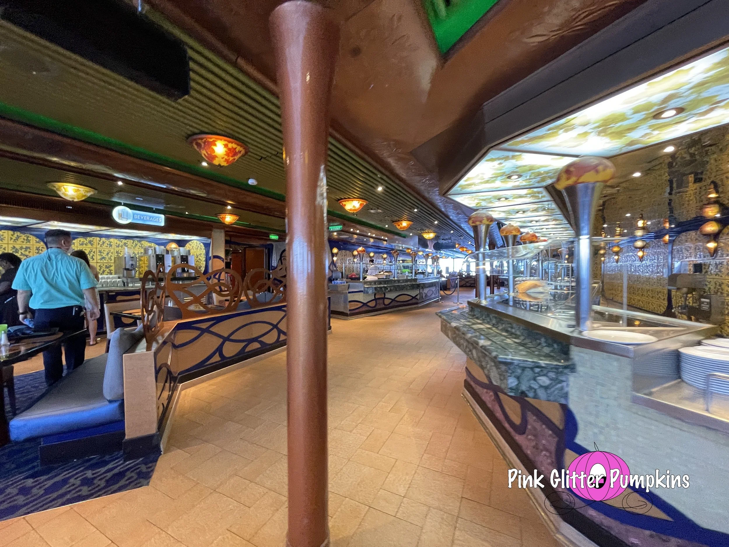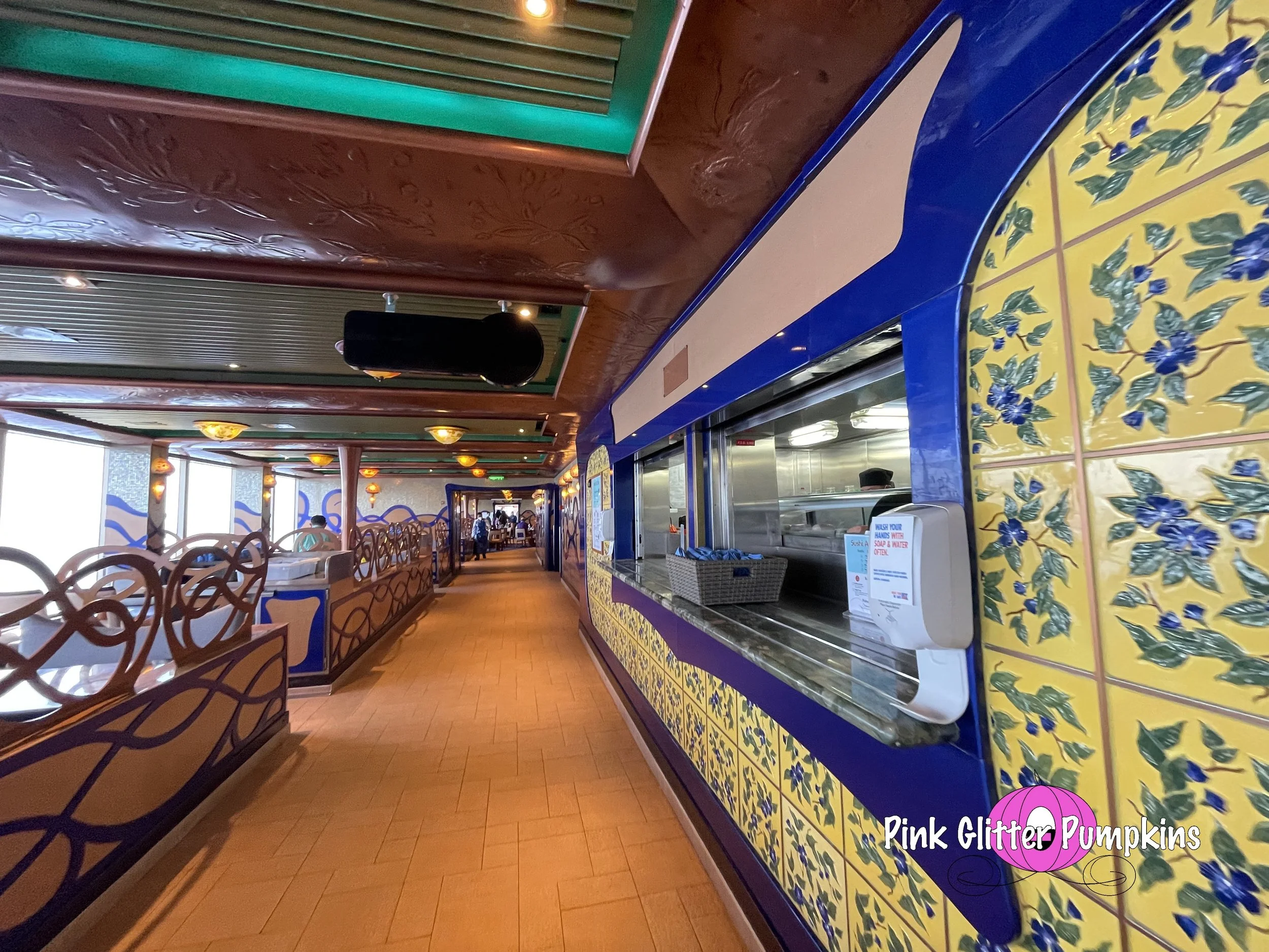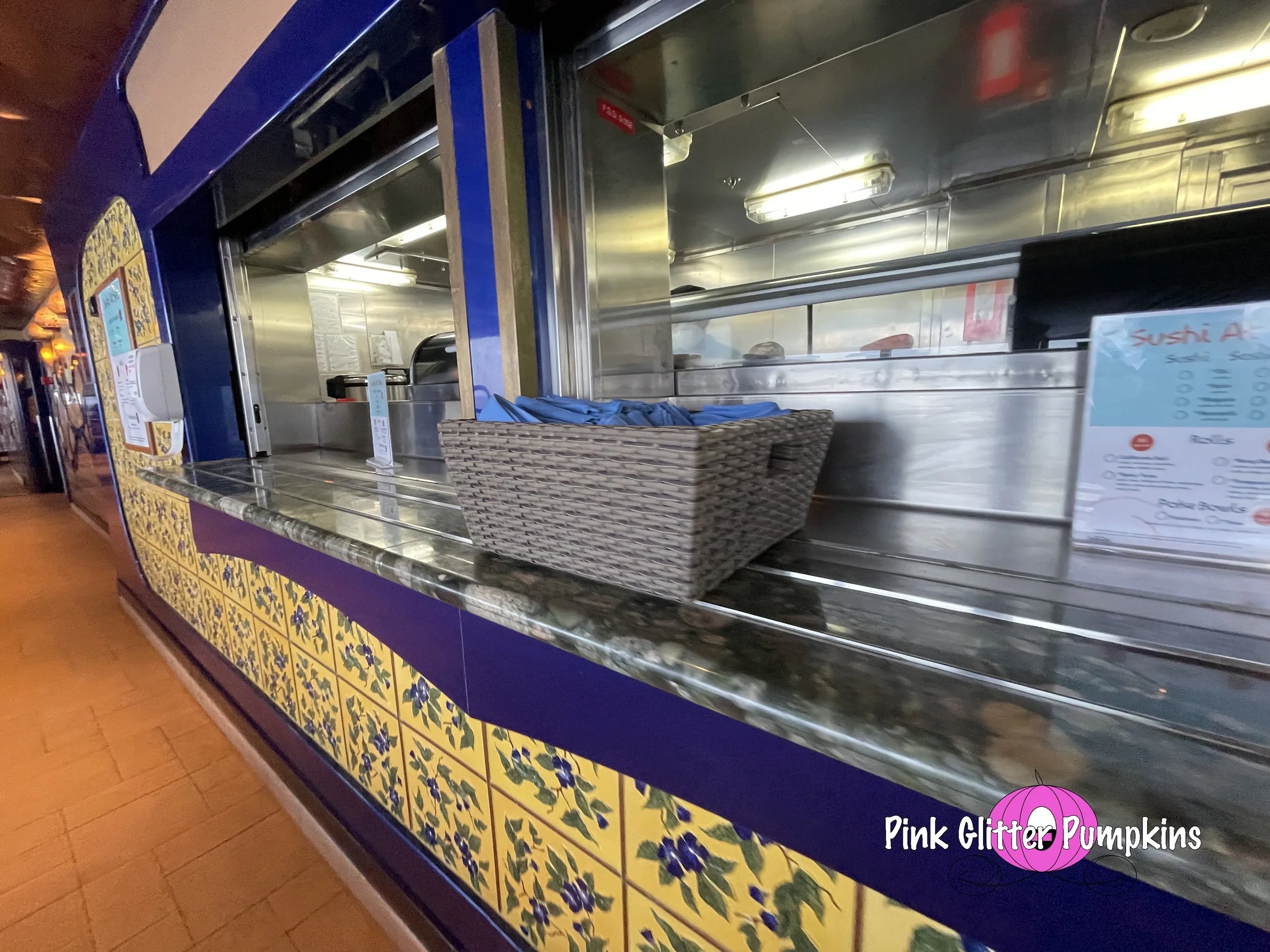 Heading back towards the front of the ship you will enter the Lido Restaurant. It actually contained a few different eateries. But it also had PLENTY of tables and drink machines for tea, coffee, and water. The views were also really nice. We always sat by a window. Here you will find the traditional buffet, a sushi bar (cost extra), a sandwich shop, and if you go upstairs, you will find BBQ.