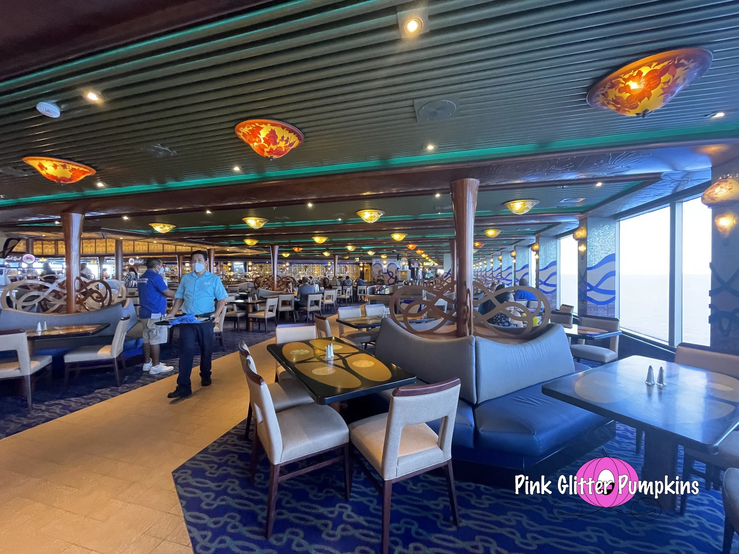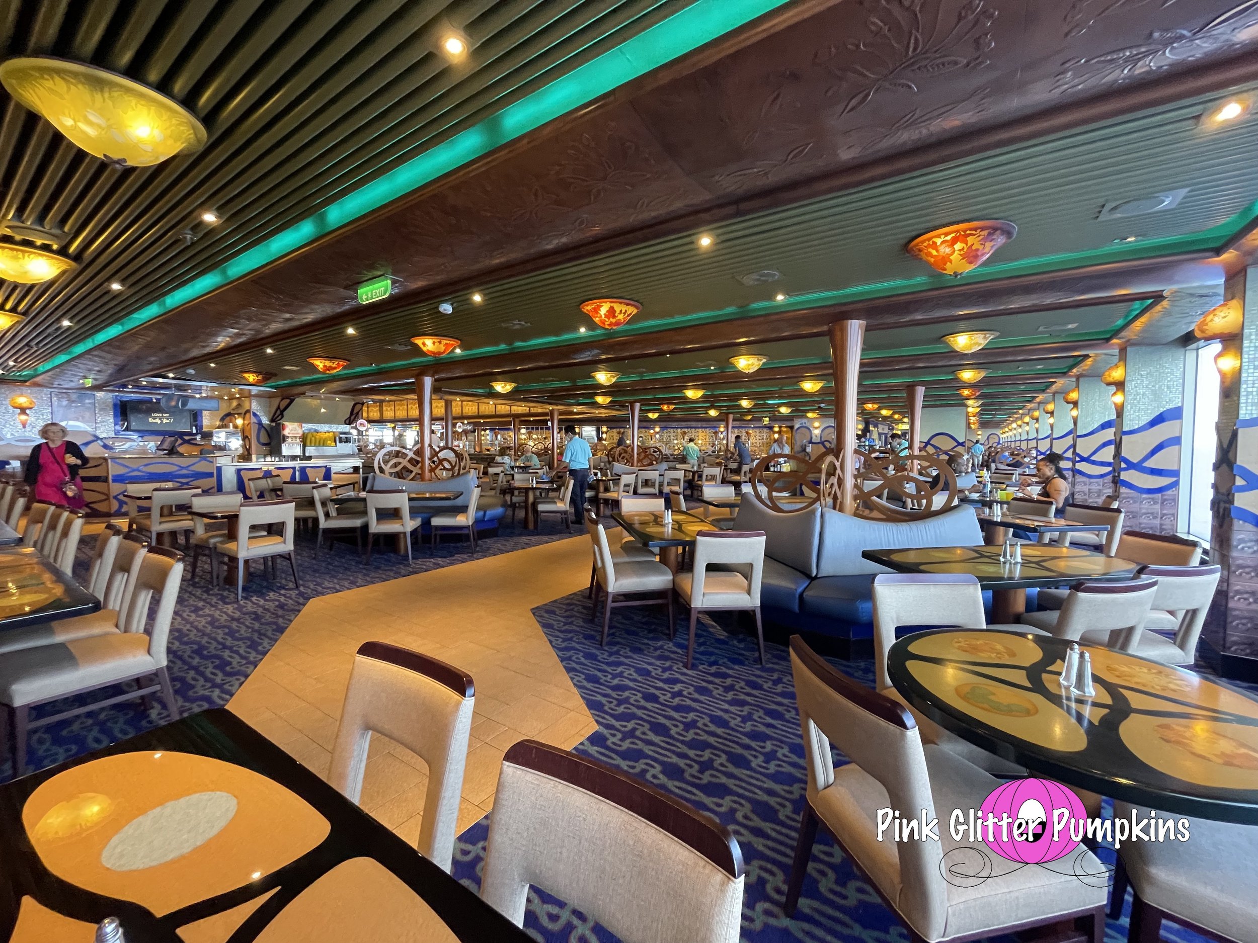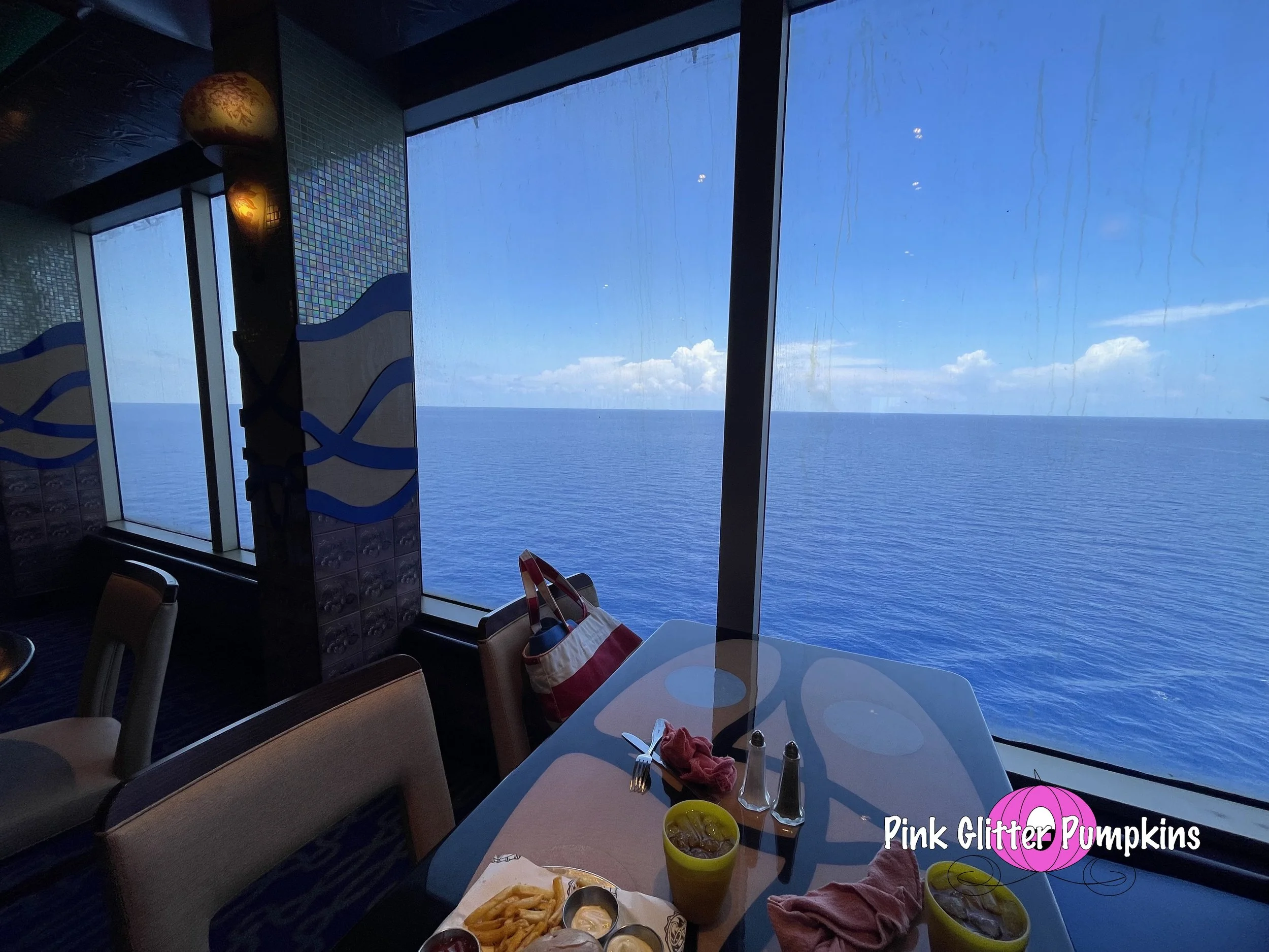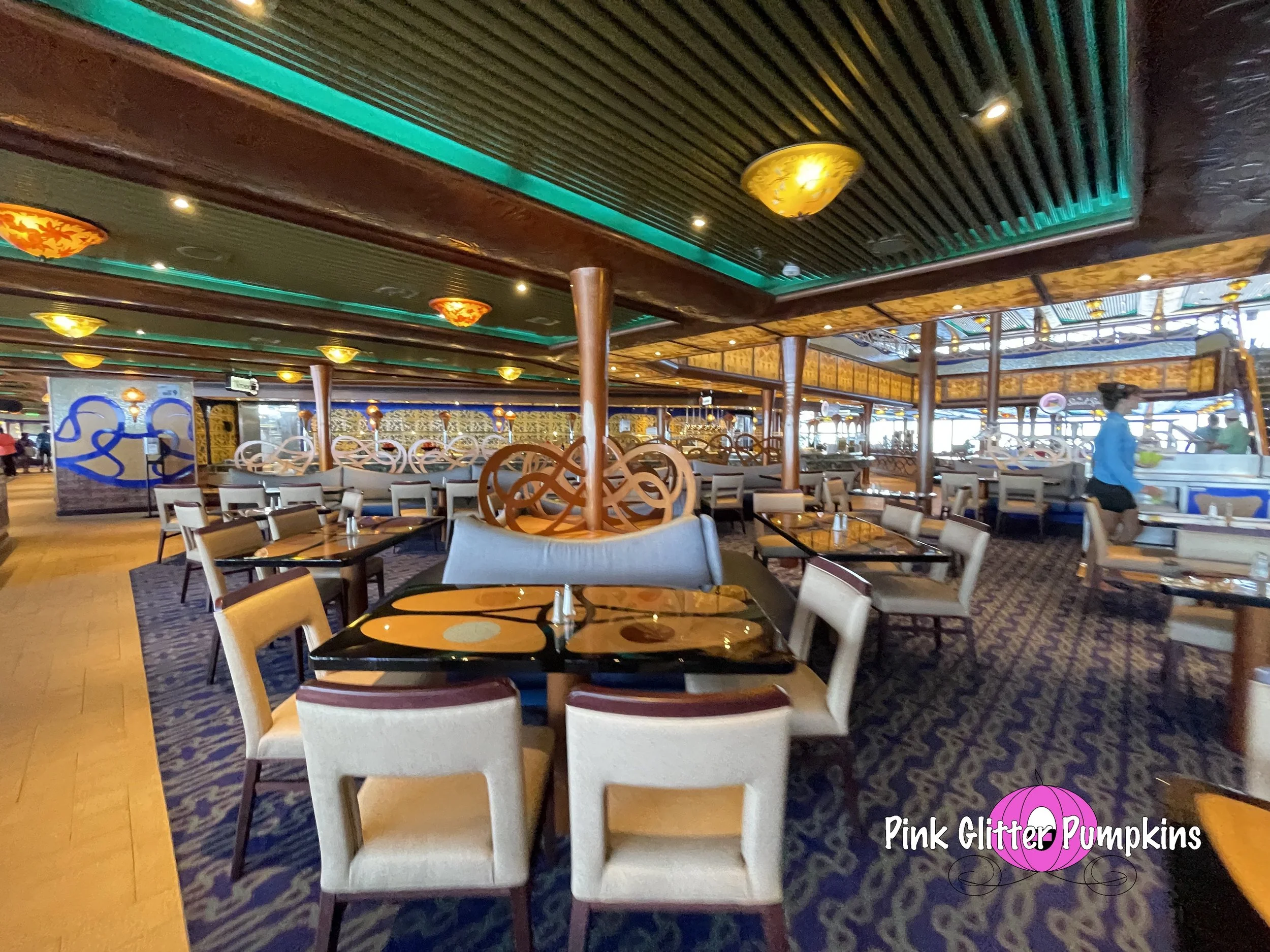 Heading back towards the front of the ship you will enter the Lido Restaurant. It actually contained a few different eateries. But it also had PLENTY of tables and drink machines for tea, coffee, and water. The views were also really nice. We always sat by a window. Here you will find the traditional buffet, a sushi bar (cost extra), a sandwich shop, and if you go upstairs, you will find BBQ.
