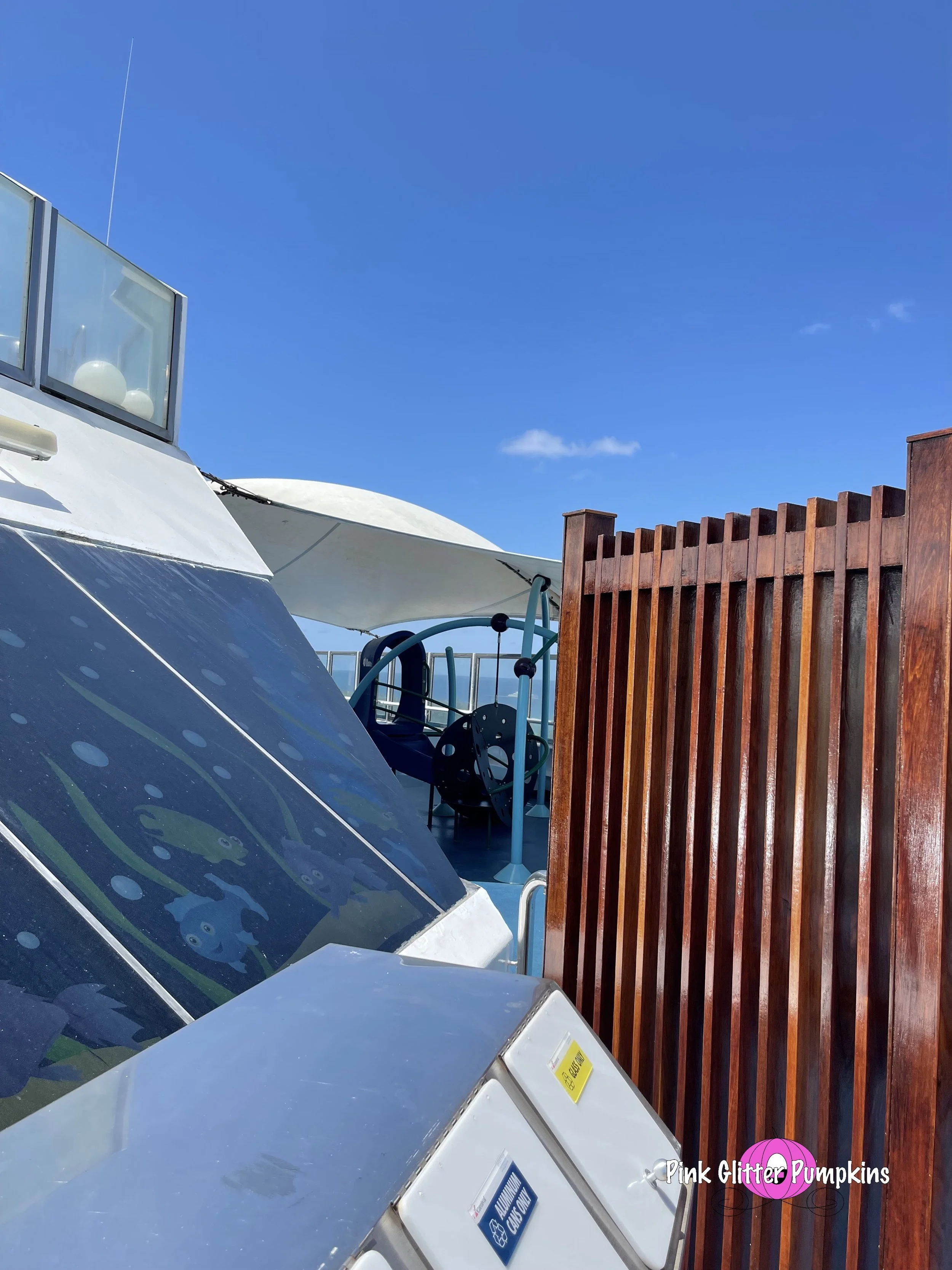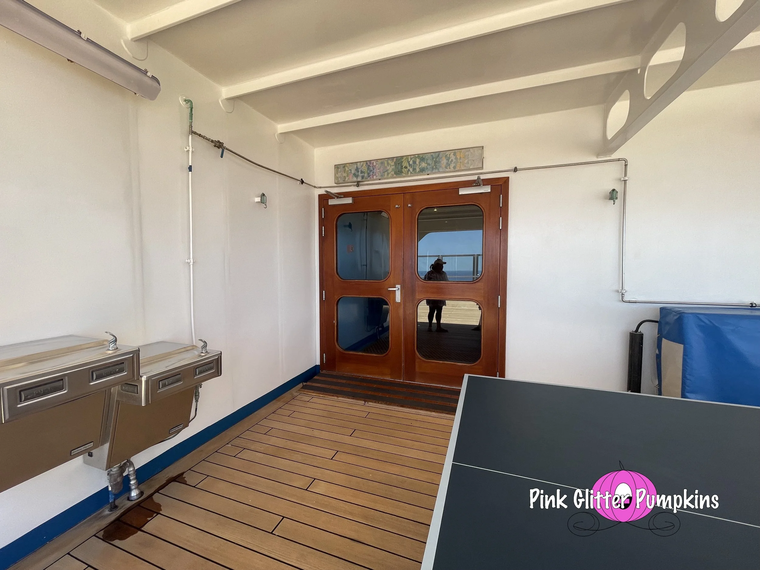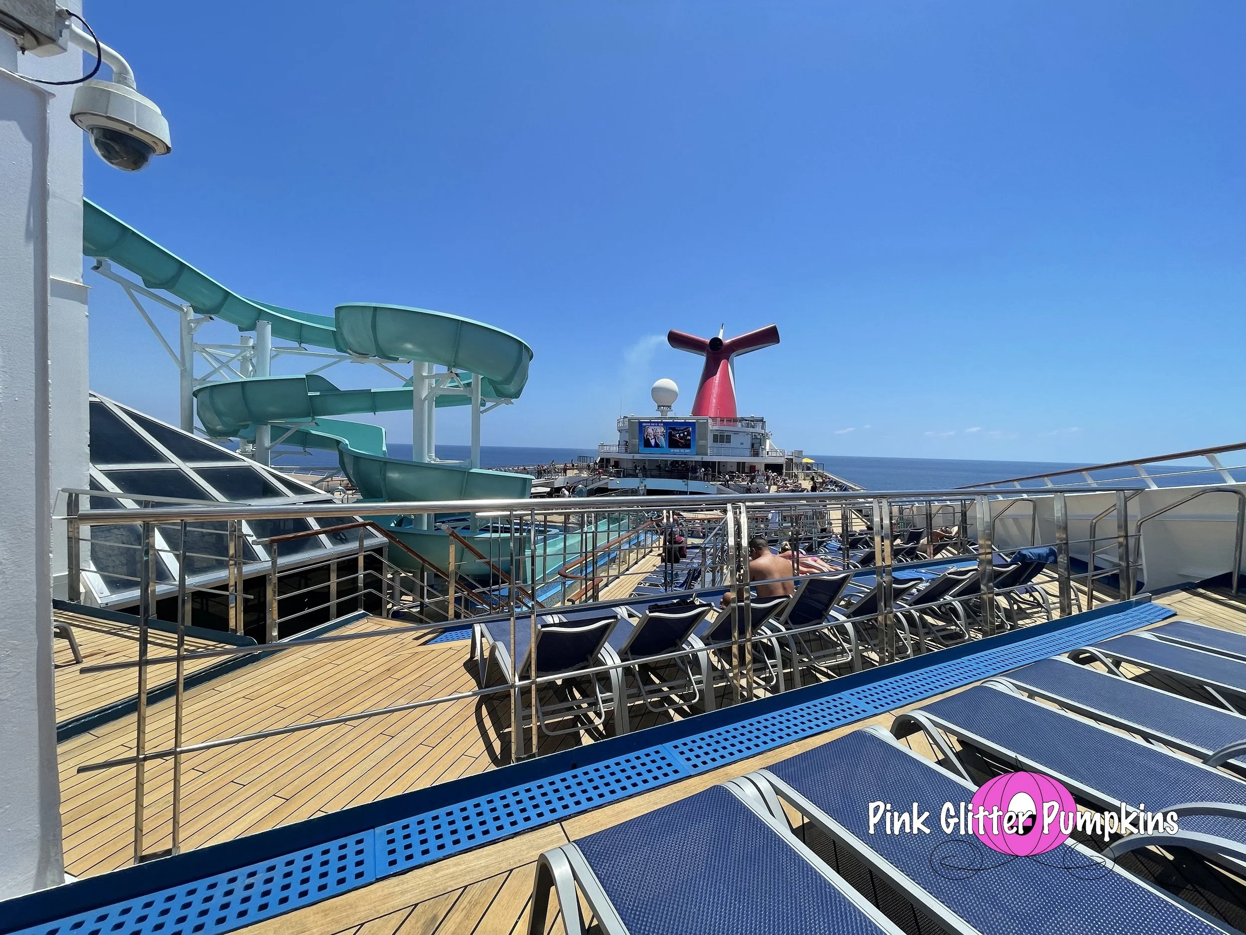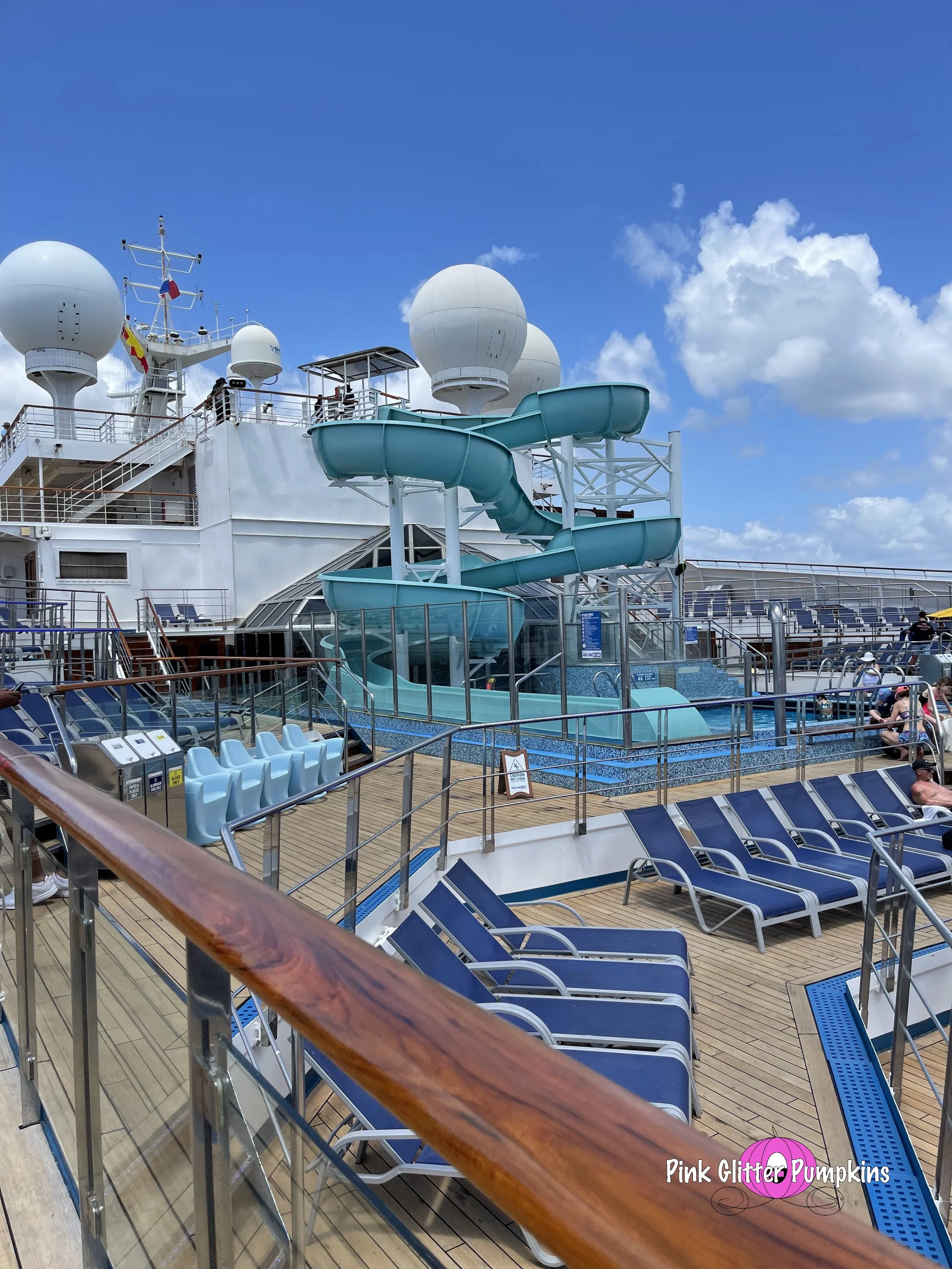 And going all the way forward, you can find the Spa/Serenity Area. We spent a little bit of time here nearly every day. The Serenity Area is for 21+, and while there is not a pool, you can find two hot tubs and its own bar. If you go inside from here, you will find both the spa and restrooms. A small negative about this area was the kids area was right outside of it. While this was never an issue for us, I could see it being an issue on a busier cruise. But I guess there is some convenience to it too.
