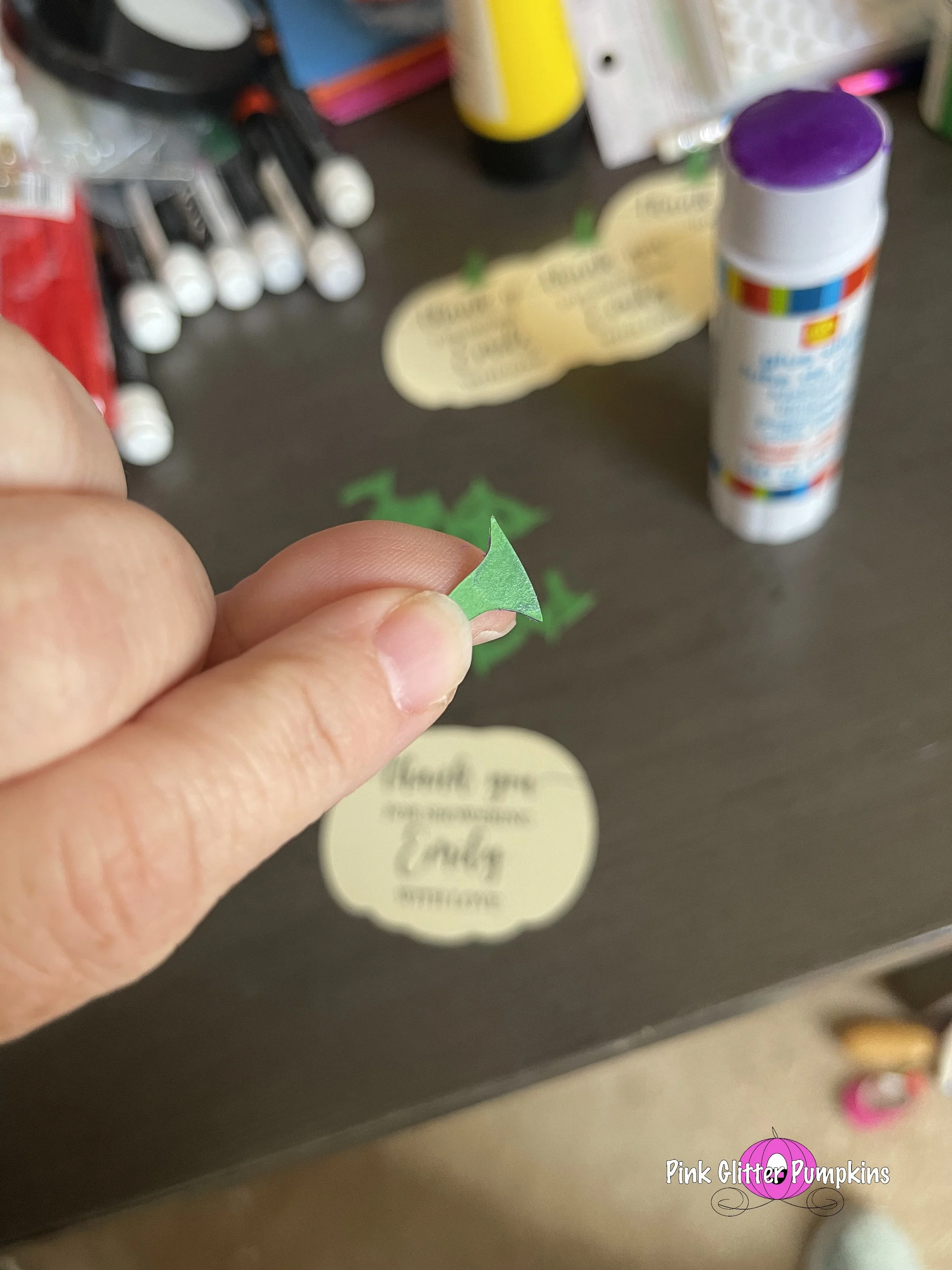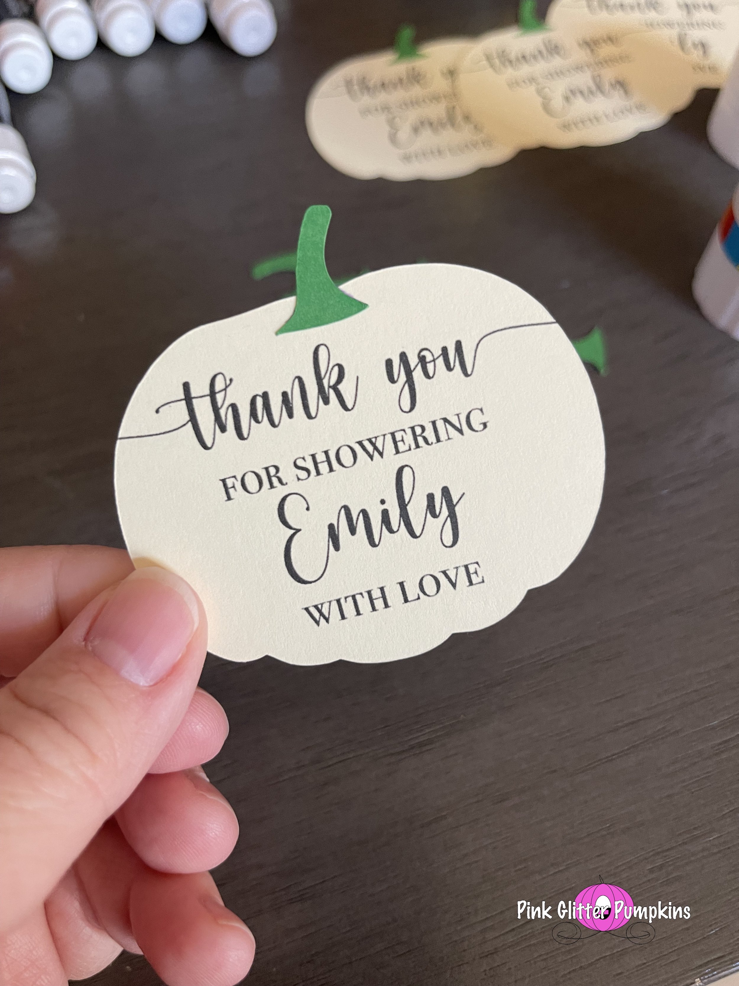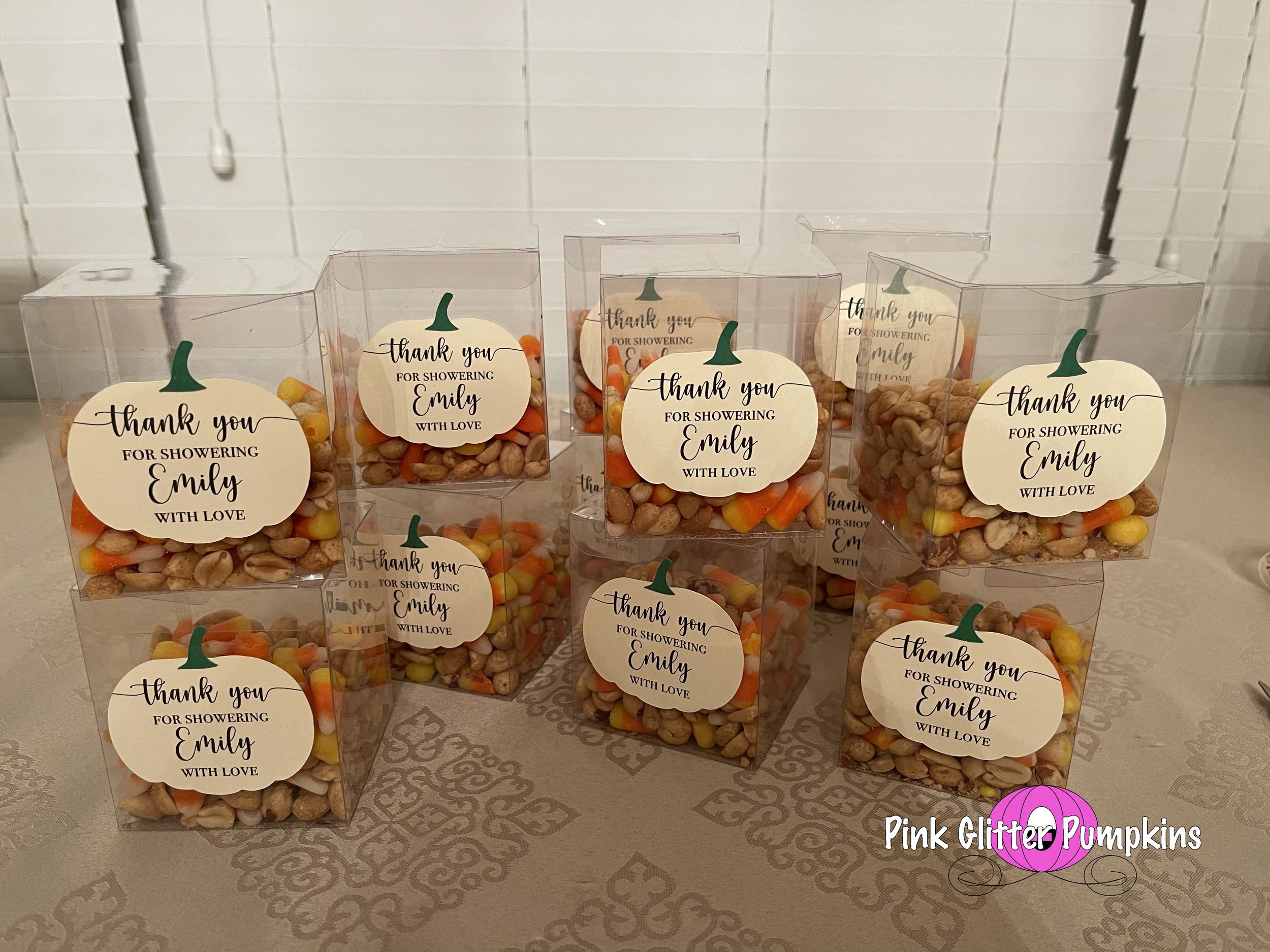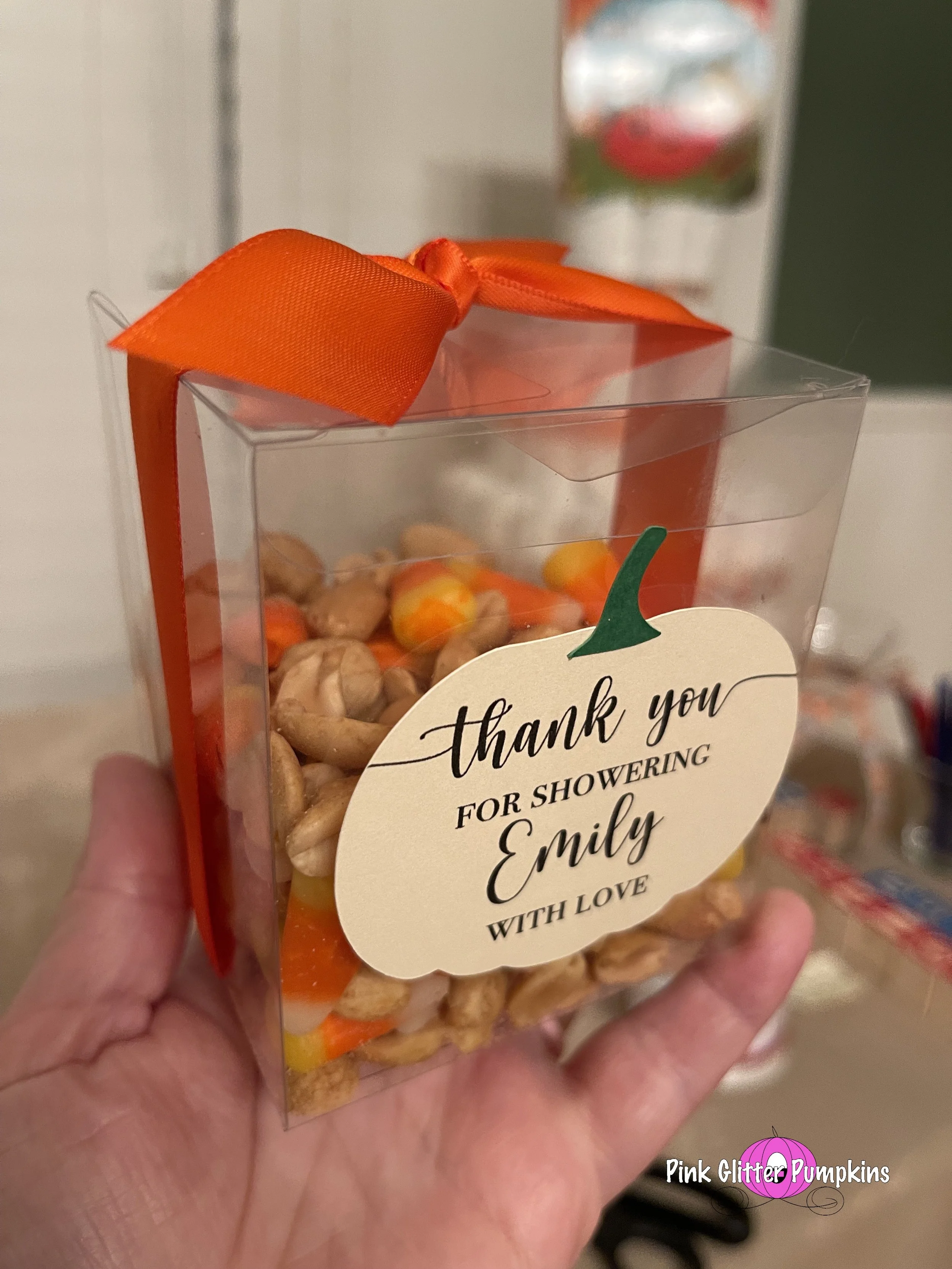 So I bought some plastic favor boxes from Hobby Lobby to put the candy corn/peanut mixture into. I then made a cute pumpkin to put on the outside of the box. I used the same style pumpkin I used for her invitation. I just made it white and added a cute phrase on it “Thank you for showering Emily with love”. I assembled the pumpkin and stem using glue, then I attached the pumpkin to the box with tape. I filled up the boxes with the mixture. Then I secured it with either an orange or pumpkin ribbon.