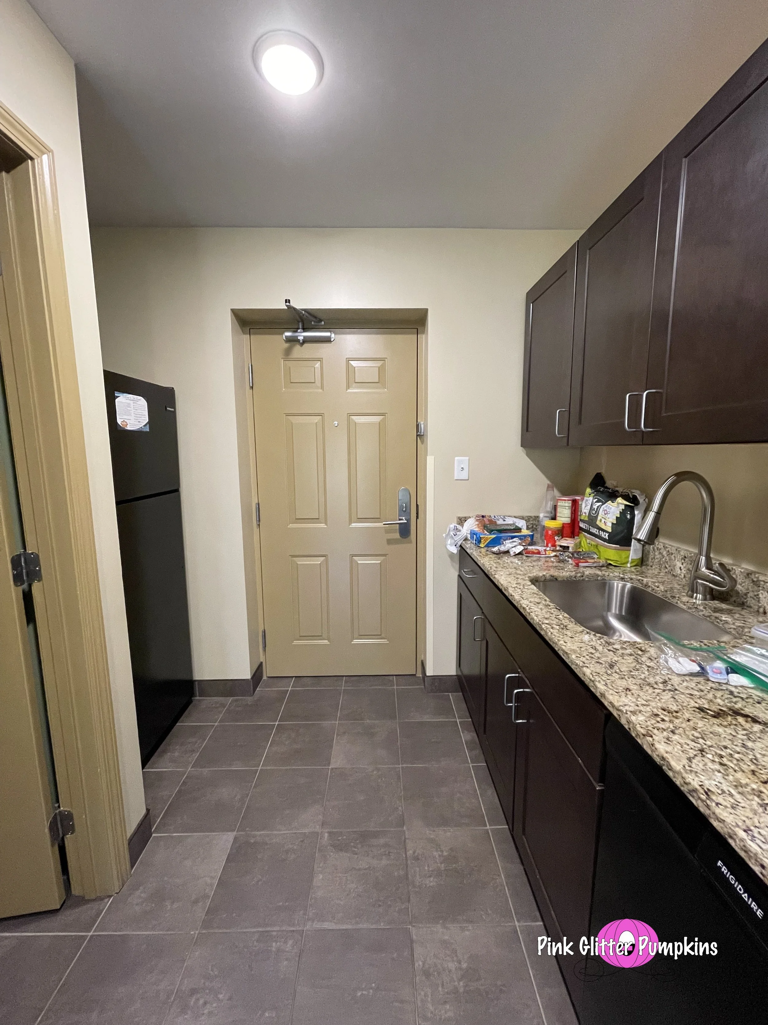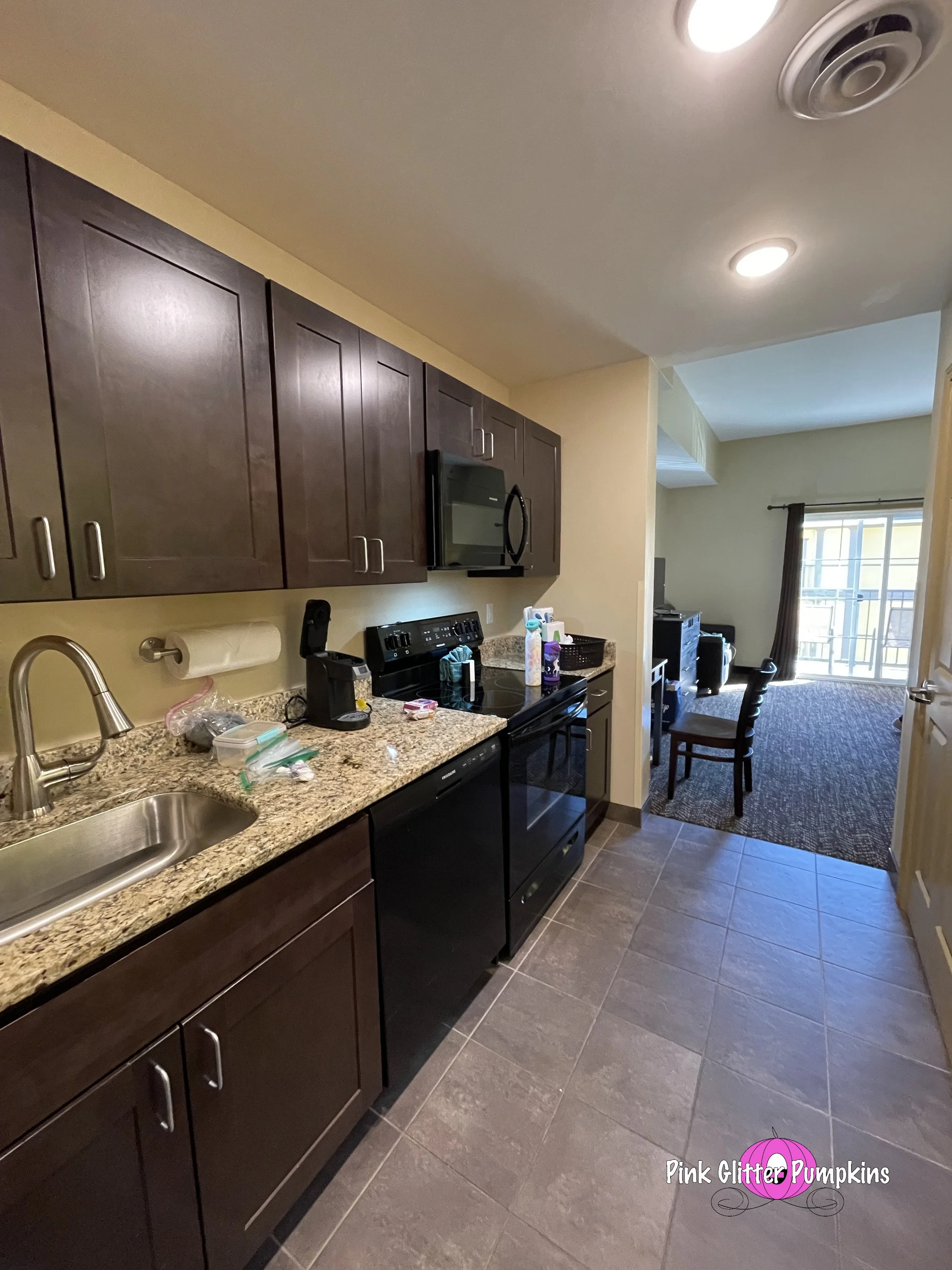 The room itself was very spacious and perfect for us. Honestly, I think it would be great even for a week long trip with Brad too. When you first walk in the room, you enter the kitchen. What is great about this studio is that you still get a full size kitchen instead of just a kitchenette. It does come with some standard amenities, but we had extras from home too. We had a full size fridge, oven, microwave, and dishwasher. They also had plenty of cabinets stocked full of just about anything you would need like plates, cups, silverware, and even things to cook with.