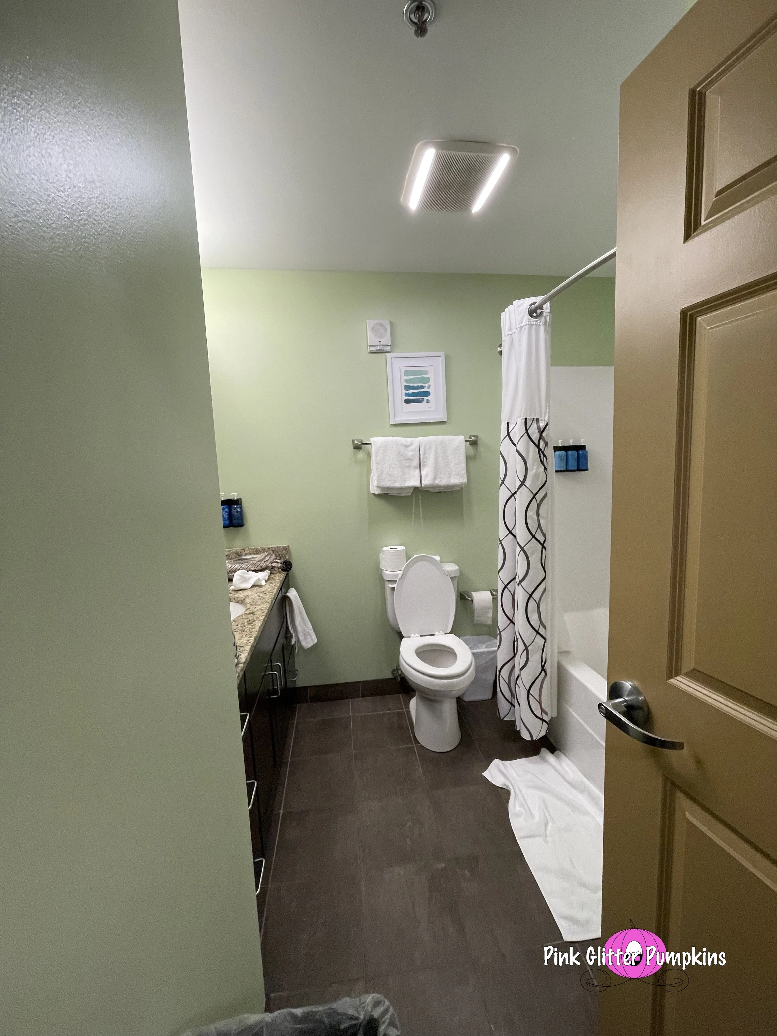 The bathroom is right off of the kitchen. There was just one sink, and it had a bathtub instead of a stand alone shower. But again, this worked just fine for us. We did have plenty of towels and wash clothes for 1-2 nights. But one benefit to this resort is that you did get a tidy-up housekeeping service daily. This isn’t always the norm with condos. Basically they remove trash as well as dirty towels and replace the towels. They don’t do a full housekeeping job, but you can pay for that during your stay if you want/need it.