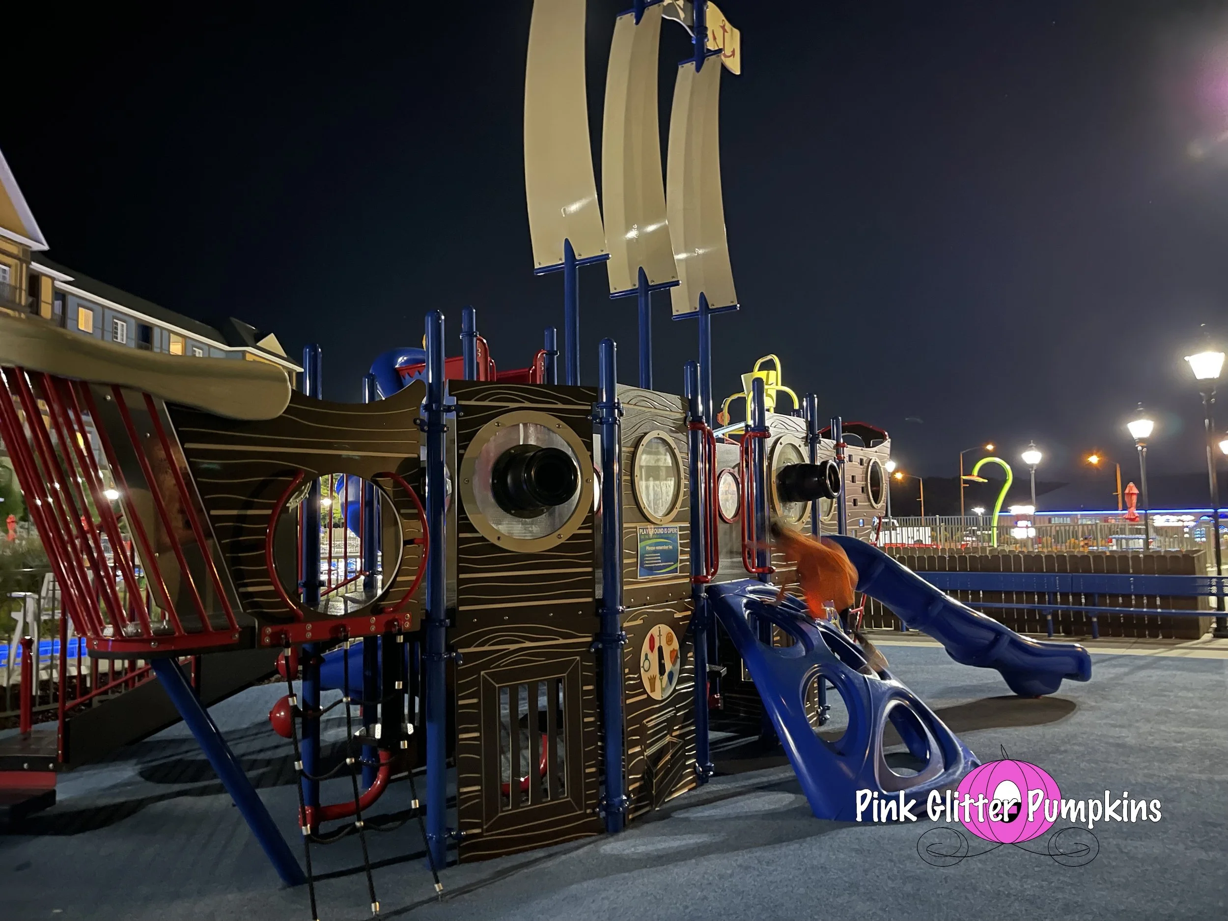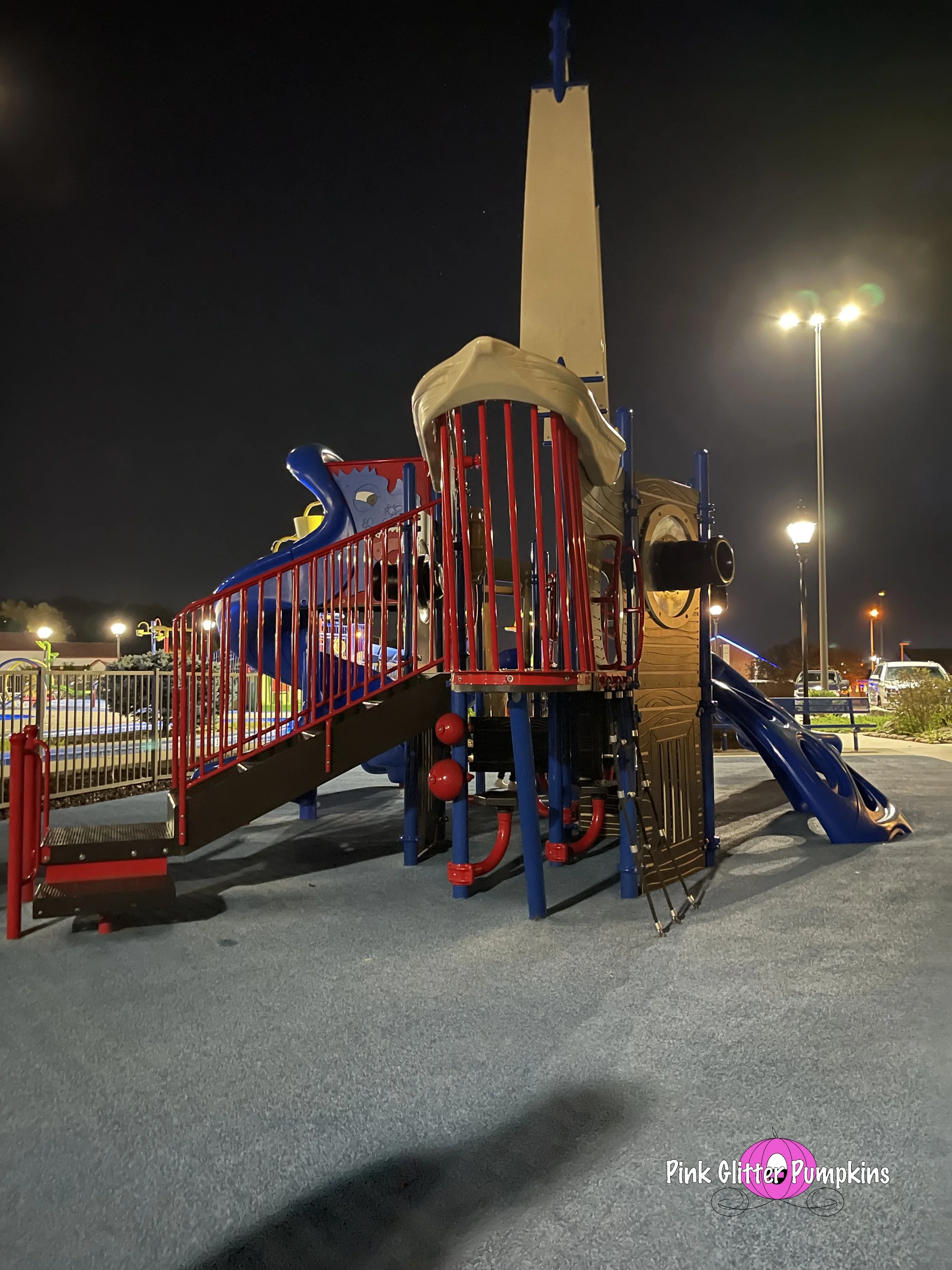And the other playground can be found near the outdoor pool. It is well-lit at night (as you can see in the pictures below). It also looks much newer and is themed as a pirate ship. There was plenty of seating around it, and instead of mulch, it is a rubberish material. We spent most of our playground time here.