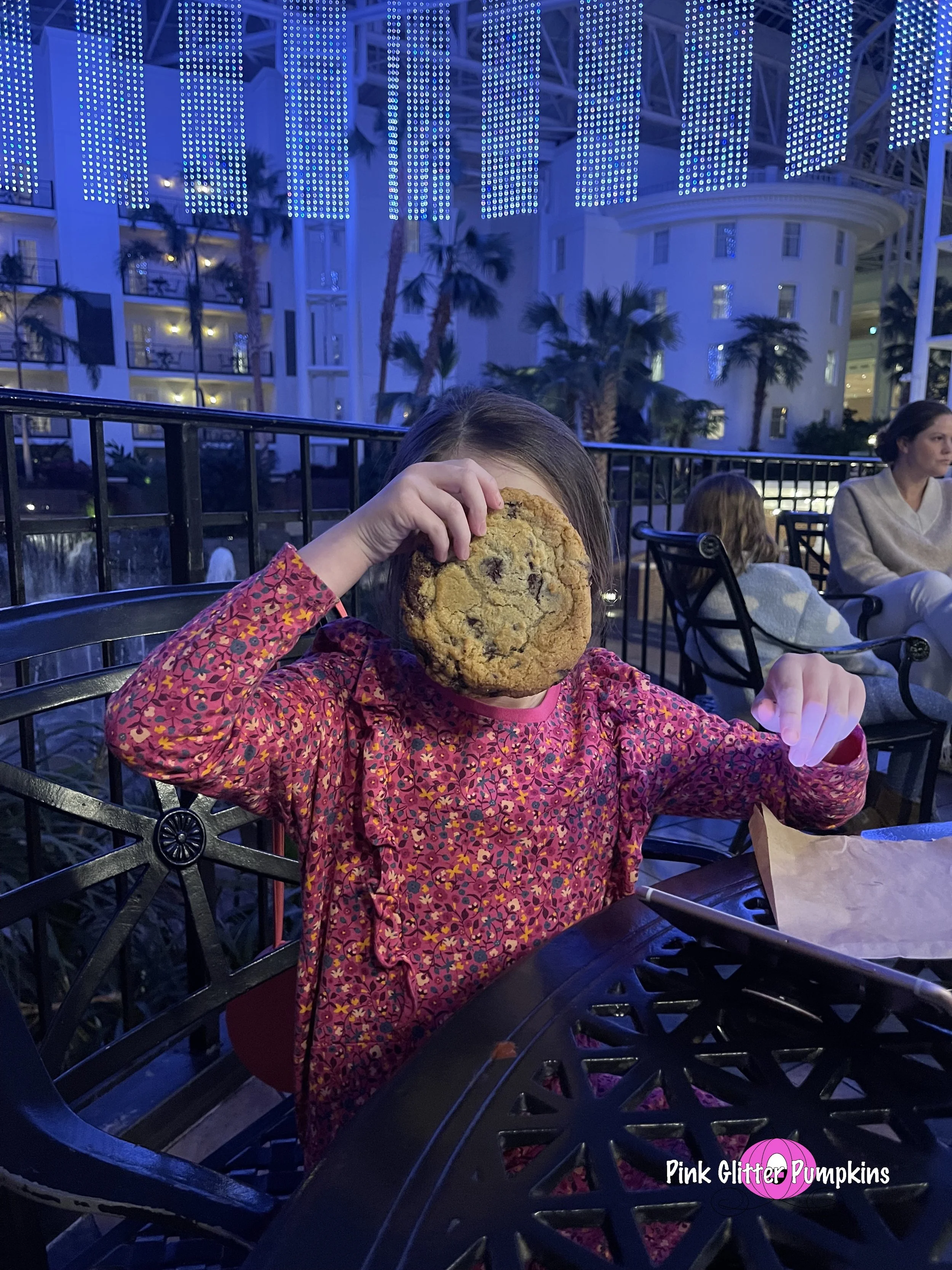 After dinner, we spent the evening walking around and exploring. We watched the fountain shows again. This time Melody brought a phone and recorded parts of it. We also took some pictures since they still had some Christmas decor still up. And we had dessert. Melody picked a cookie the size of her head!