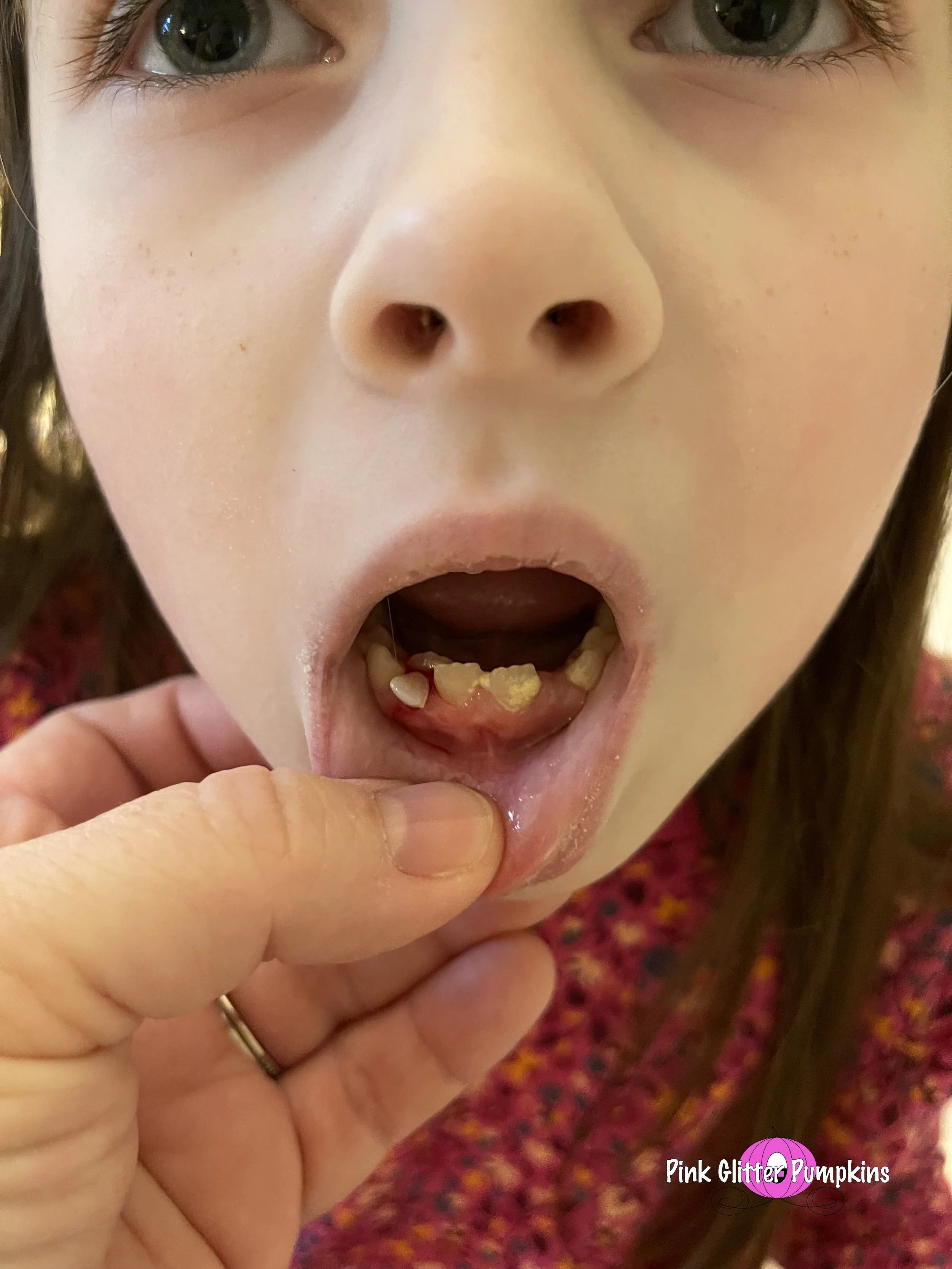 The next morning we had a fun surpriseβ¦Melodyβs tooth was barely hanging on! Loose teeth always cause a panic for her. She is so afraid of swallowing it and hates dealing with all the blood from it.