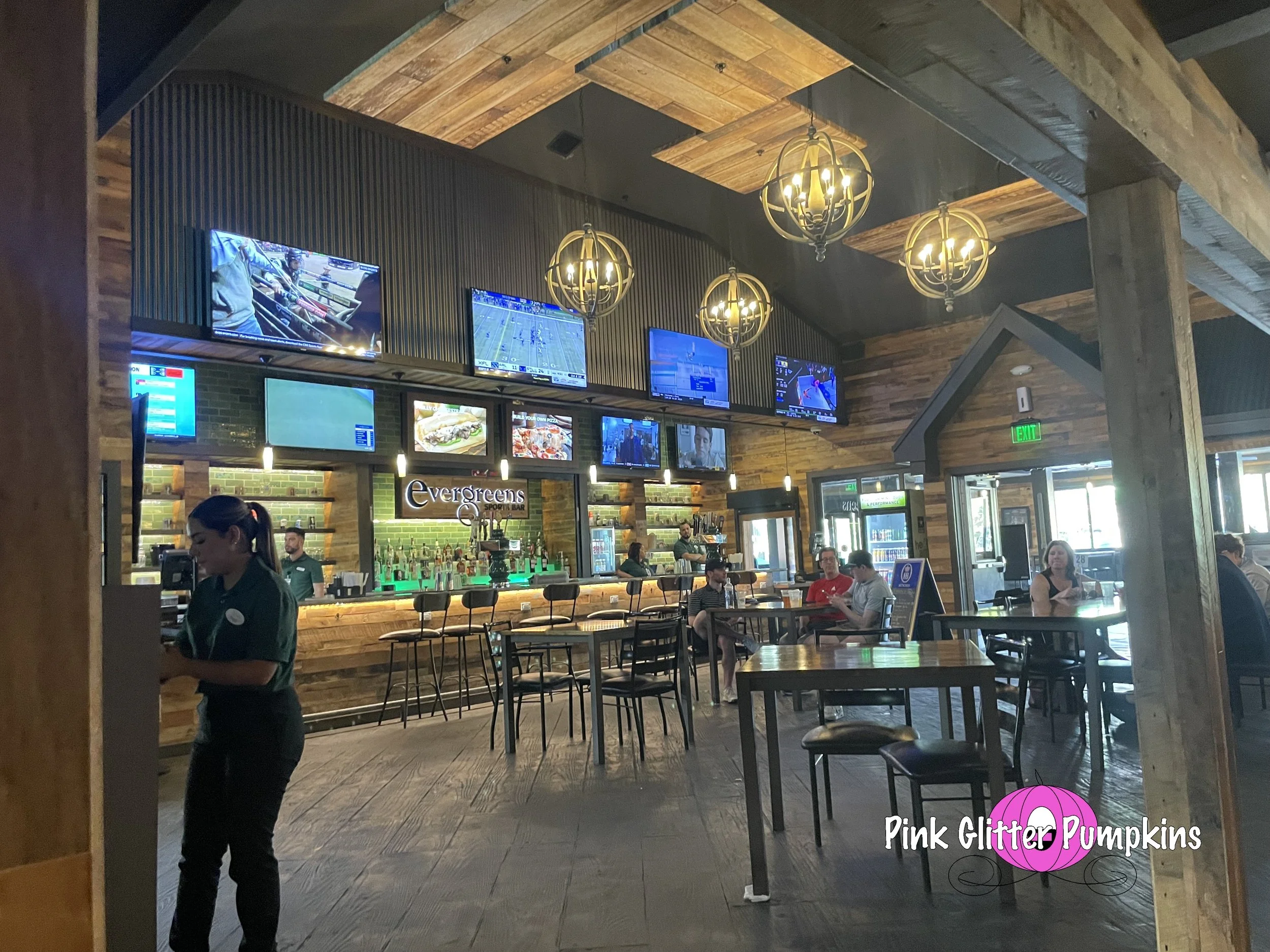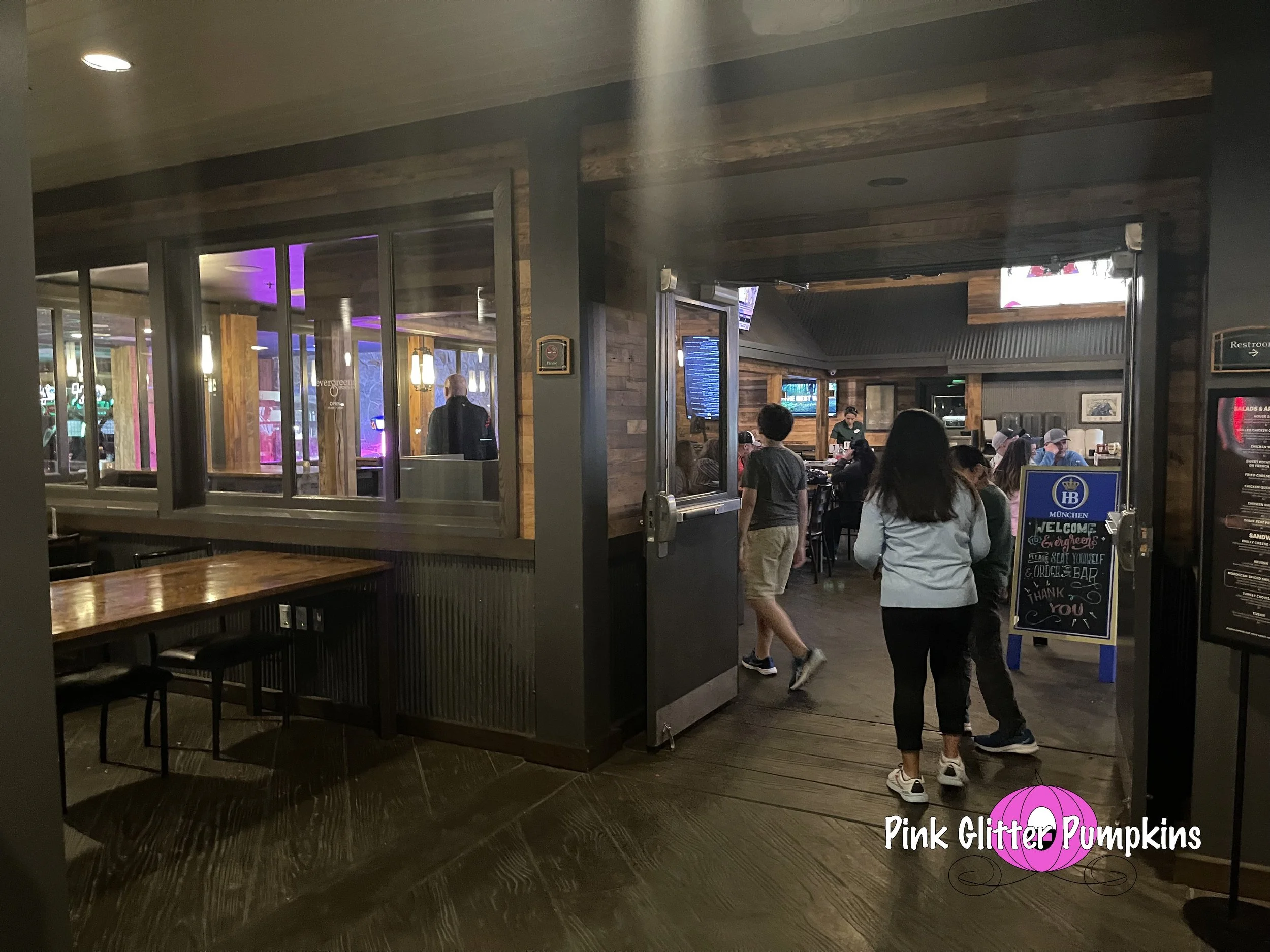 There can be some confusion when you first go inside as to where to go. On the map it looks as if the entire building is Evergreens, but that is not the case. When you first walk in you have like a “lobby” with seats and restrooms. You also can access the arcade in here as well. As far as the restaurant you have two options - you can order from the takeout window in the lobby, or you can go inside and order from the bar and have a seat. That is the key here too, you seat yourself after ordering at the bar, but it feels like more of a sit down restaurant. There is plenty of seating both inside and outside of the restaurant, and they deliver the food to your table.