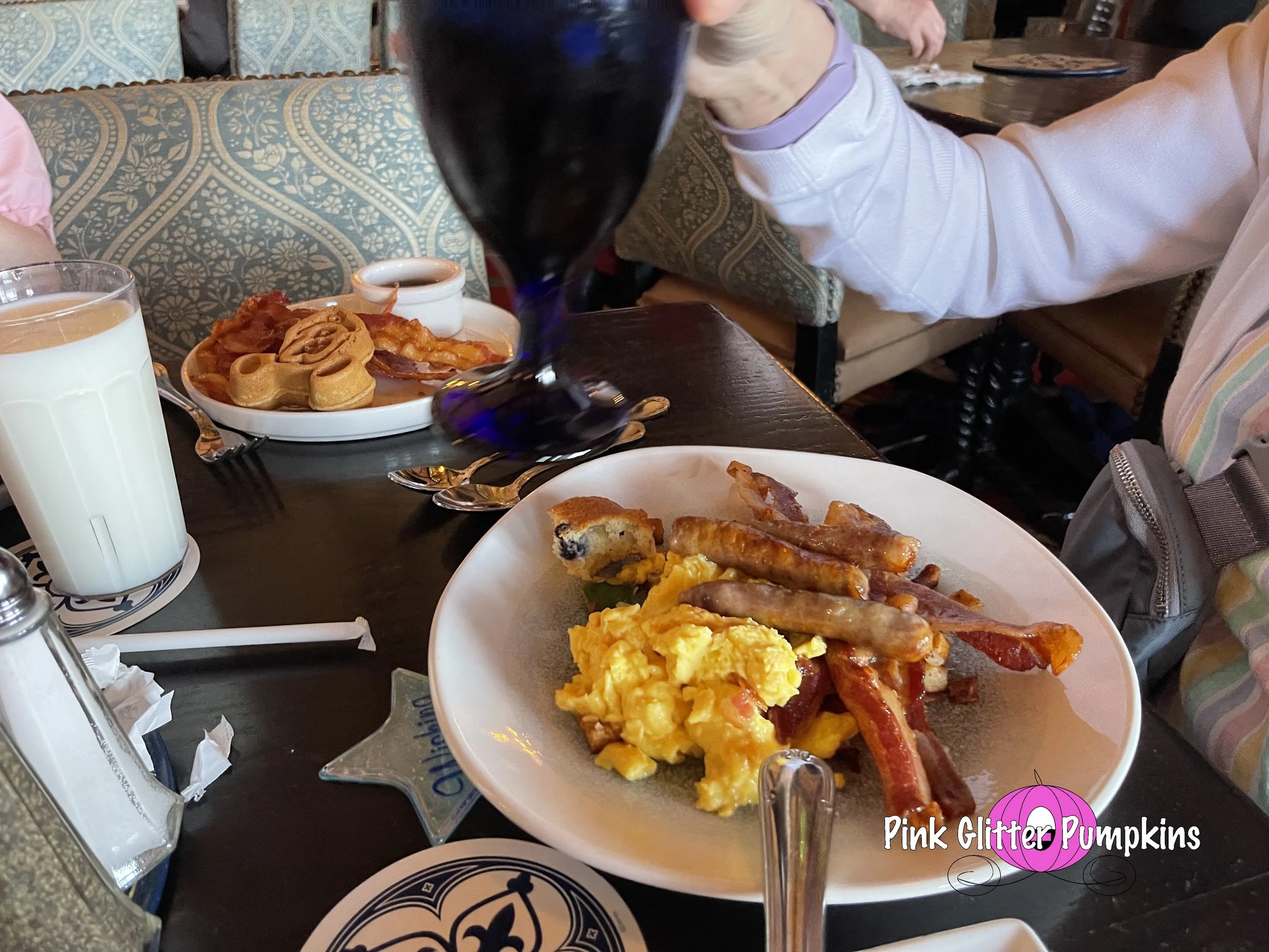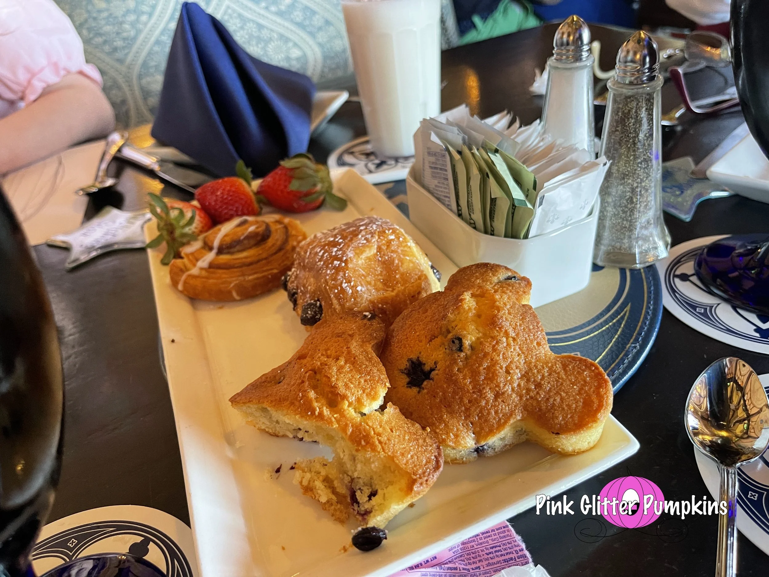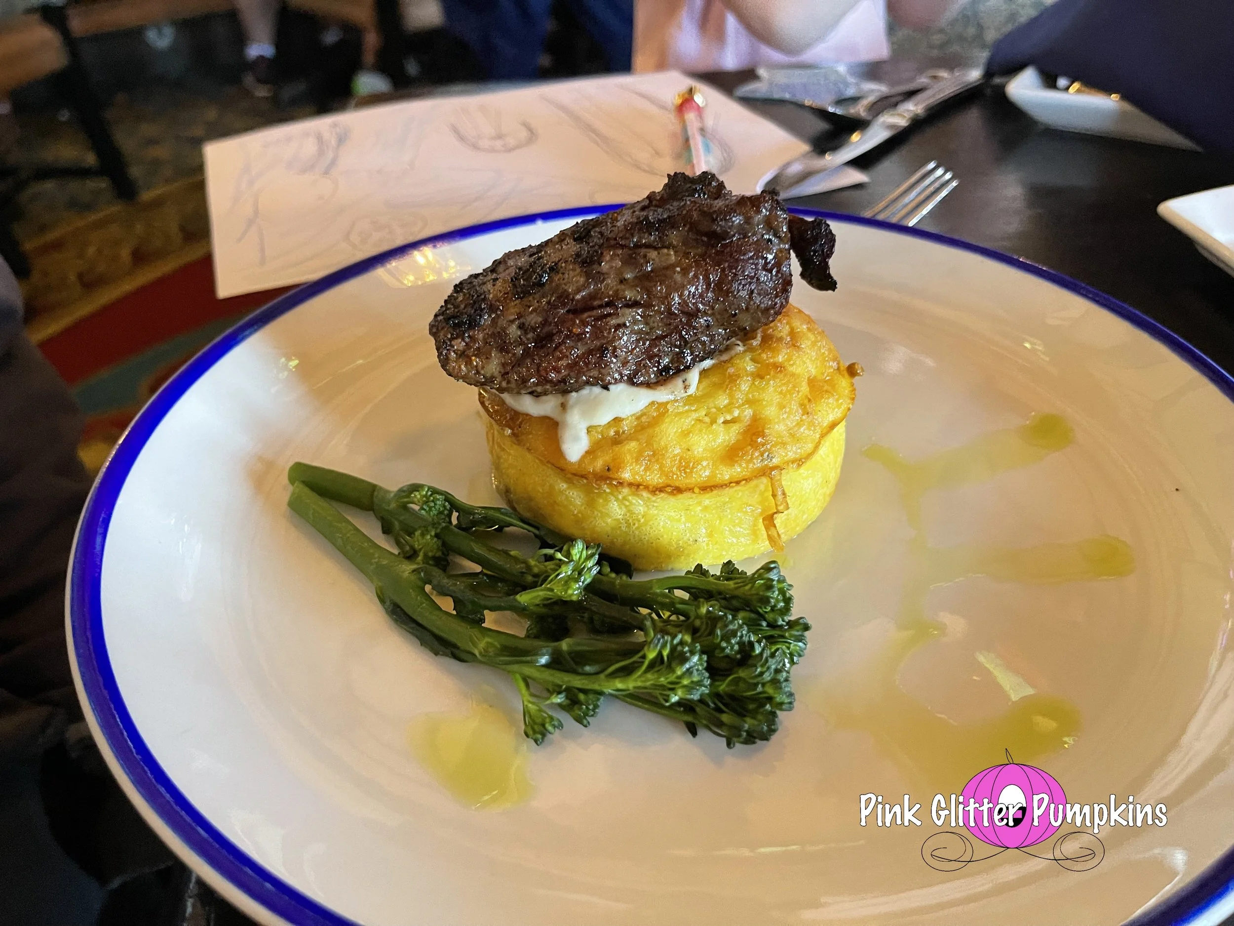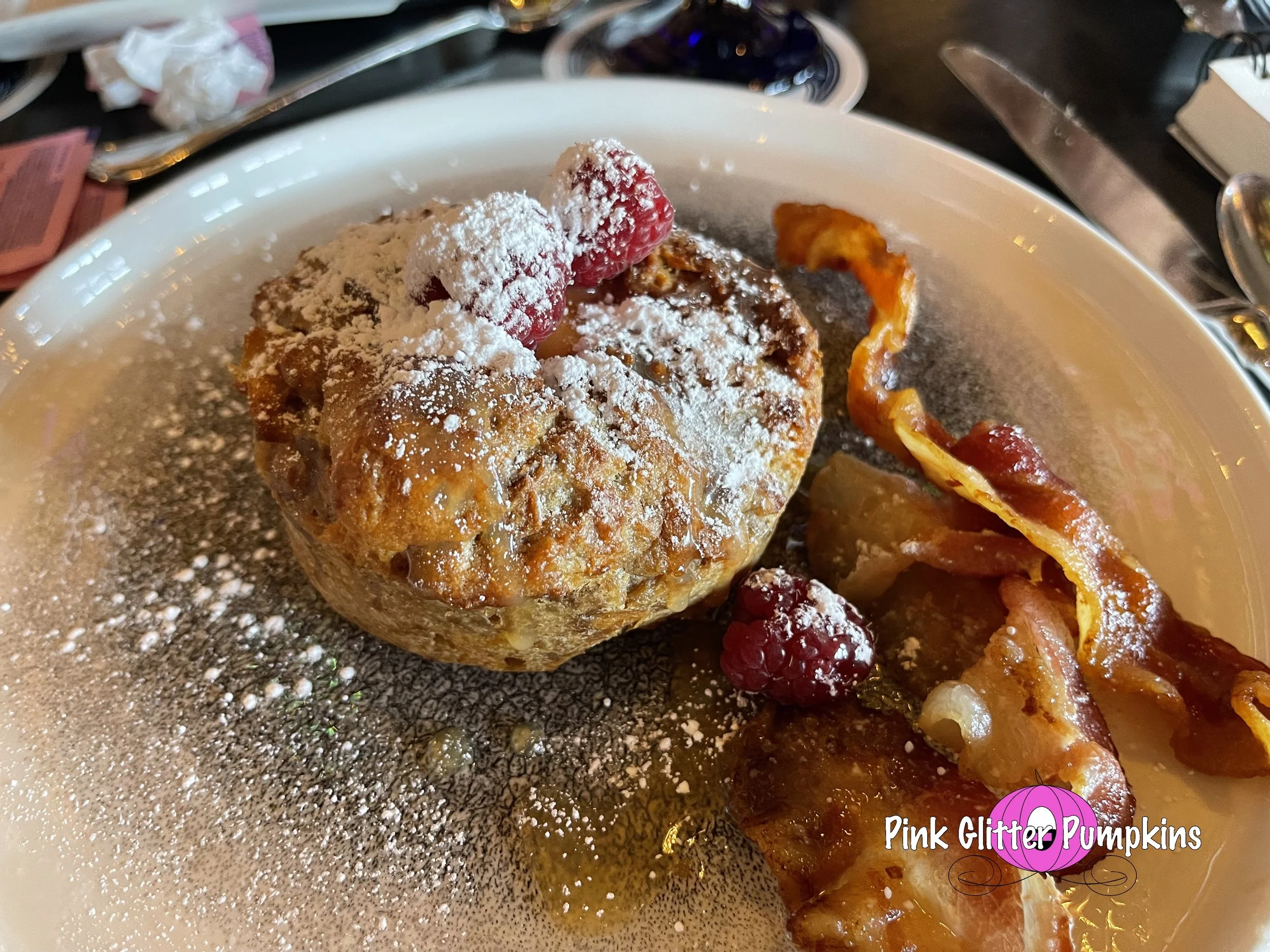 I thought the food was pretty good. As soon as we sat down, we were given menus and ordered as soon as they brought us our drinks. Once we ordered, we were also brought pastries. All of the pastries were really good. My favorite was the Mickey blueberry muffin. I got the French toast, Brad got the steak and eggs, and Vicki got the traditional breakfast. All of our food was delicious, but I honestly am not sure it was worth the price tag. Melody just got the kids bacon and Mickey waffles.